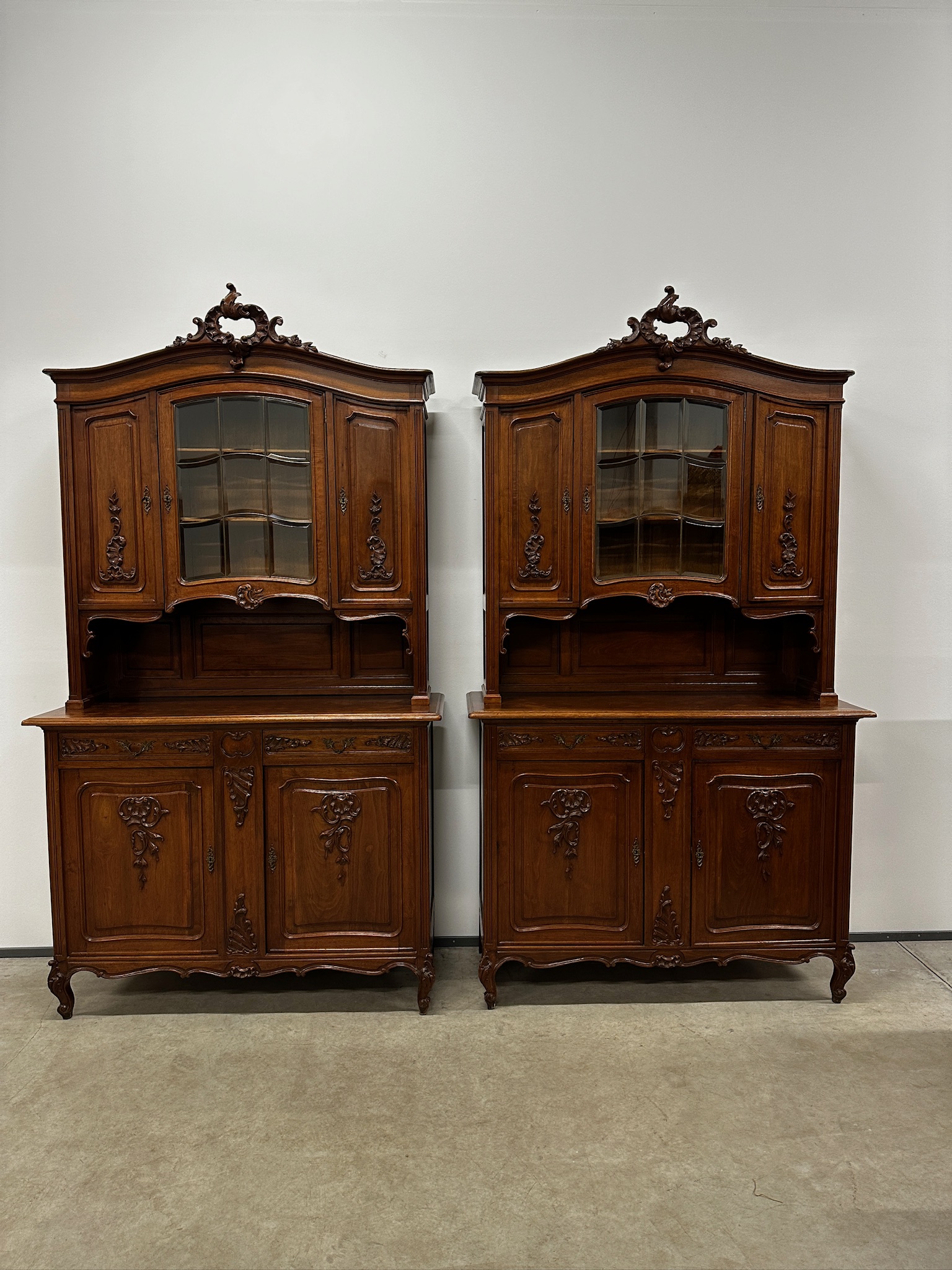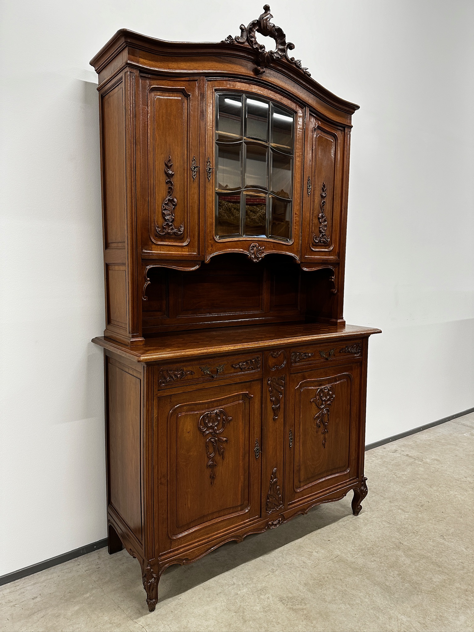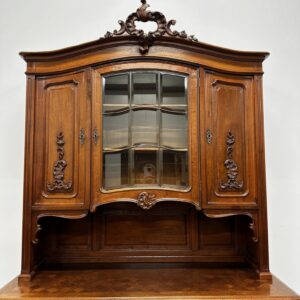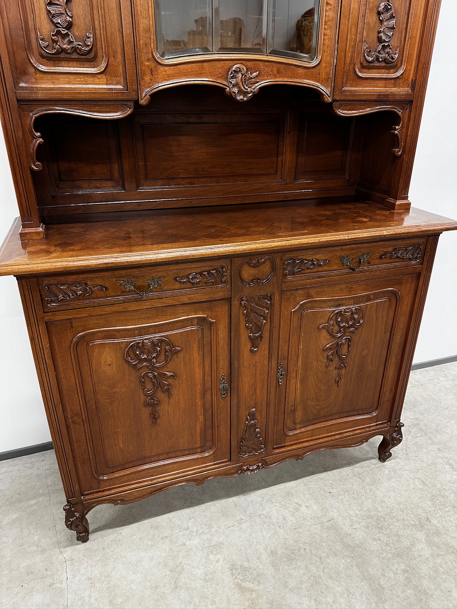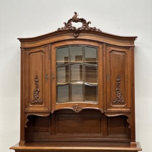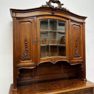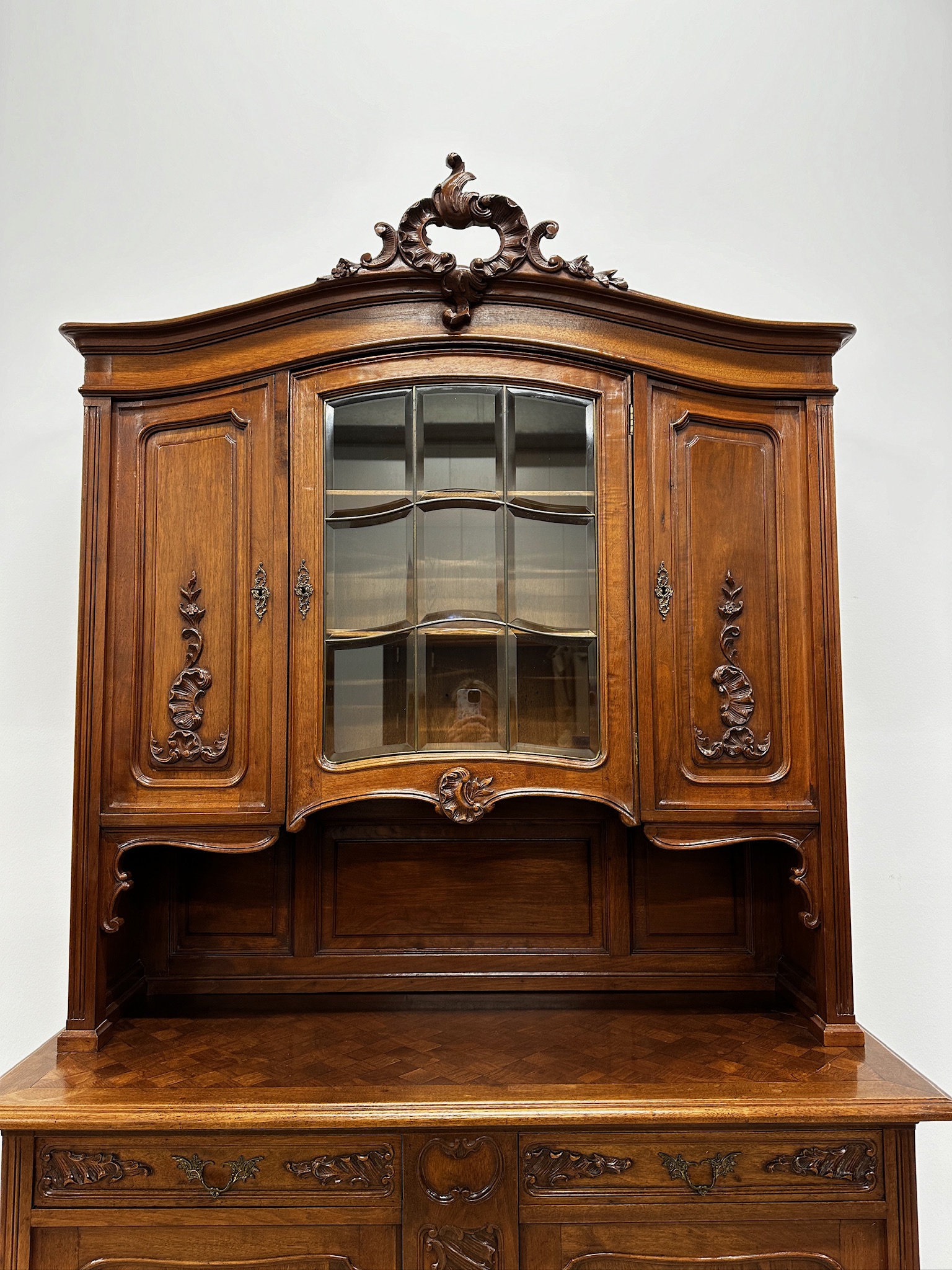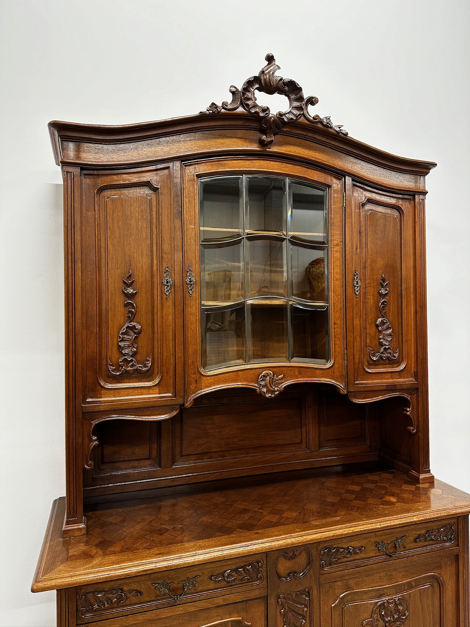 Tõeliselt kauni vormiga sajandivanune puhvetkapp. Uhked nikerdused ustel ja raamil. Klaasid faasitud servadega. Alumise kapi pealmine plaat kaunistatud parkettspooniga. Olemas kaks ühesugust puhvetkappi. Lukud töökorras, võtmed olemas.