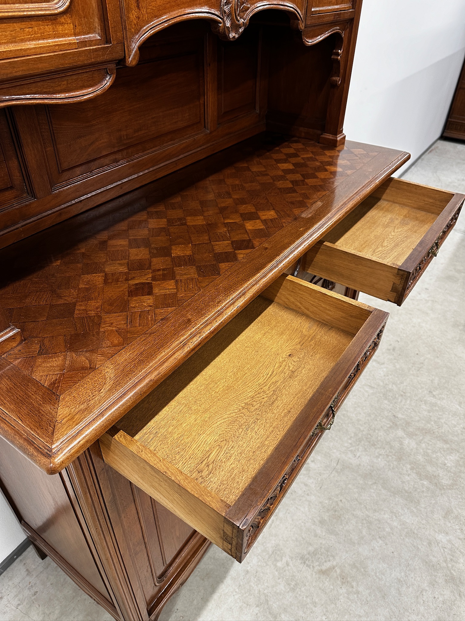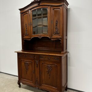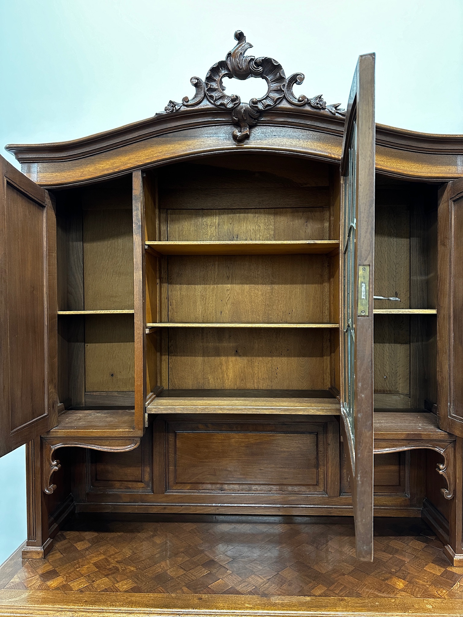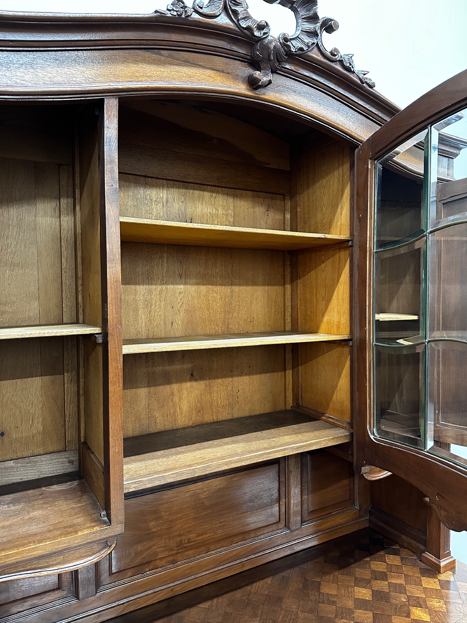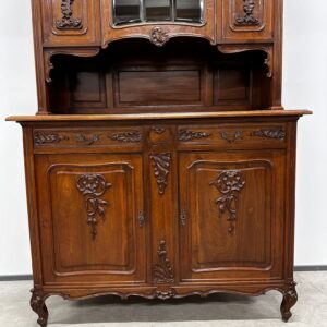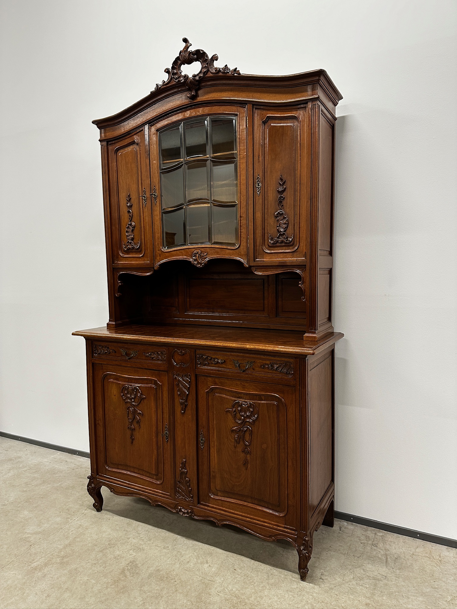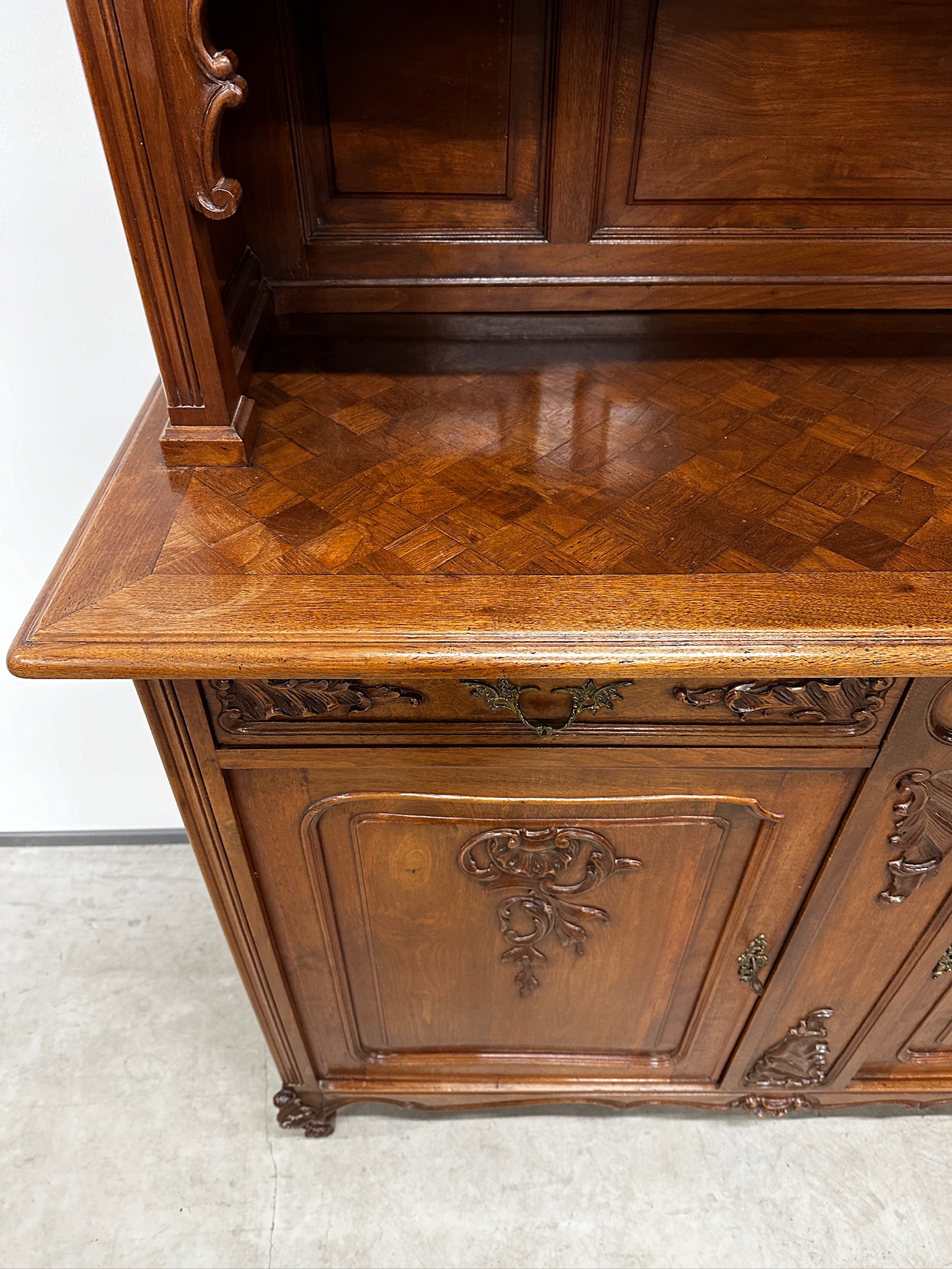 Tõeliselt kauni vormiga sajandivanune puhvetkapp. Uhked nikerdused ustel ja raamil. Klaasid faasitud servadega. Alumise kapi pealmine plaat kaunistatud parkettspooniga. Olemas kaks ühesugust puhvetkappi. Lukud töökorras, võtmed olemas.