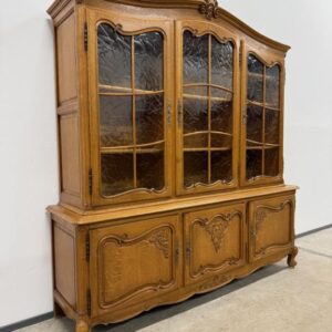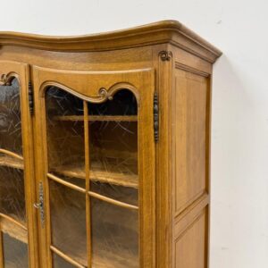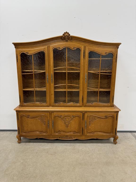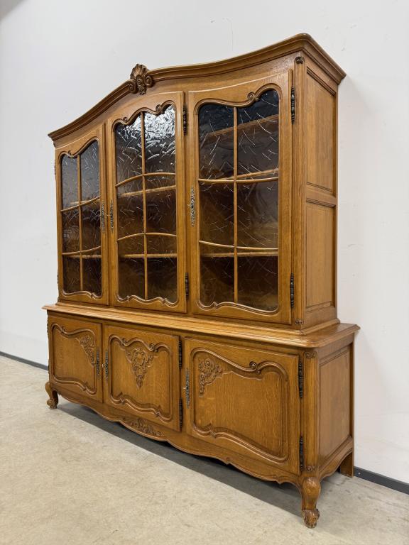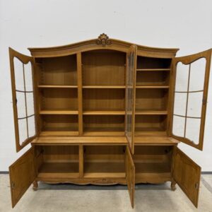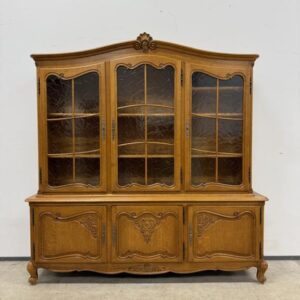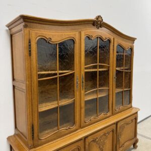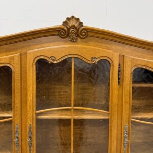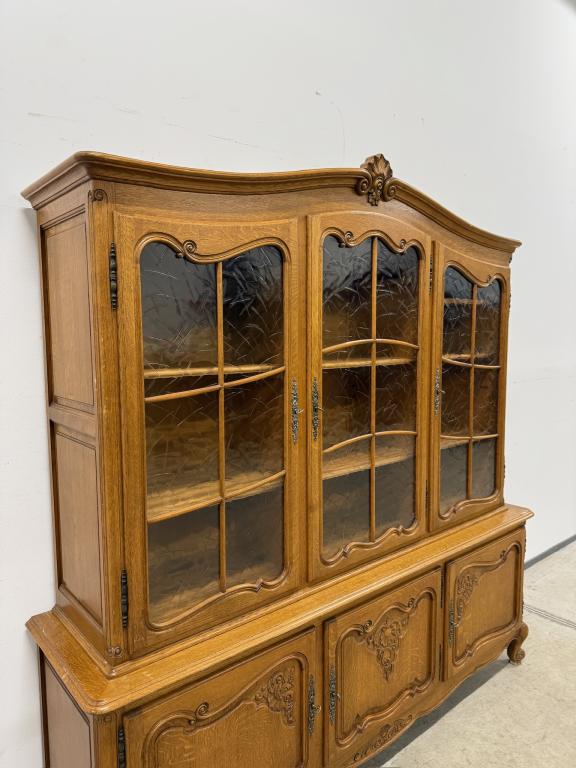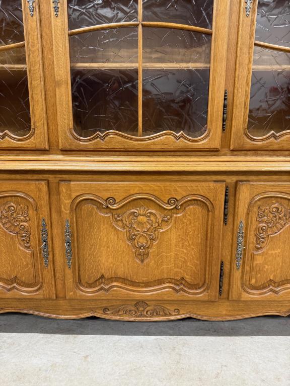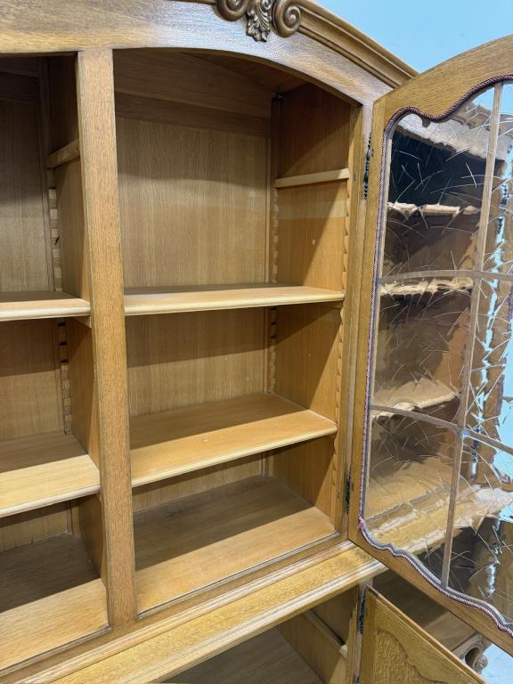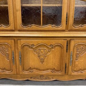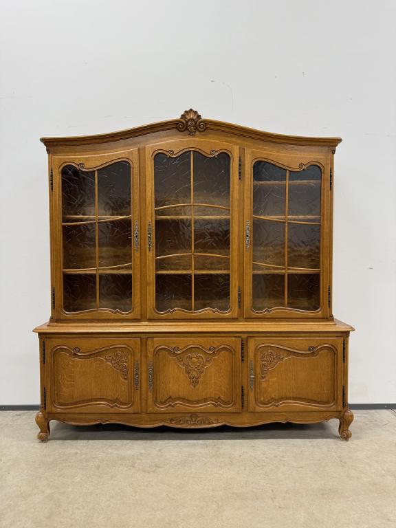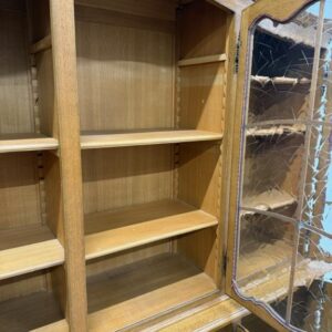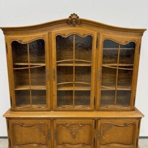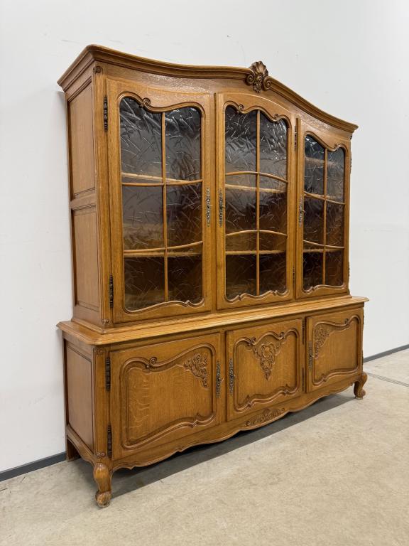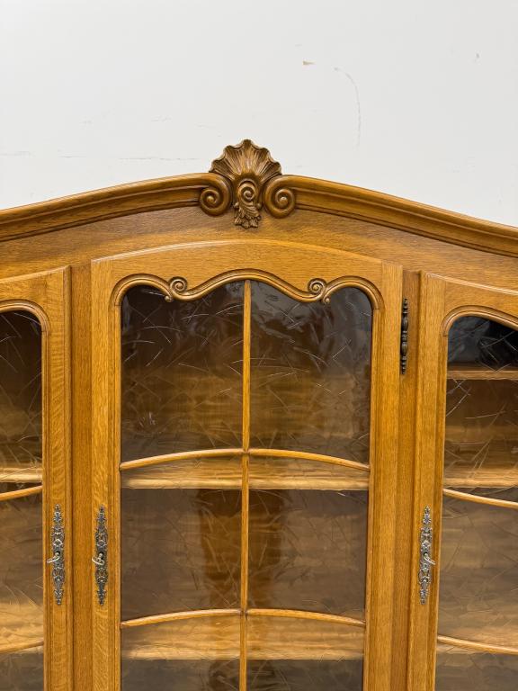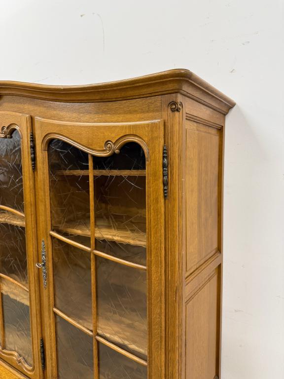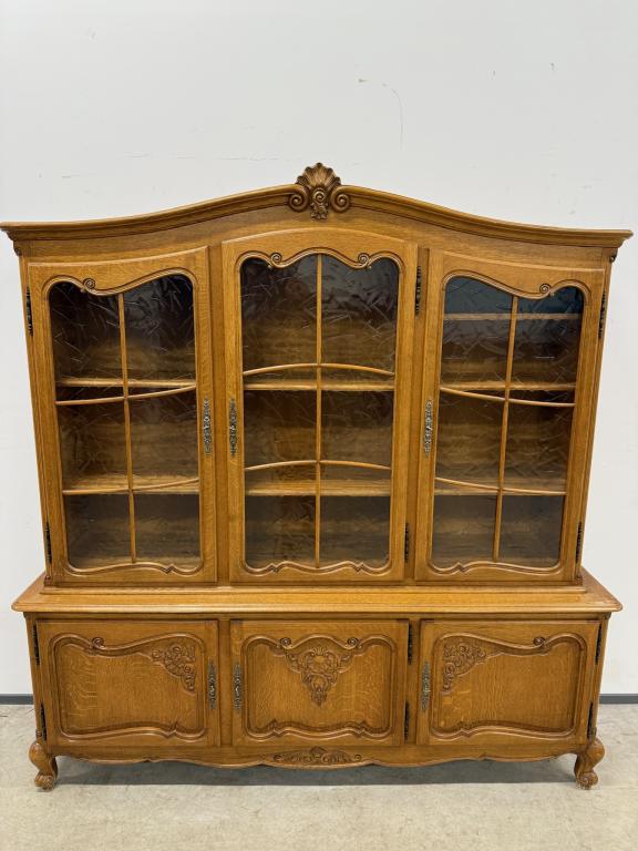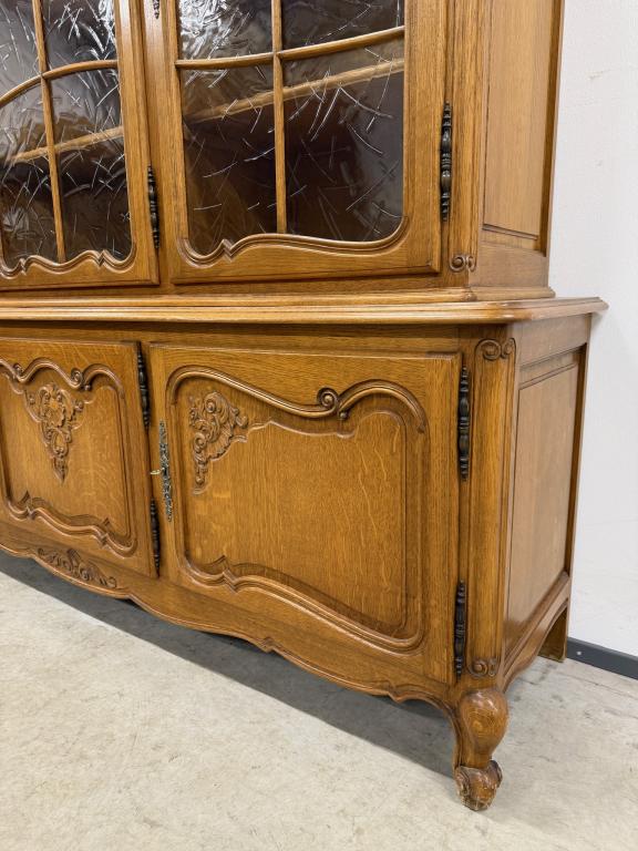 Ilusate nikerdustega tammest raamiga raamatukapp. Kena ja äärmiselt mahukas. Riiulid reguleeritavate vahedega. Uksed lukustatavad, võtmed olemas. NB! Tegelikkuses olemas ka alumise kapi riiulid! Transport kahes osas.