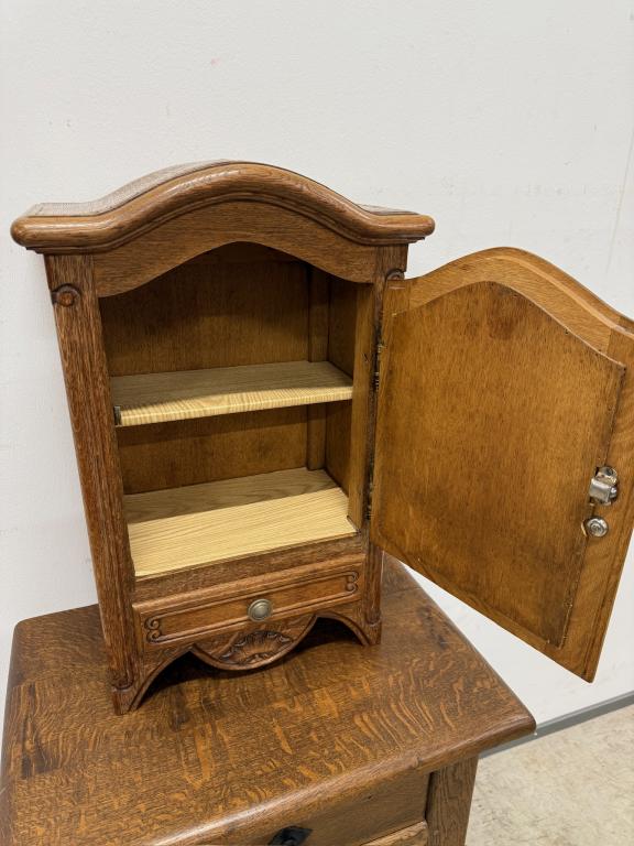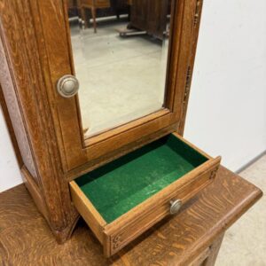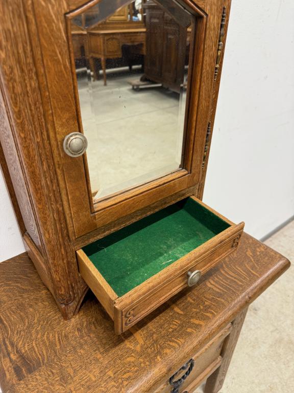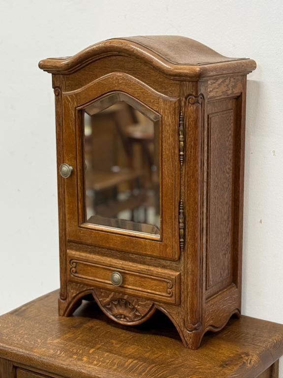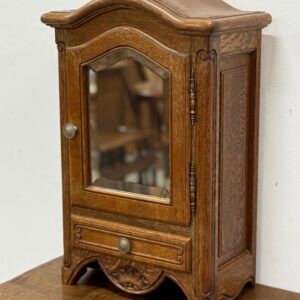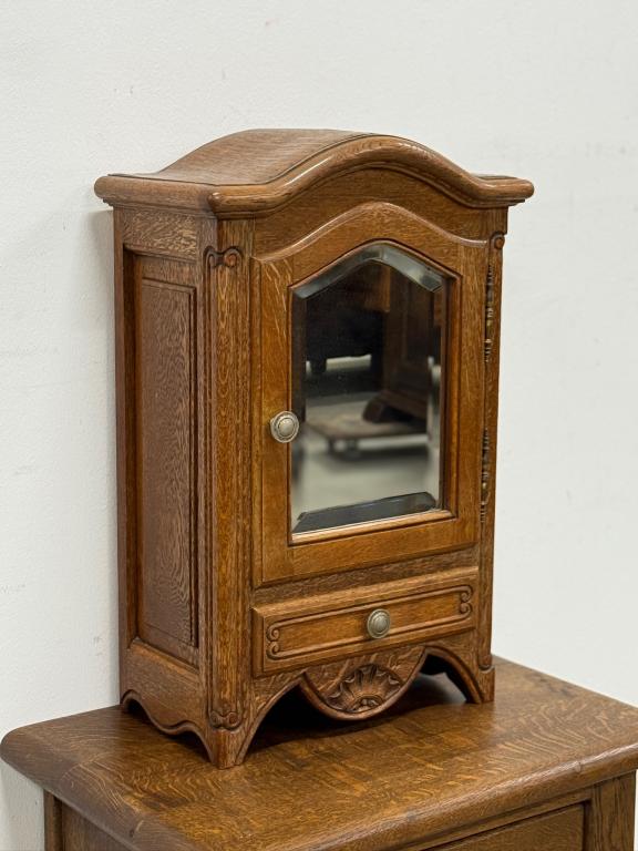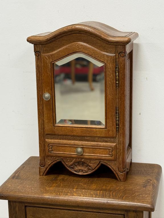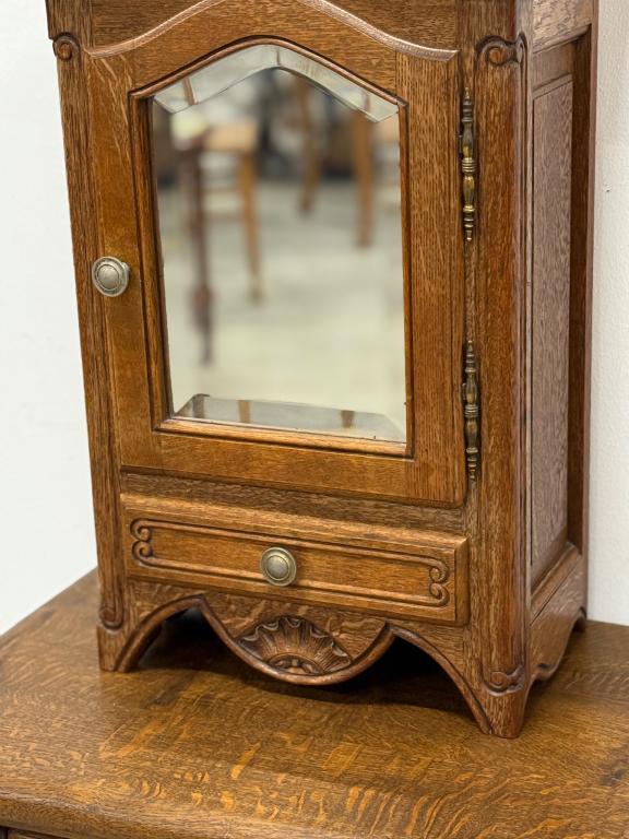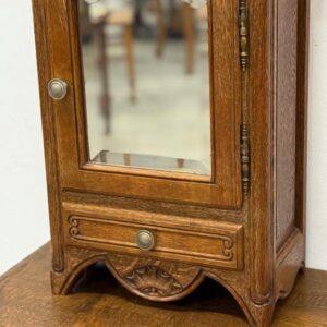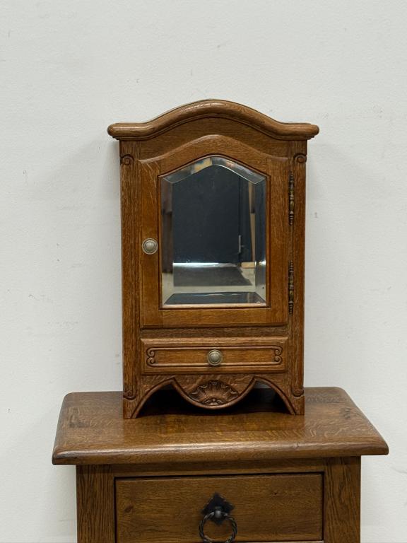 Tammest raamiga, faasitud servaga peegliga ravimikapp. All väike sahtel, sees riiul. Leidub väiksemaid kulumis- ja kasutusjälgi, kuid üldmulje korralik.