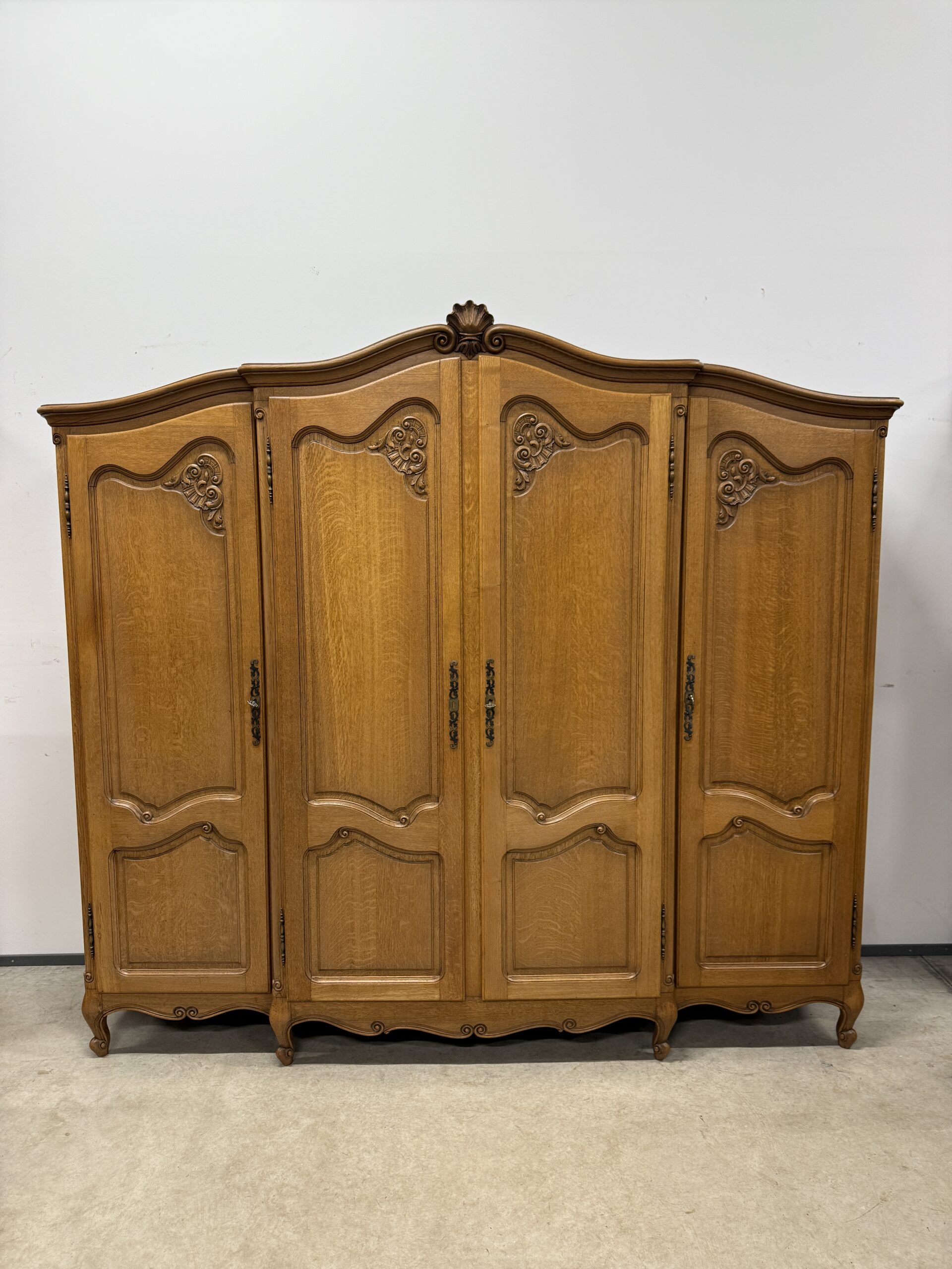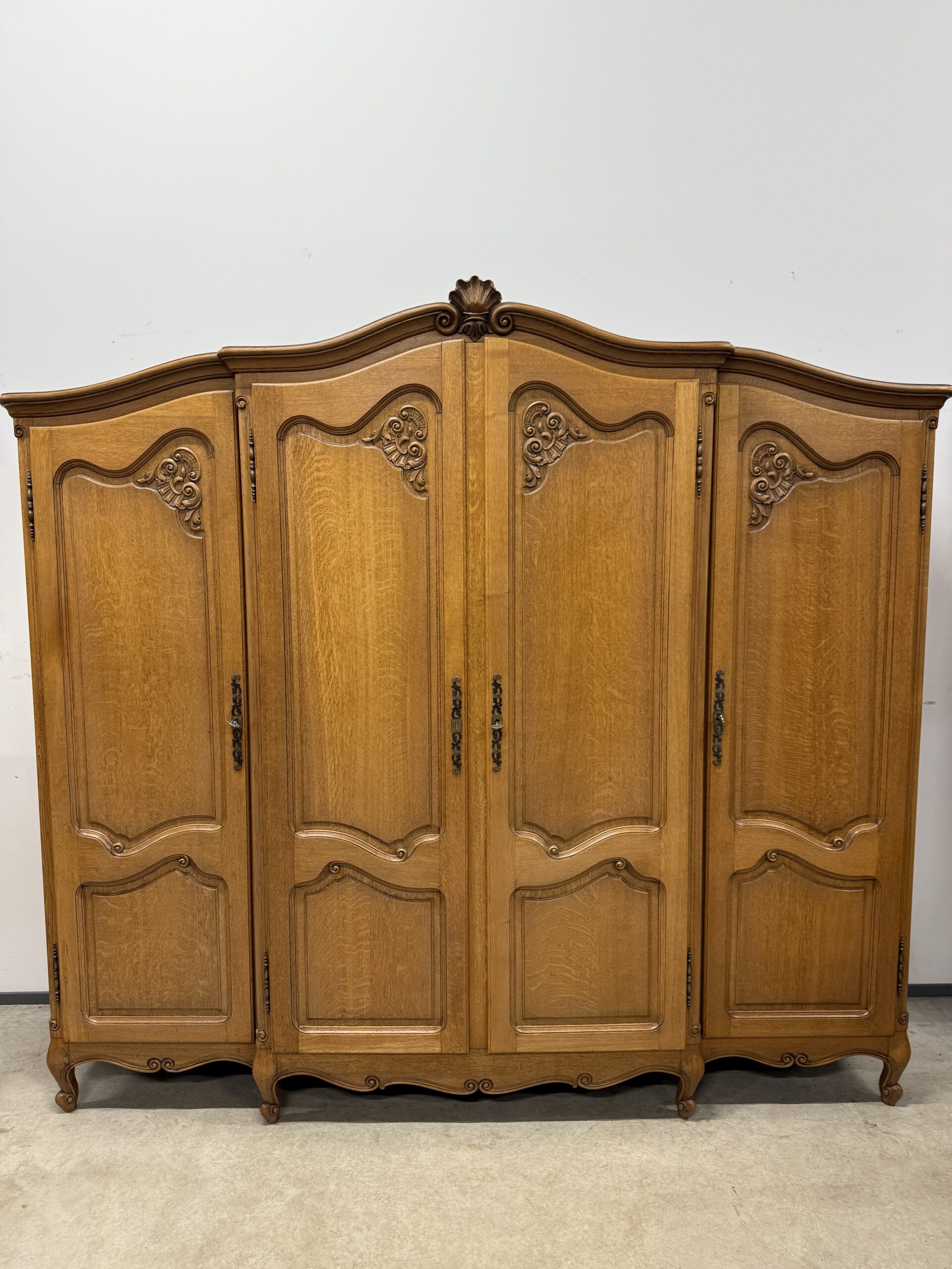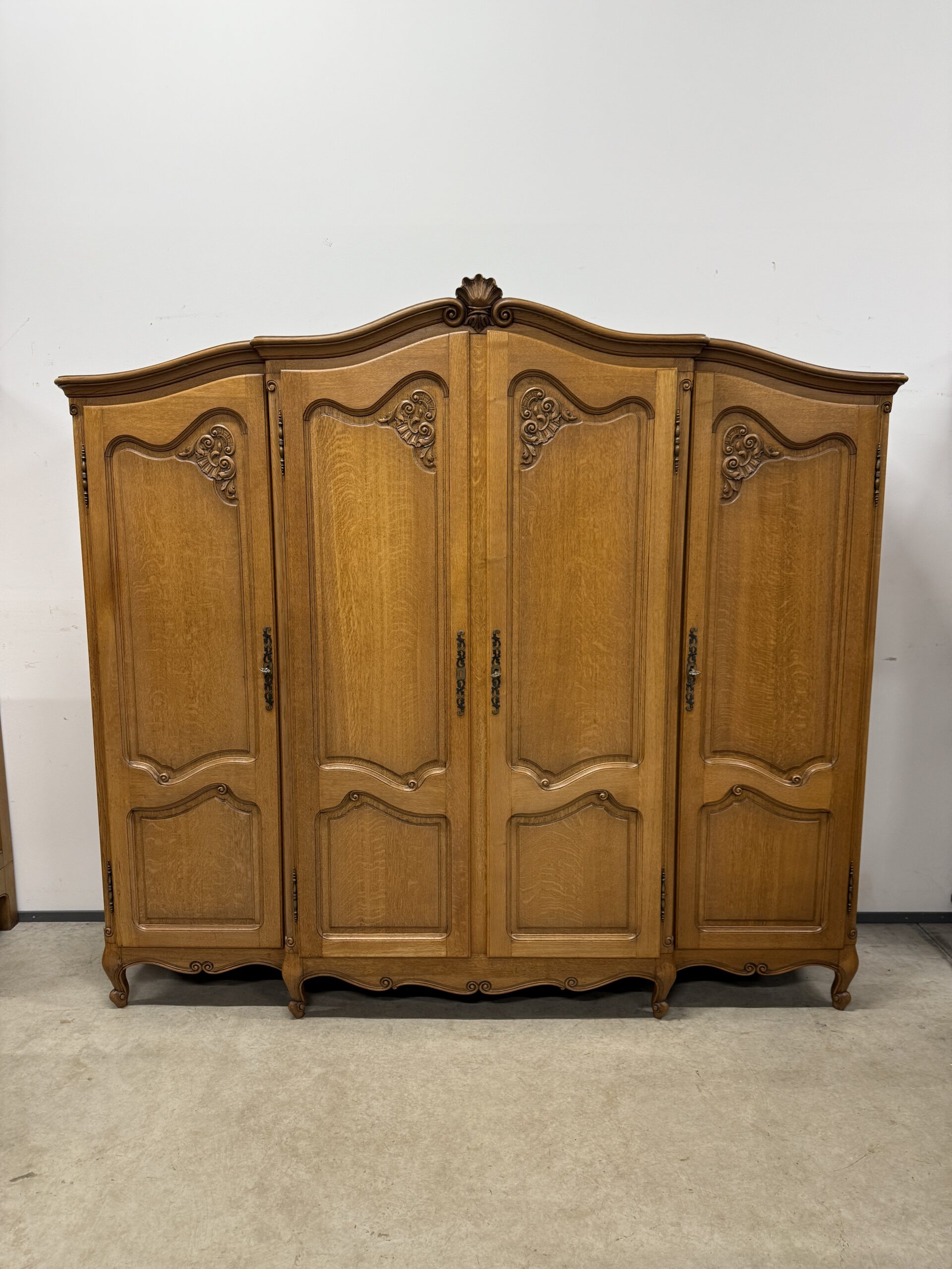 Ilusate nikerdustega suur ja mahukas tammest raamiga riidekapp. Parempoolse ukse taga riiulid, teiste uste taga riputuspuu. Kapp on väga heas seisukorras. Lukud töökorras, vòtmed olemas. Transport osadena.
