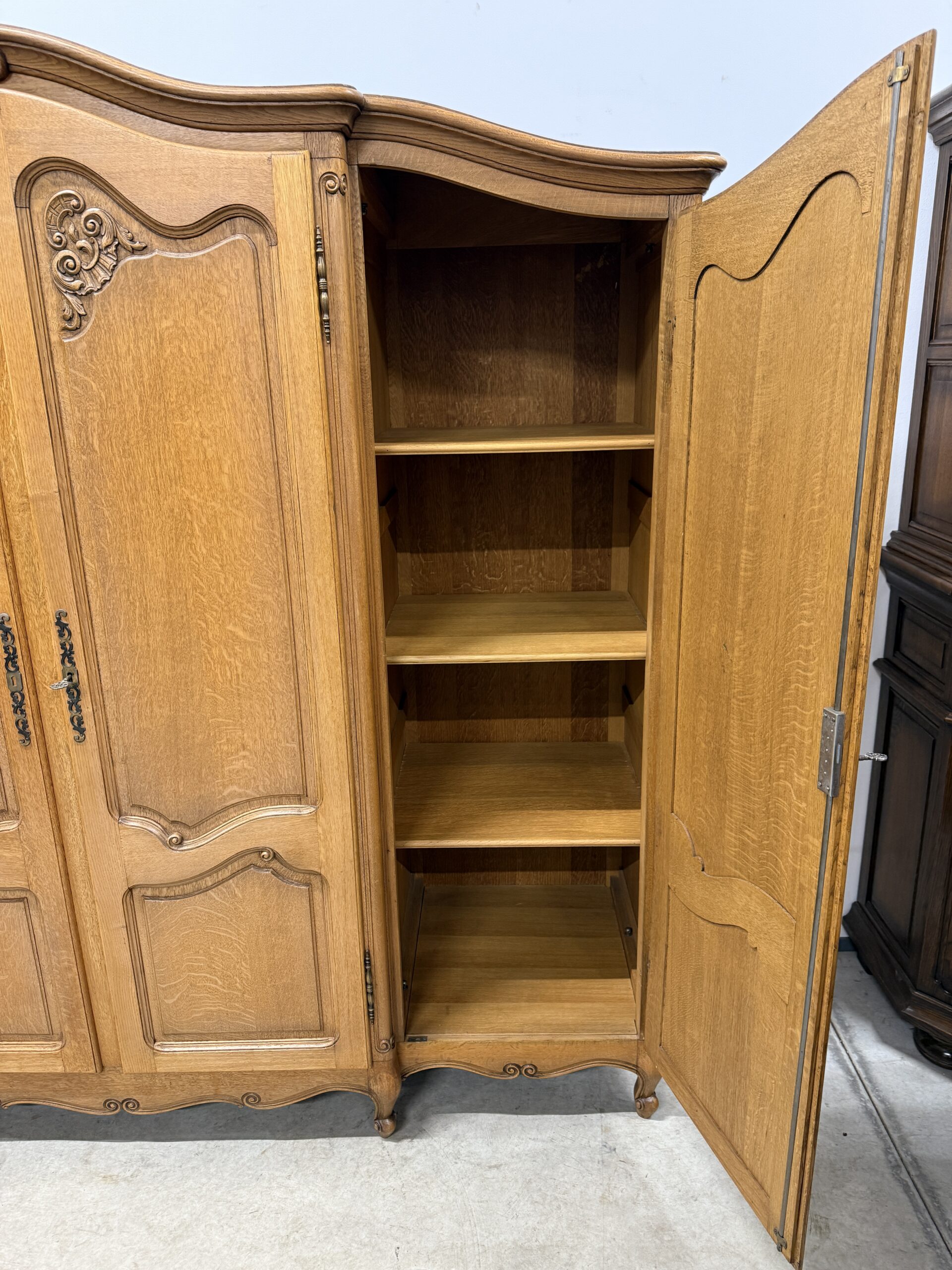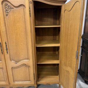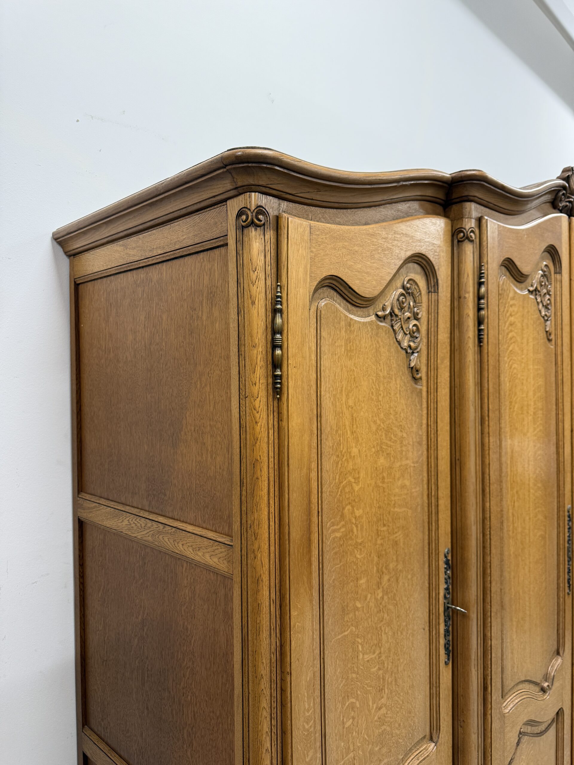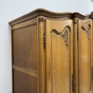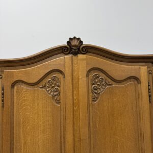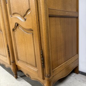 Ilusate nikerdustega suur ja mahukas tammest raamiga riidekapp. Parempoolse ukse taga riiulid, teiste uste taga riputuspuu. Kapp on väga heas seisukorras. Lukud töökorras, vòtmed olemas. Transport osadena.