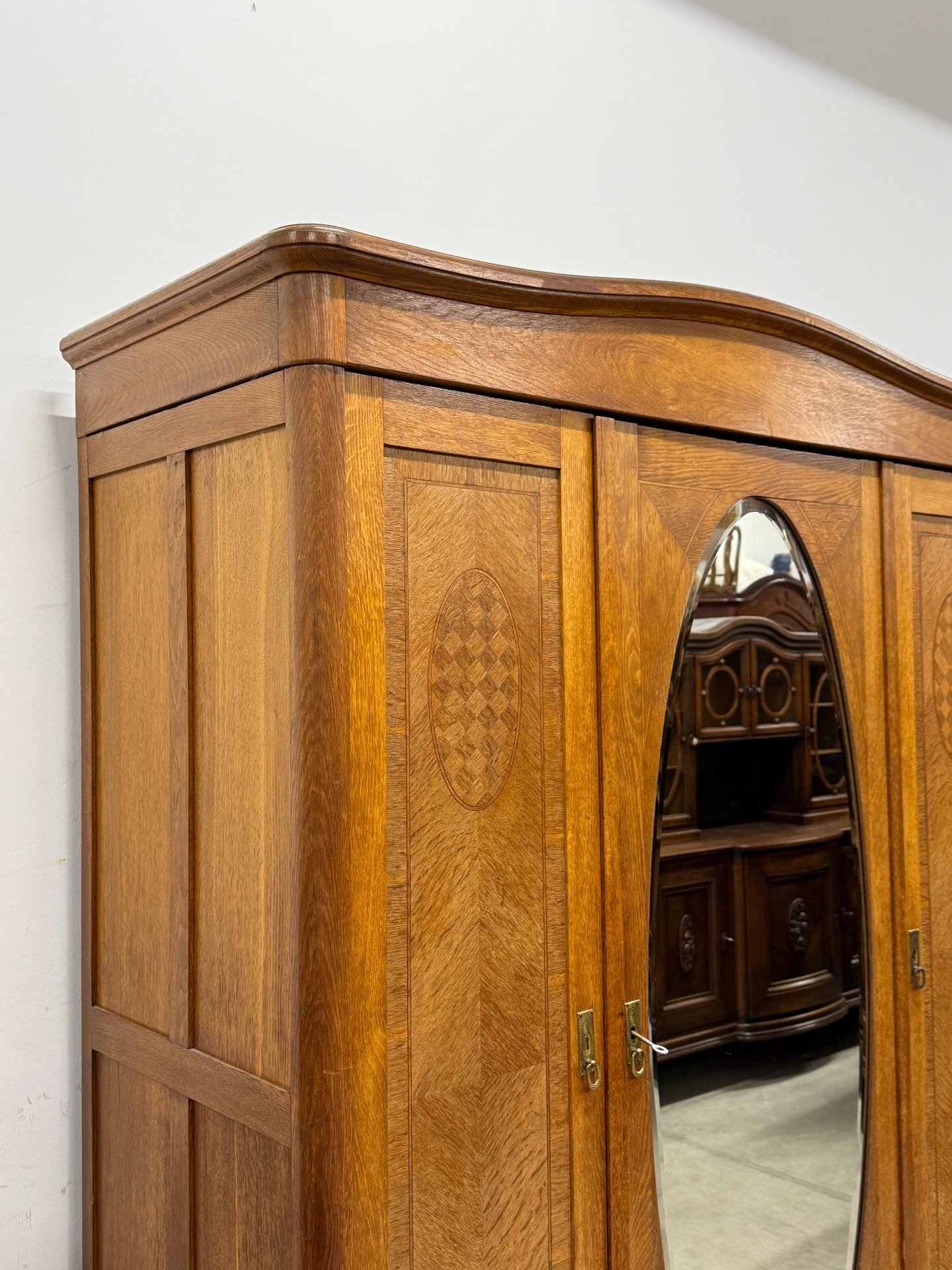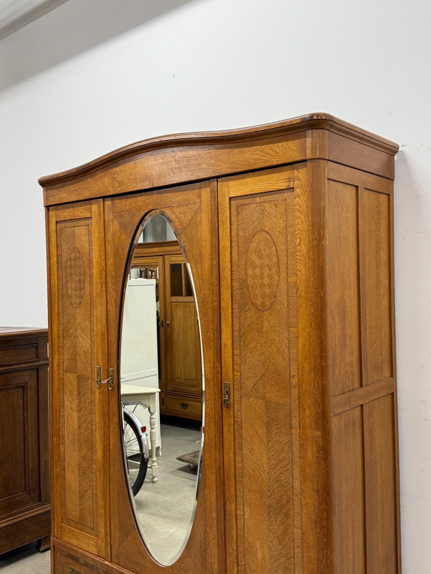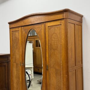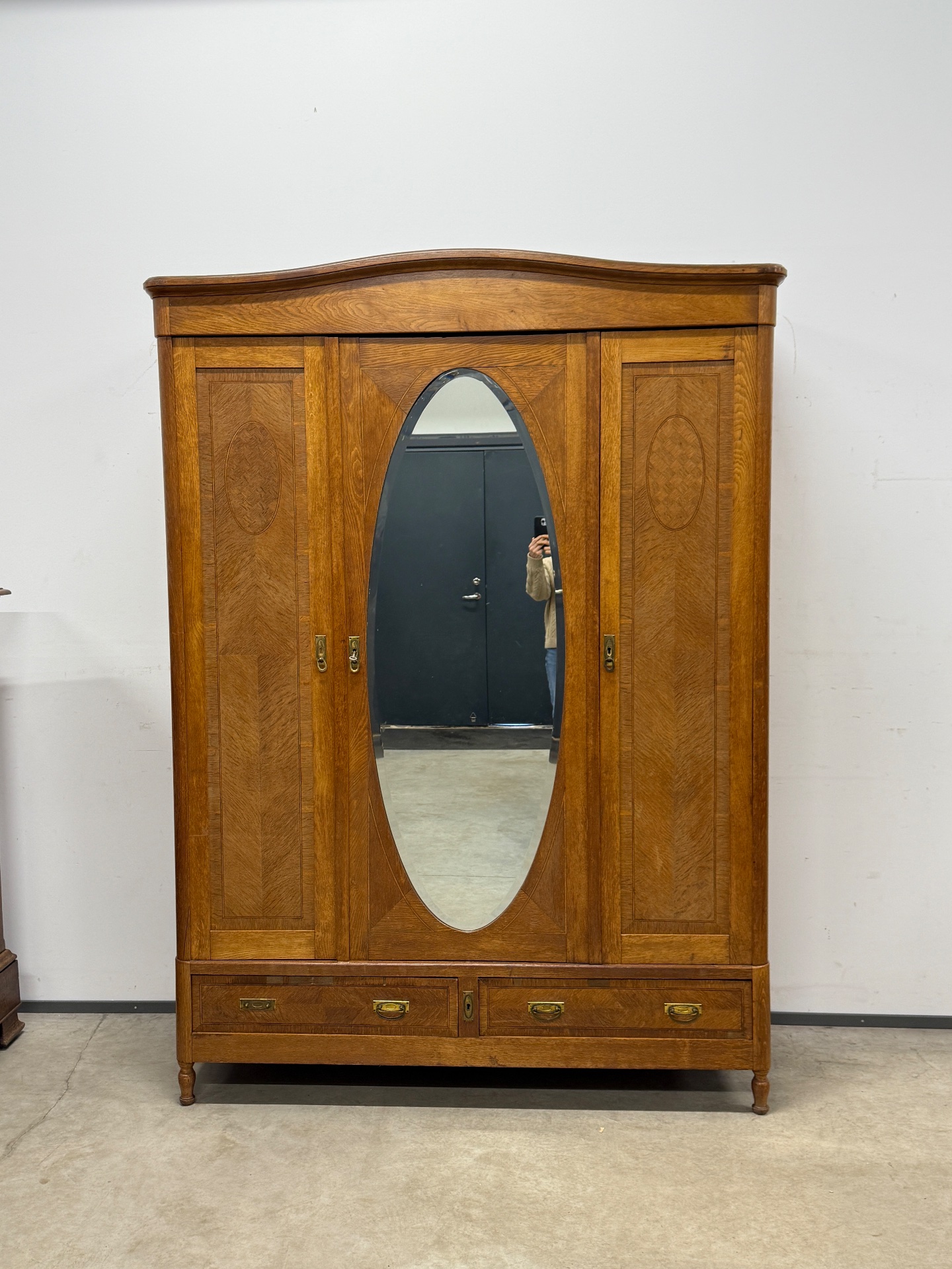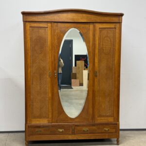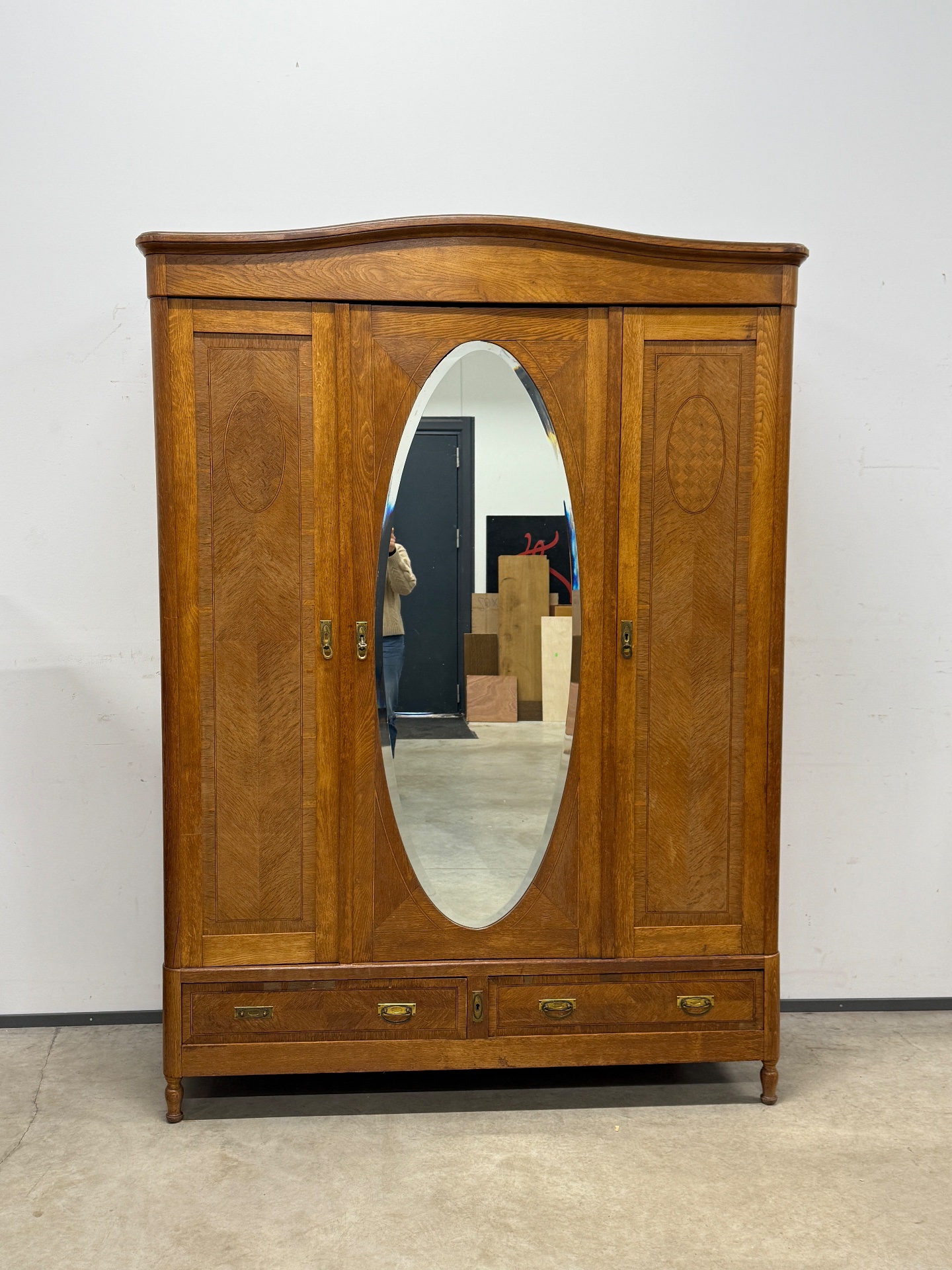 Kauni ovaalse peegliga sajandivanune riidekapp. Parempoolse ukse taga riiulid, teiste uste taga riputuspuu. All kaks mahukat sahtlit. NB! Leidub kasutus- ja kulumisjälgi, puudu osad spoonitükid sahtlipaneelidelt. Transport osadena.