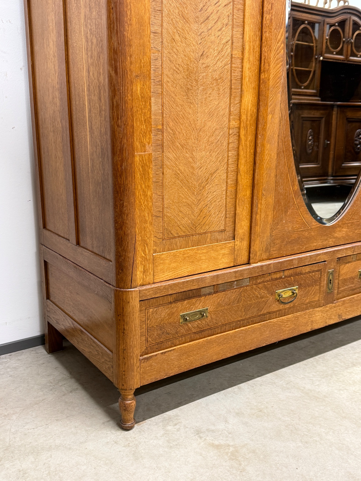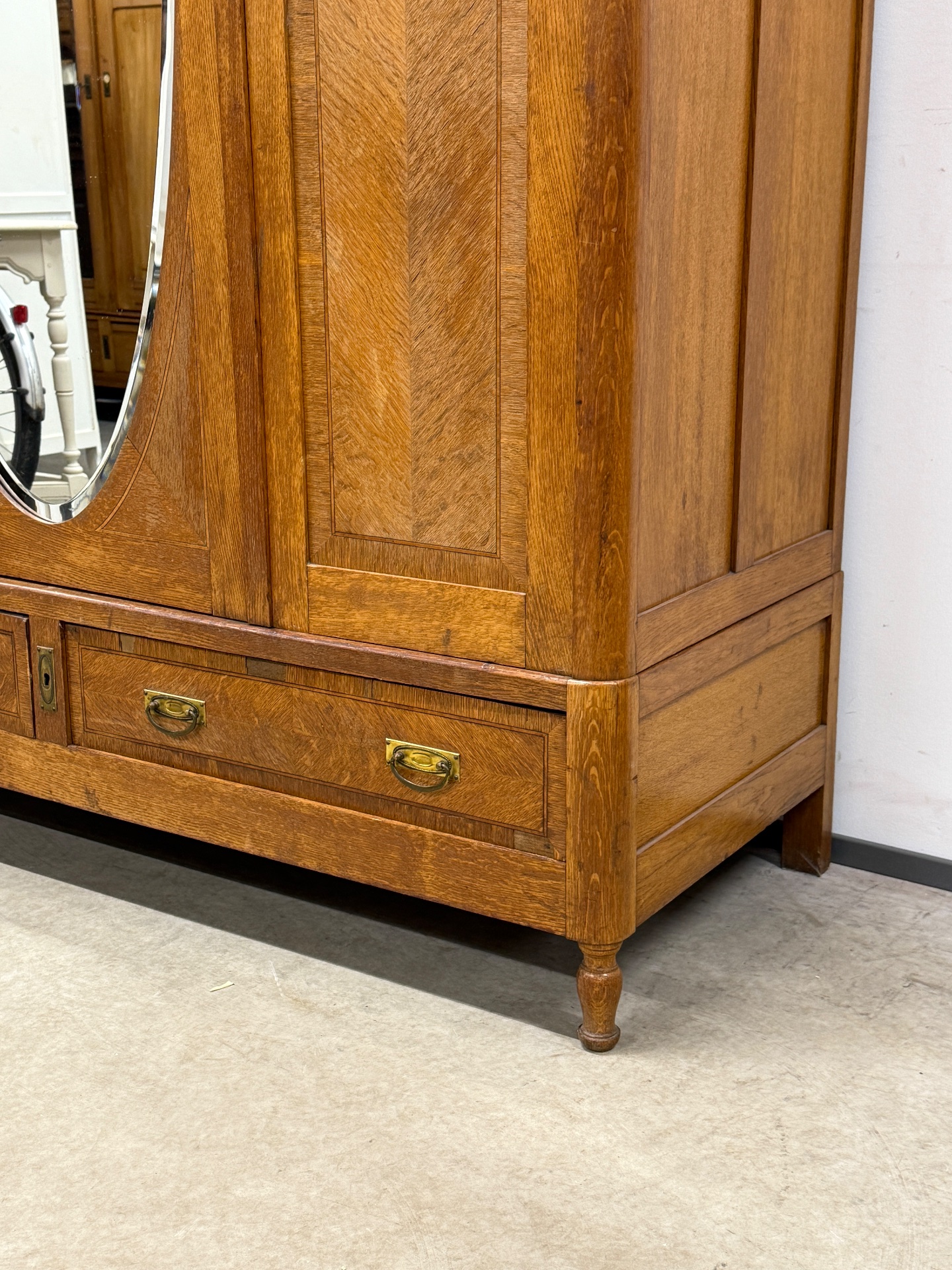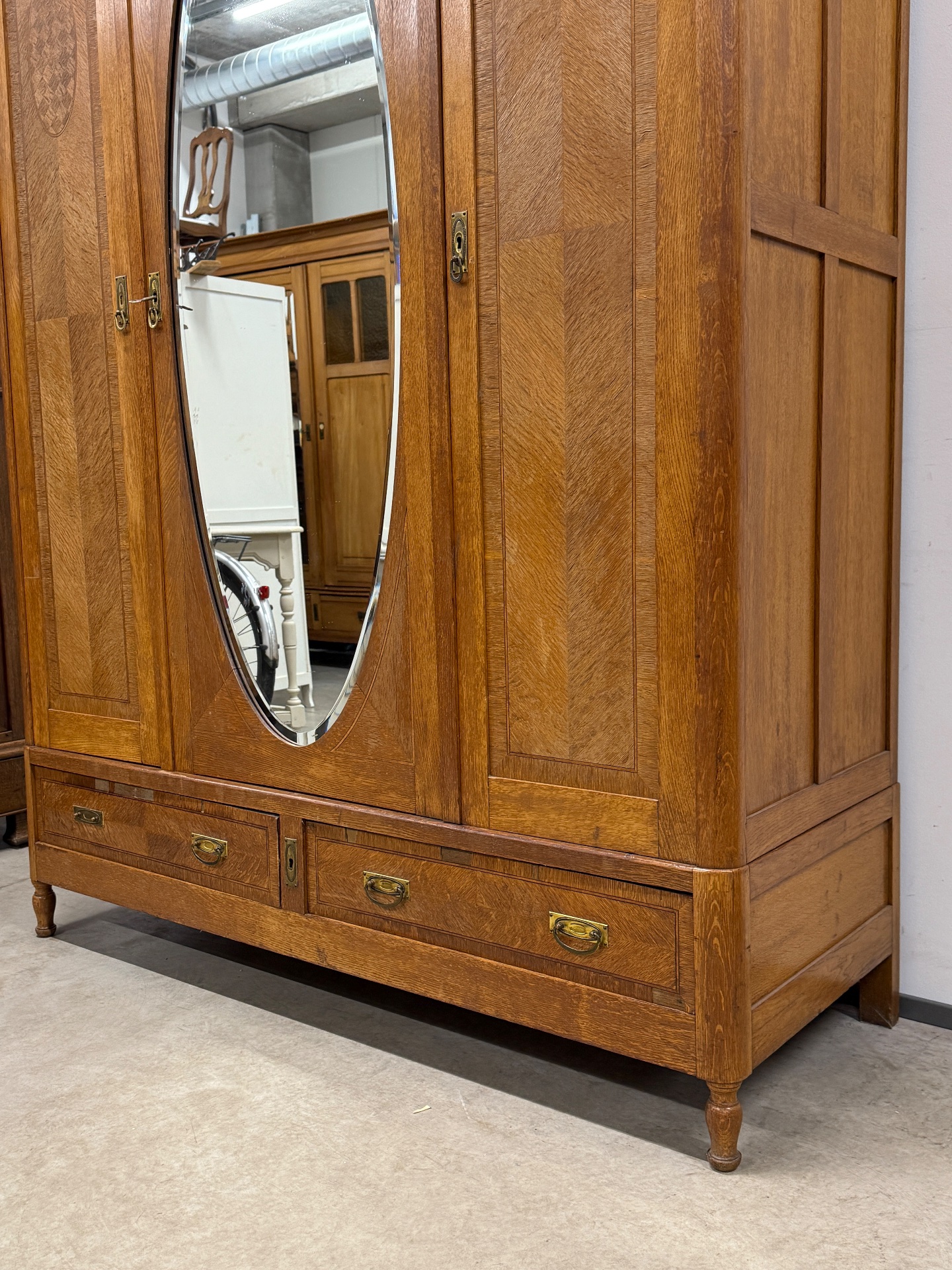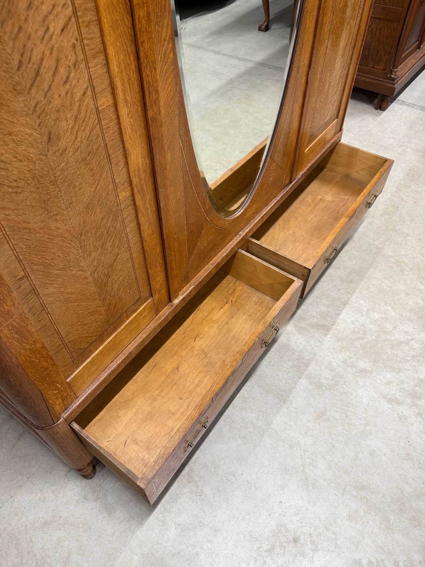 Kauni ovaalse peegliga sajandivanune riidekapp. Parempoolse ukse taga riiulid, teiste uste taga riputuspuu. All kaks mahukat sahtlit. NB! Leidub kasutus- ja kulumisjälgi, puudu osad spoonitükid sahtlipaneelidelt. Transport osadena.