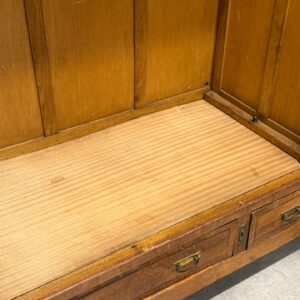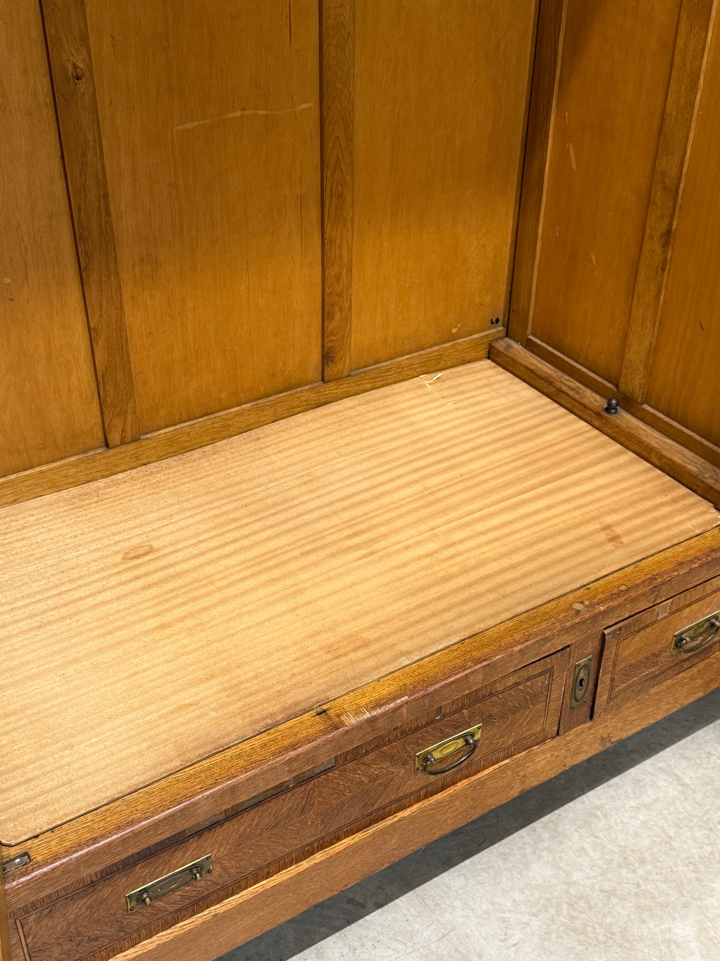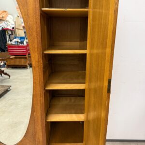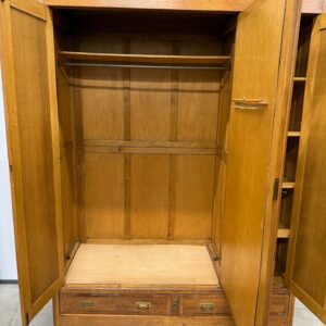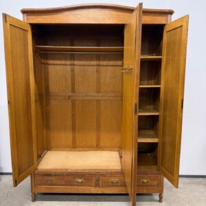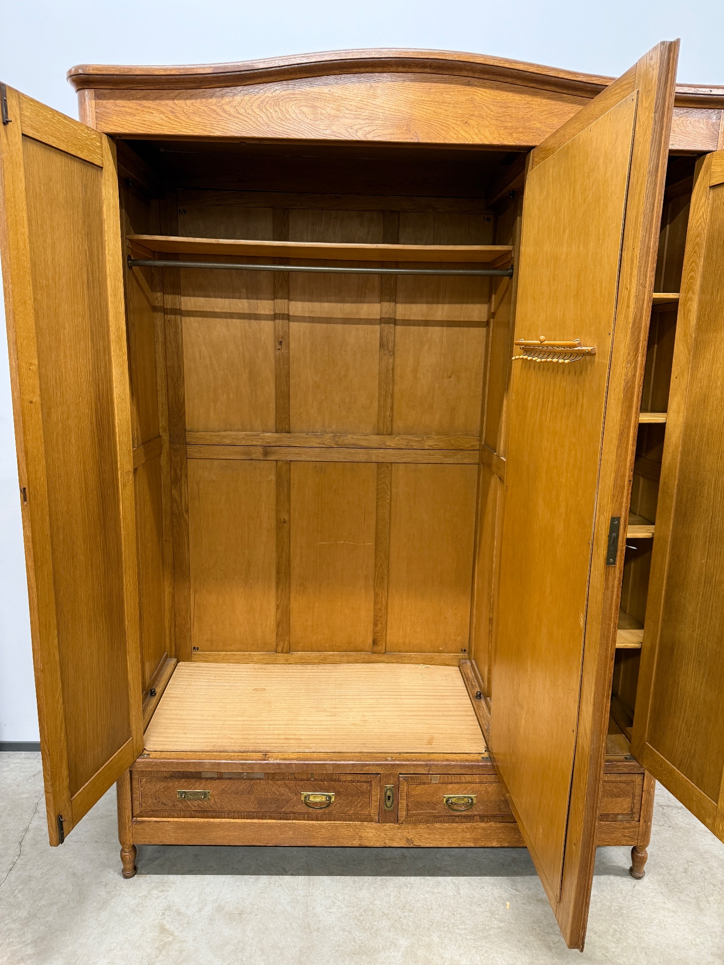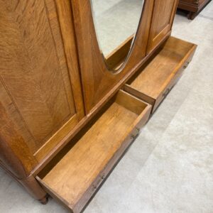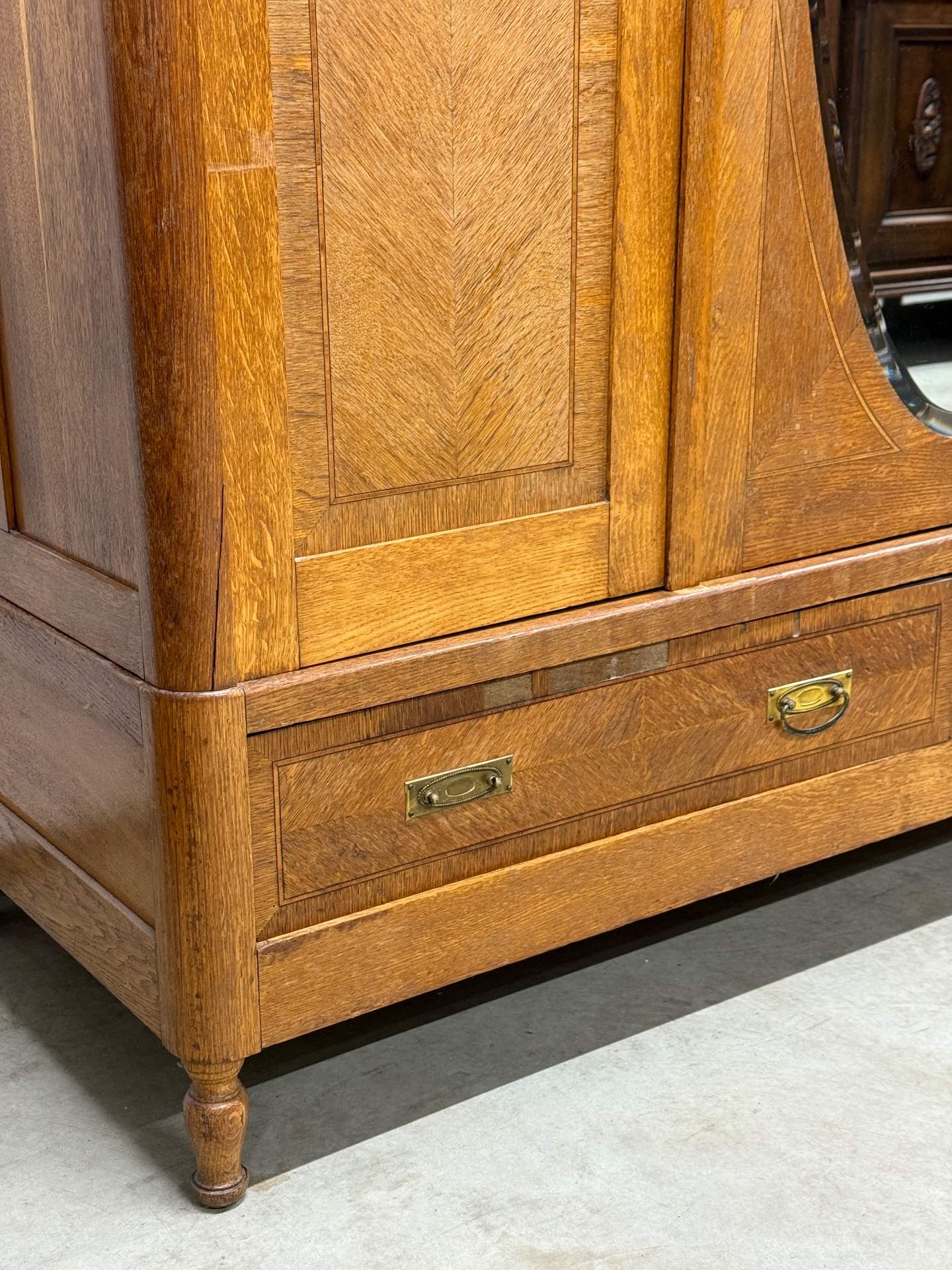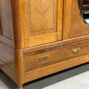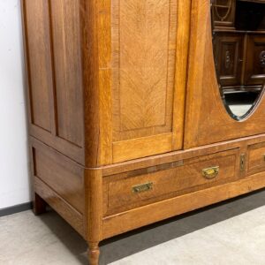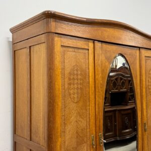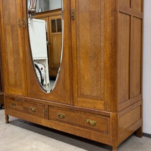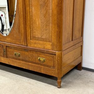 Kauni ovaalse peegliga sajandivanune riidekapp. Parempoolse ukse taga riiulid, teiste uste taga riputuspuu. All kaks mahukat sahtlit. NB! Leidub kasutus- ja kulumisjälgi, puudu osad spoonitükid sahtlipaneelidelt. Transport osadena.