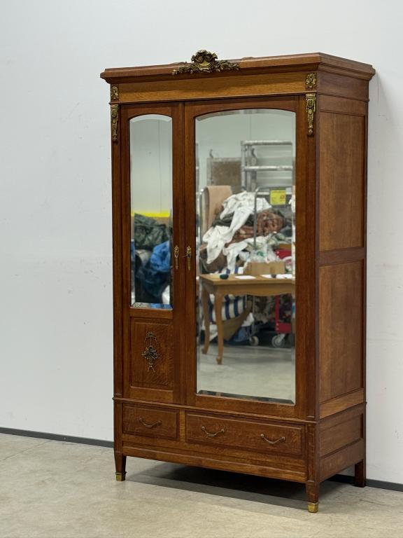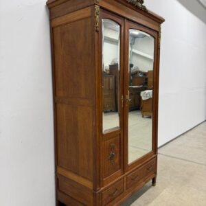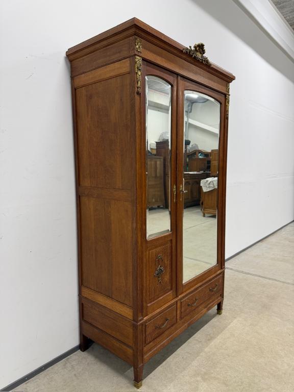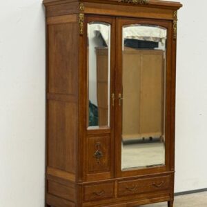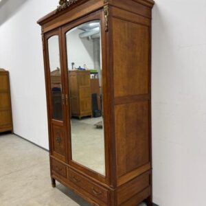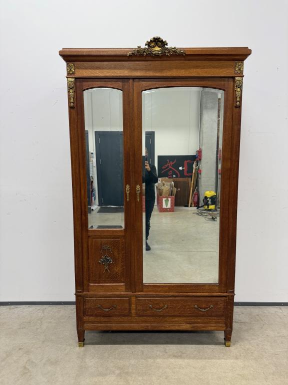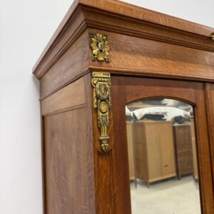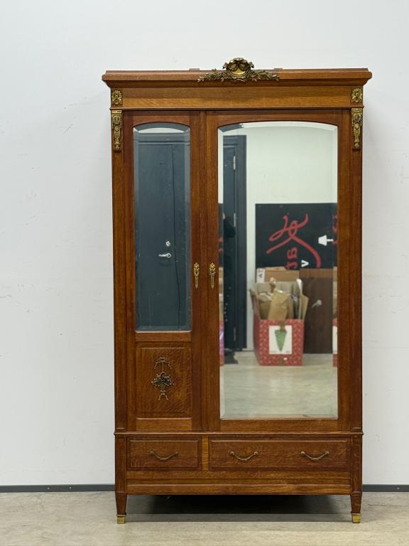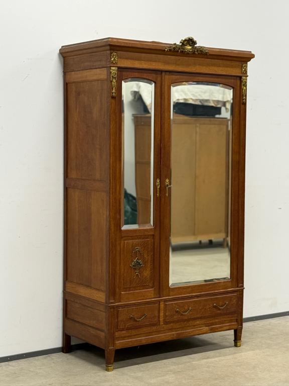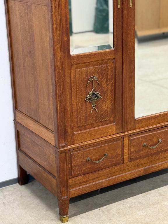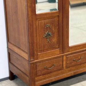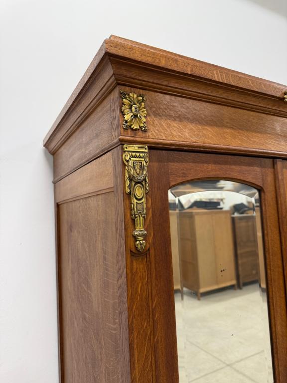 Hea suurusega kaunis riidekapp. Kapp on tammest, peeglid faasitud servadega. Efektsed pronksist kaunistused. NB! Peeglil mõned tumedad laigud, suur ukse liistul mõned täksid, kapi põhjas kuivamispragu. All kaks sahtlit, sees kogu ulatuses riputuspuu.Transport osadena.