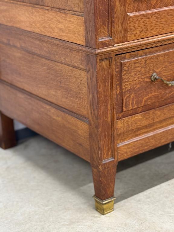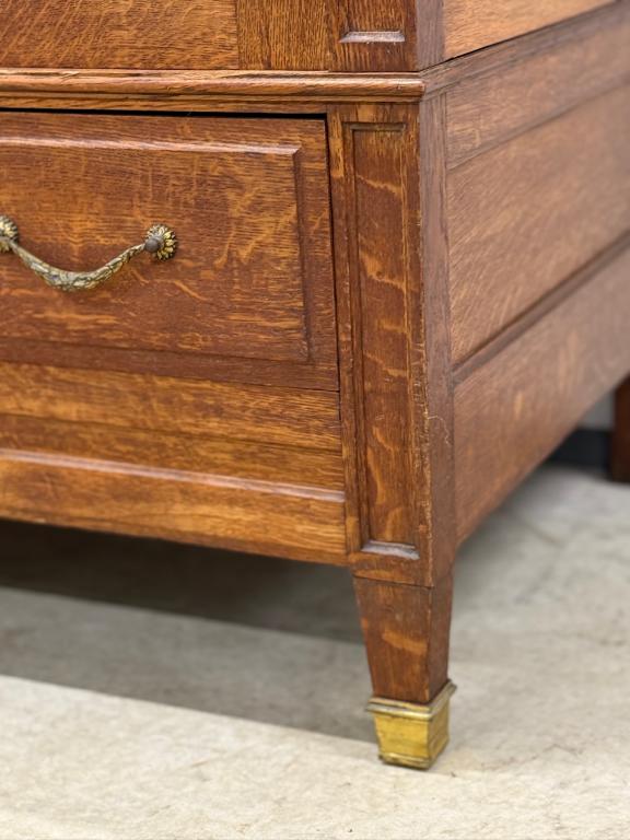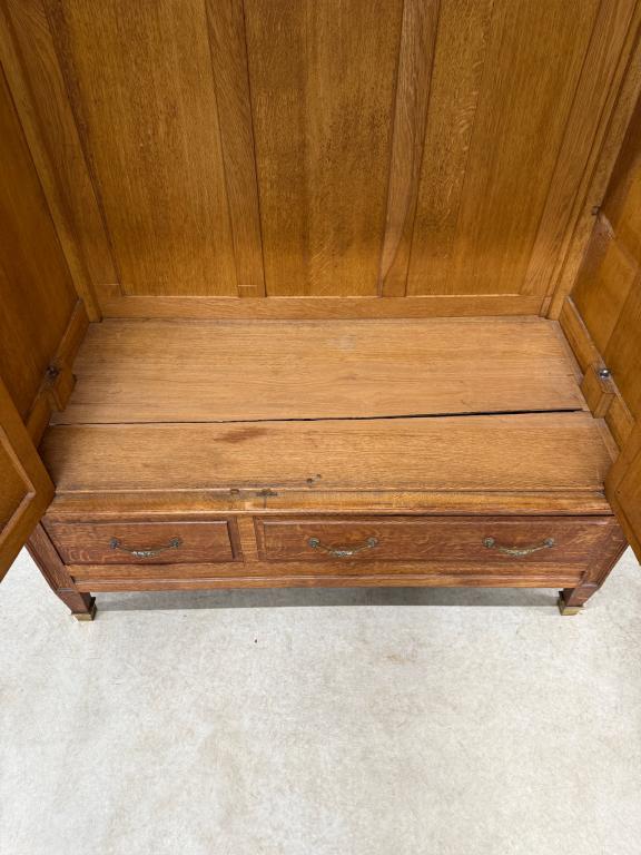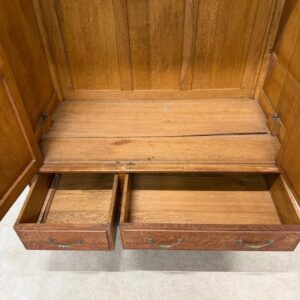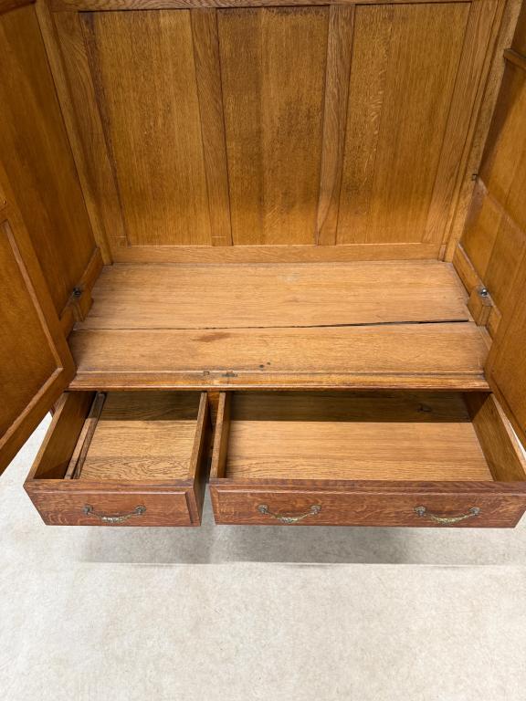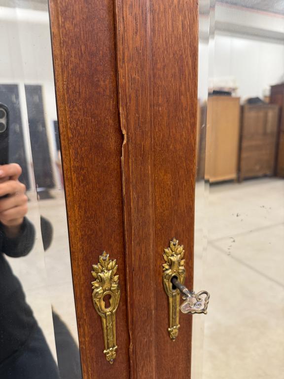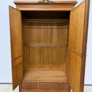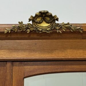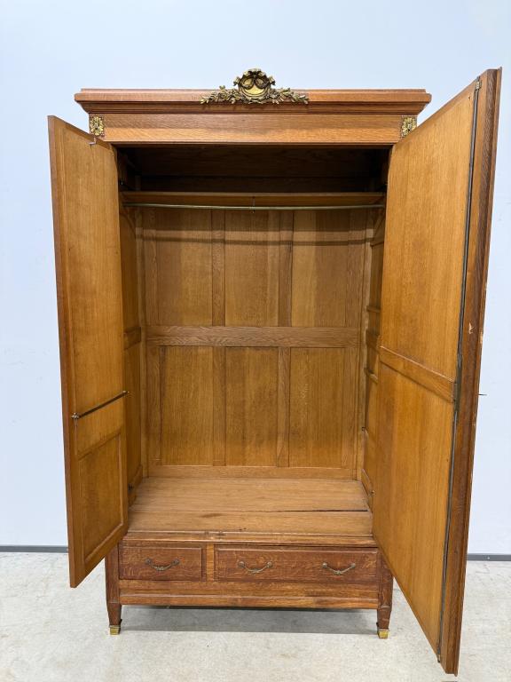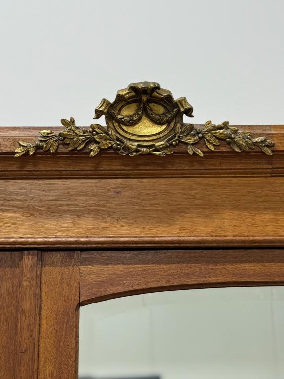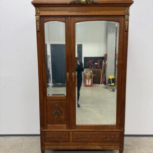 Hea suurusega kaunis riidekapp. Kapp on tammest, peeglid faasitud servadega. Efektsed pronksist kaunistused. NB! Peeglil mõned tumedad laigud, suur ukse liistul mõned täksid, kapi põhjas kuivamispragu. All kaks sahtlit, sees kogu ulatuses riputuspuu.Transport osadena.