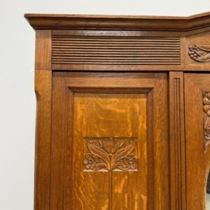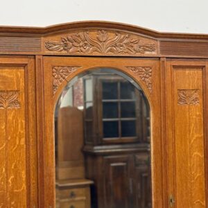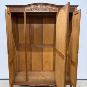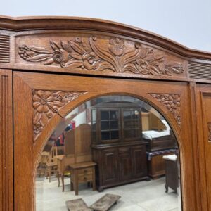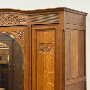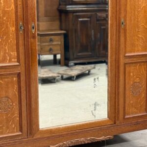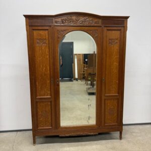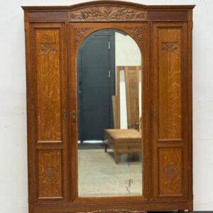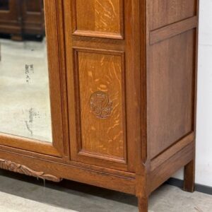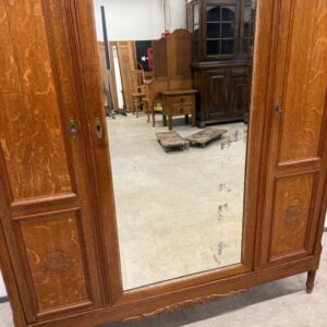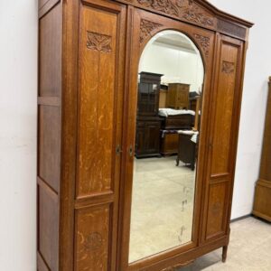 Sajandivanune tammest riidekapp. Kaunid nikerdused raamil ja ustel. Peegel faasitud kandiga, kuid lahjuks ajaga tekkinud mustad laigud – vt pilte. Kõik kolm ust avatavad ning ka lukustatavad. Kaks võtit! Sees kogu ulatuses riputuspuu. Leidub kulumis- ja kasutusjälgi, kuid üldmulje väga hea. Transport osadena.