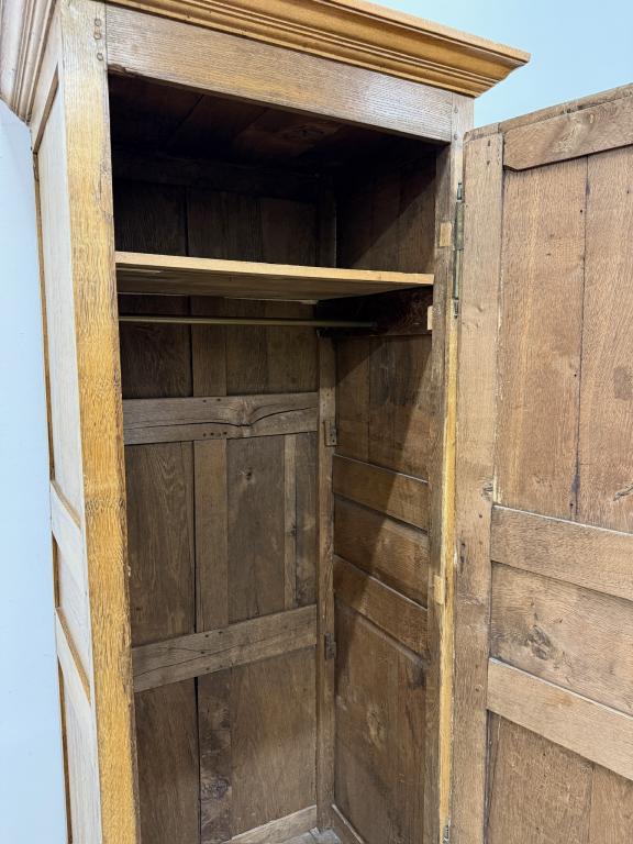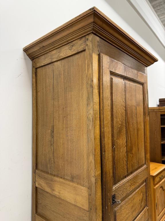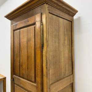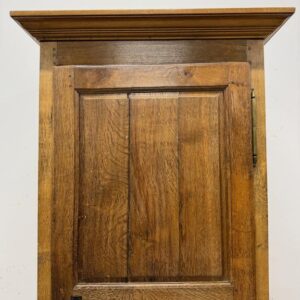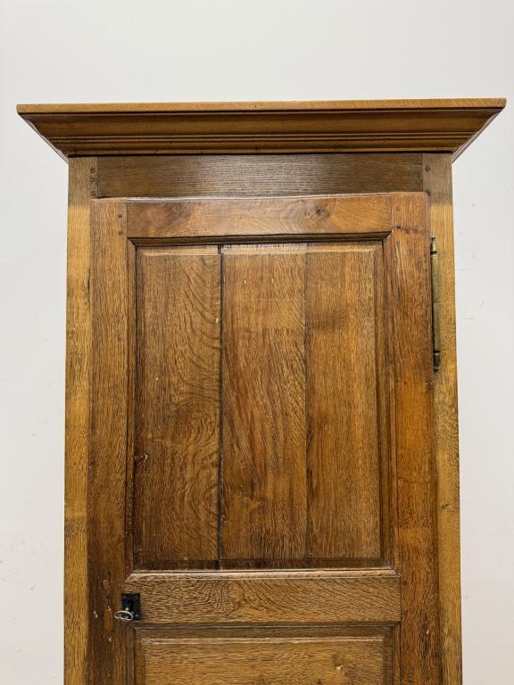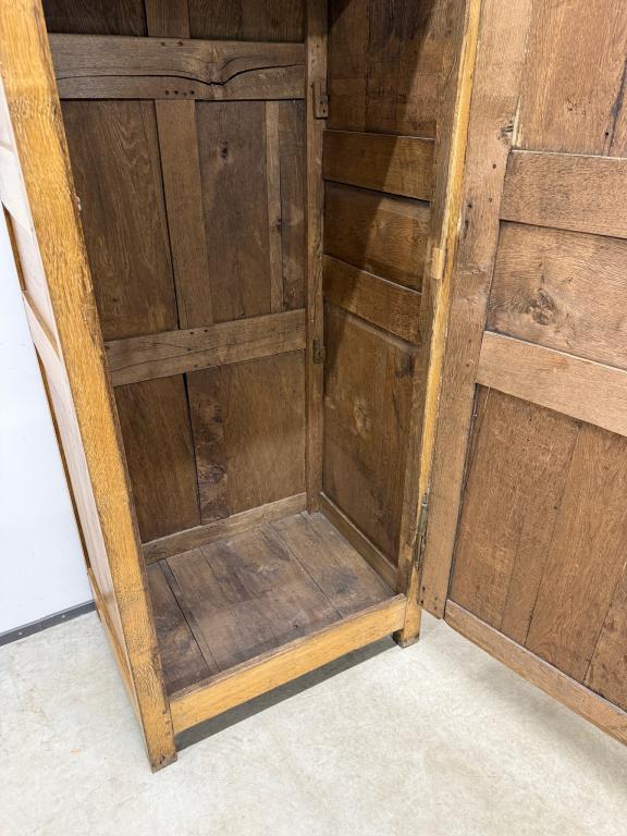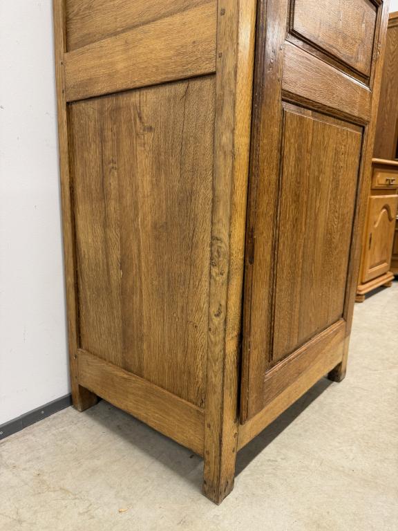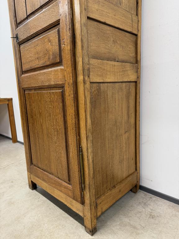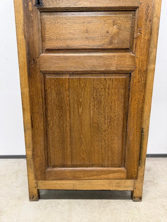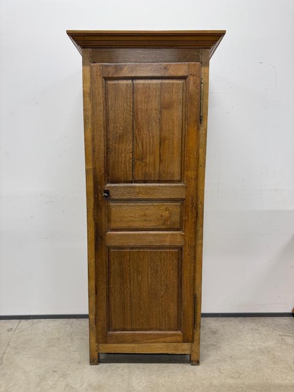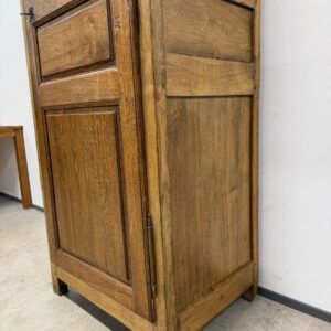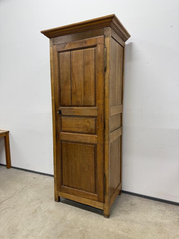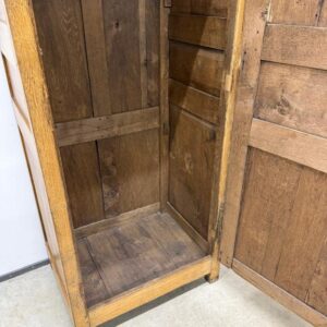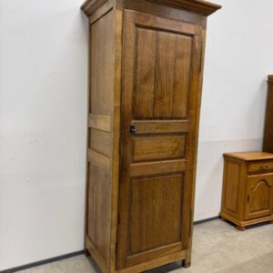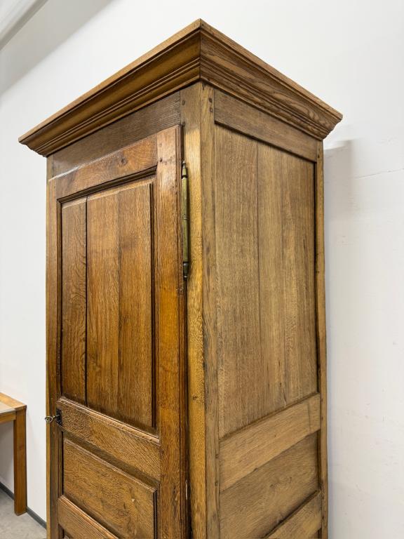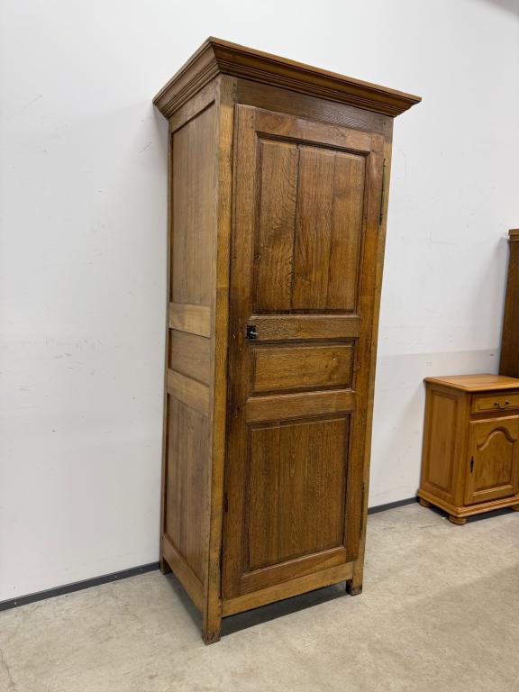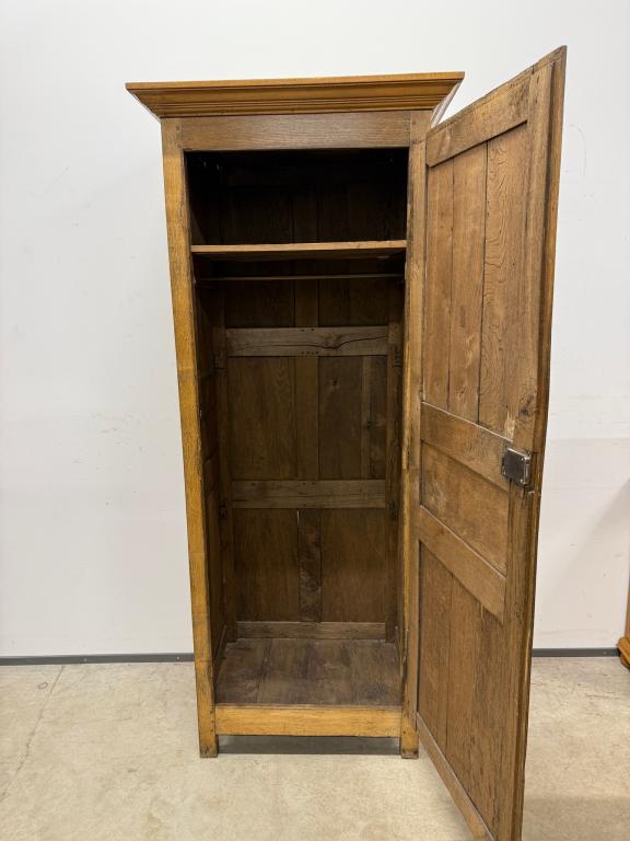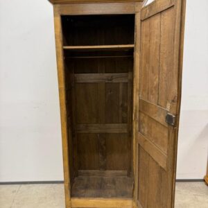üleni tammest kitsas riidekapp. Sees riputuspuu. Leidub kulumis- ja kasutusjälgi, kuivamispragusid. Lukk töökorras, võti olemas. Transport ühes osas.