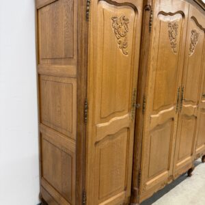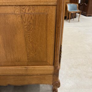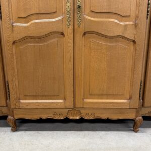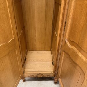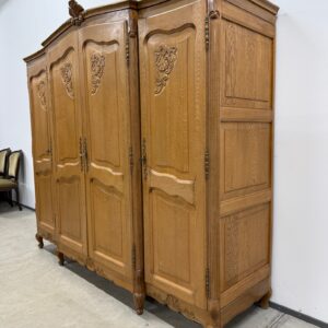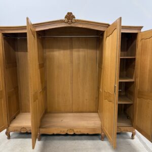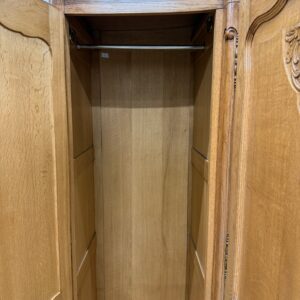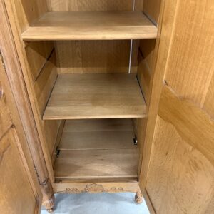 Kauni tammest riidekapp. Ilusad nikerdused raamil ja ustel. Parempoolse ukse taga riiulid, teiste uste taga riputuspuud. Nb! Kapi küljed kõveraks kuivanud. Selle pärast on kappi raske kokku panna ning on tekkinud kuivamispraod küljepaneelidele ning ka tagumistele paneelidele. Uksed käivad hästi ning kui kapp juba kokku on pandud, on kena ja väga hästi kasutatav. Parempoolse ukse lukk ei tööta, kuid uks püsib kinni. Teistel ustel lukud korras ning kaks vòtit olemas. Transport osadena!