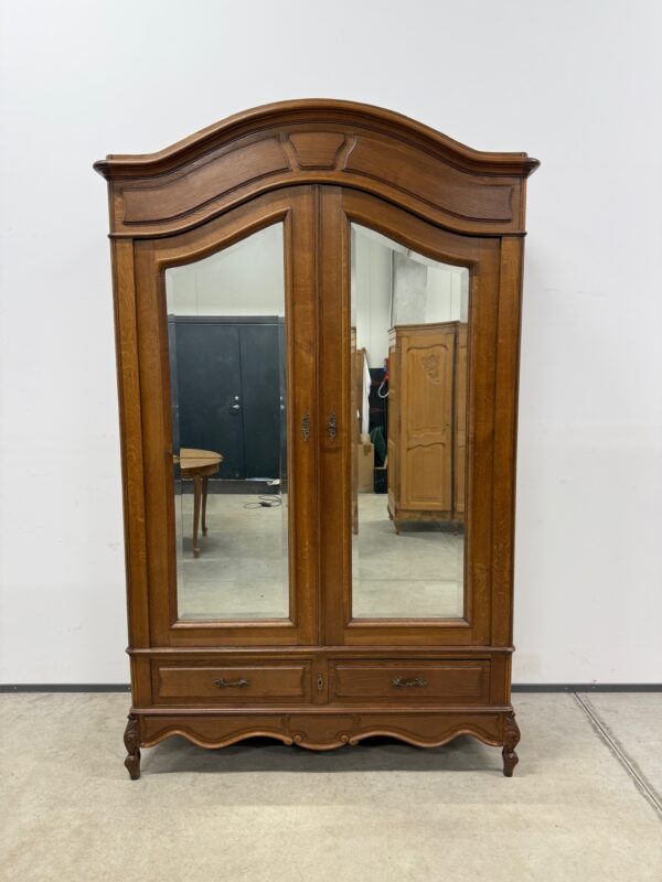 Kahe suure peegeluksega pilkupüüdev riidekapp. Sees kogu ulatuses riputuspuu, all kaks mahukat sahtlit. Kapp on tammest, peeglid kenade faasitud servadega. Lukk töökorras, võti olemas. Leidub väiksemaid kulumis- ja kasutusjälgi, mõned pisikesed kuivamispraod, kuid üldmulje väga hea. NB! Ukse liistu servad defektsed – vt pilt. Transport osadena.