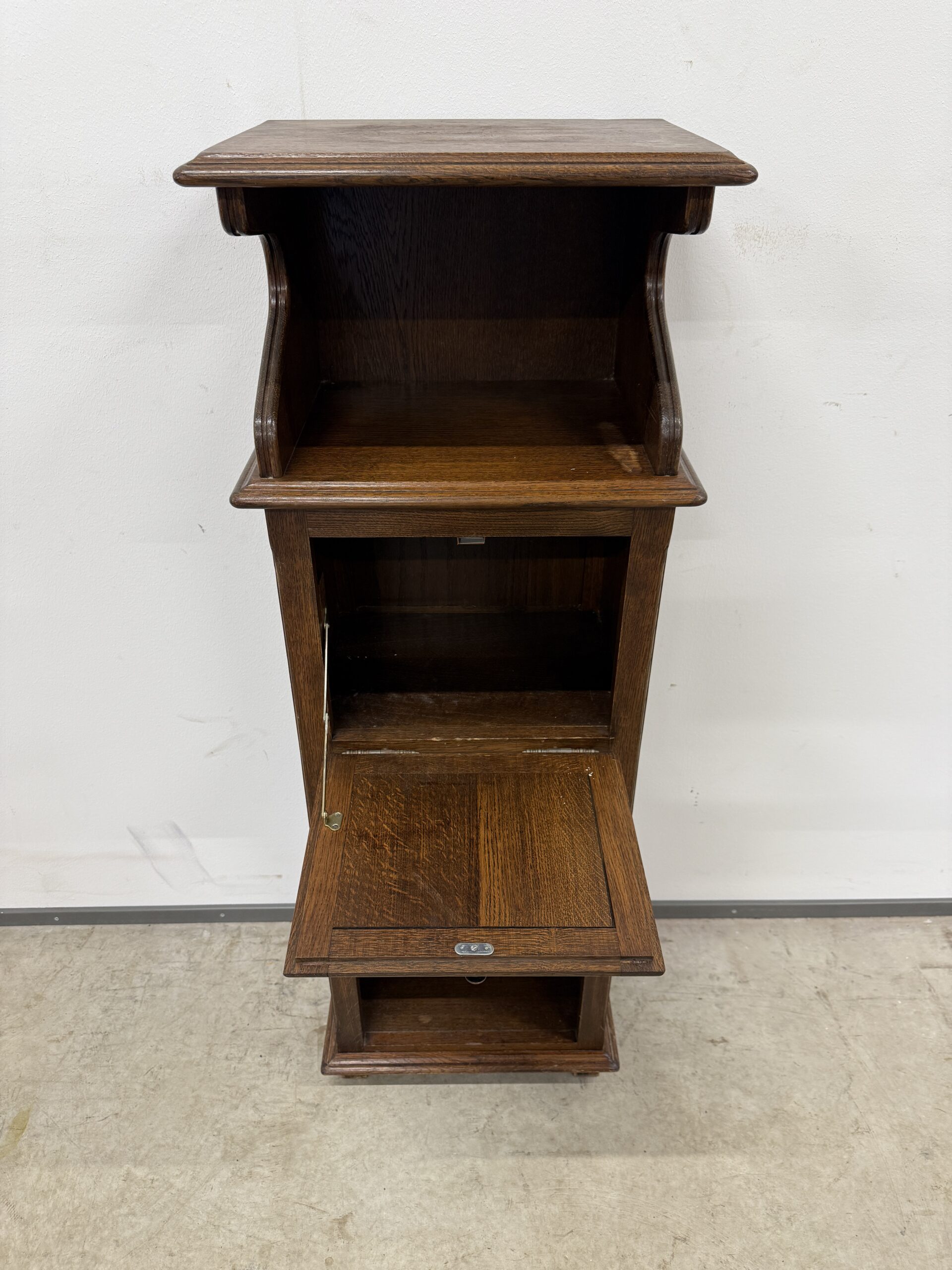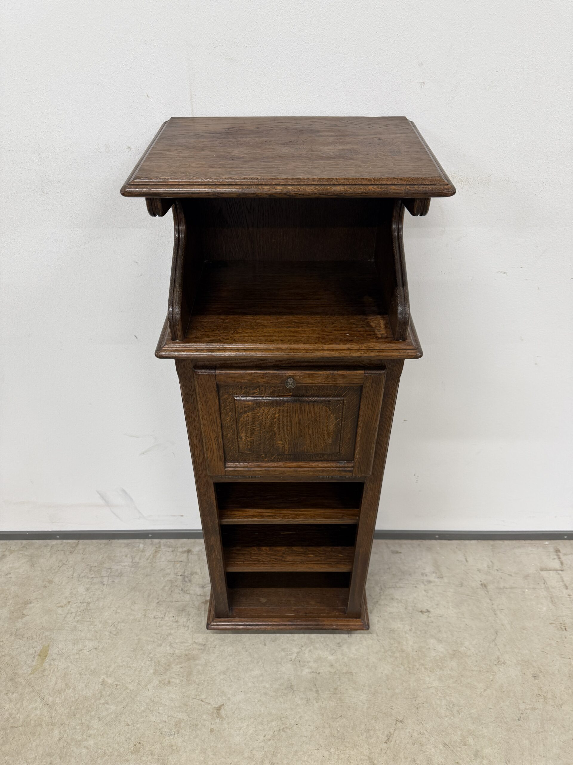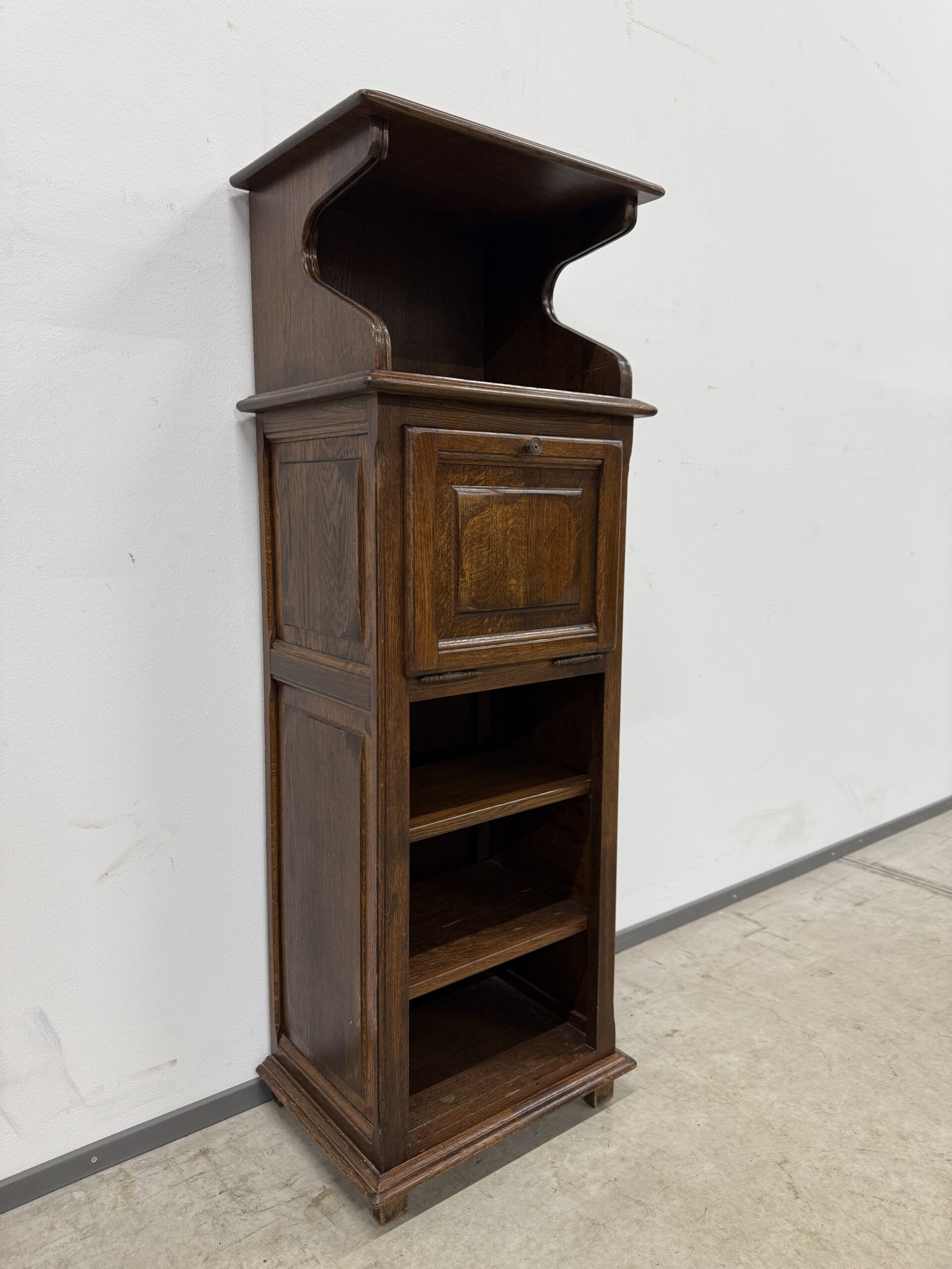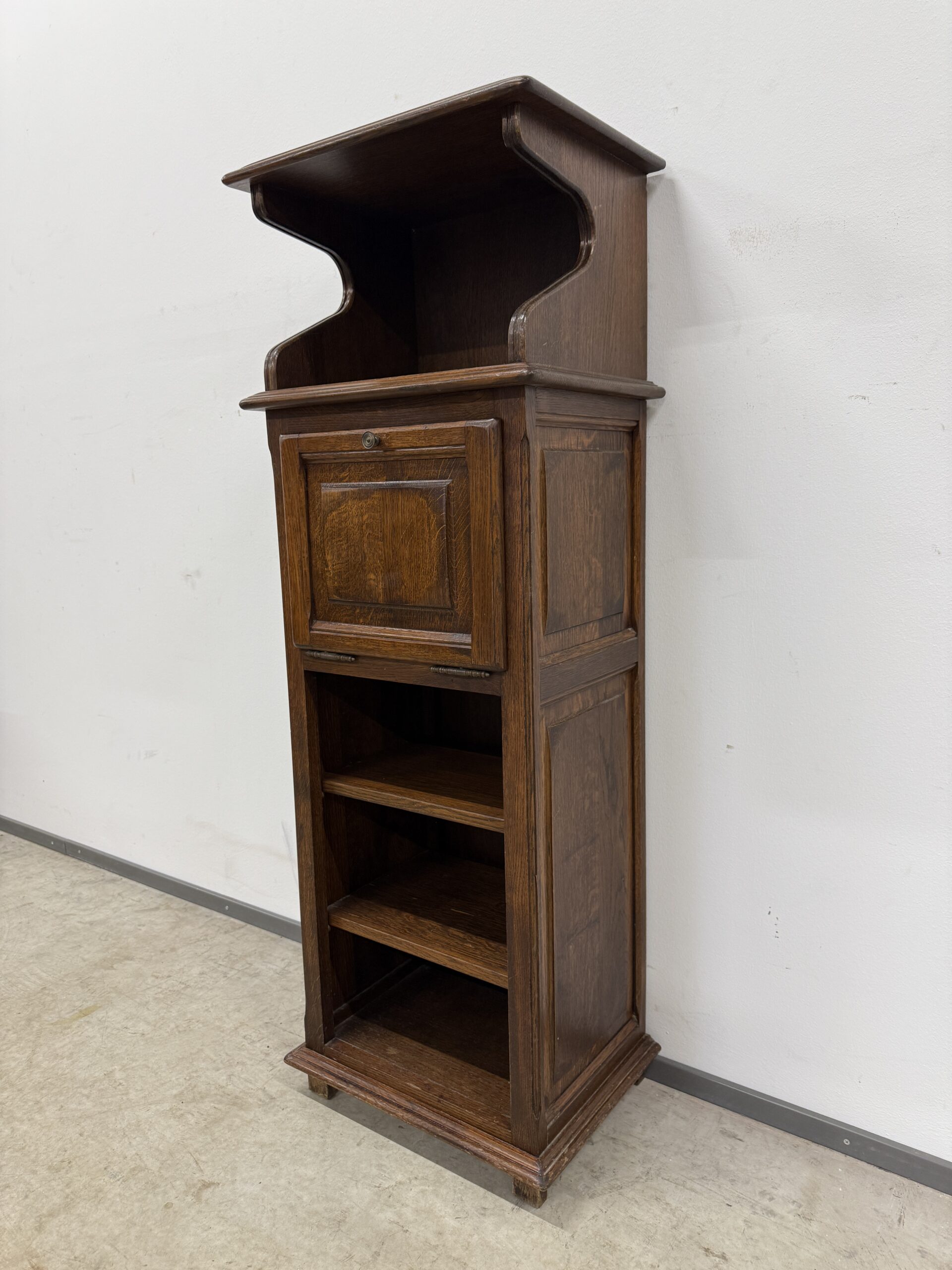 Üleni tammest kitsas ja kõrge riiul/kapp. Leidub väiksemaid kulumis- ja kasutusjälgi, kuid üldmulje väga hea. Transport ühes osas.