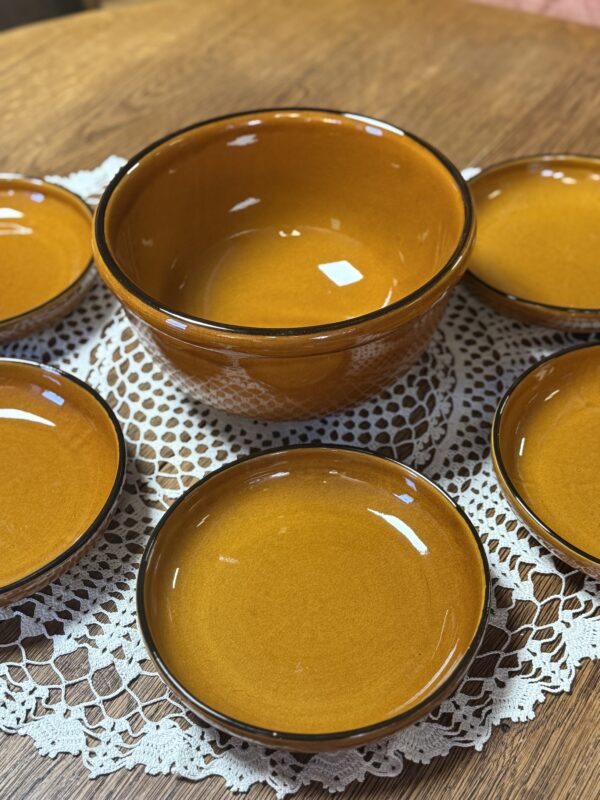Suur savist kauss ning viis kõrge servaga taldrikut. Kõik komplekti osad veatud. Taldrikute diameeter 20 cm. Kausi diameeter 25 cm ja kõrgus 14 cm.