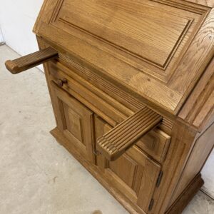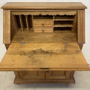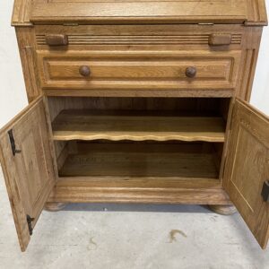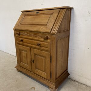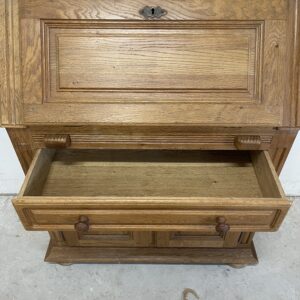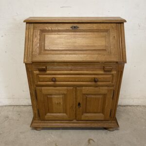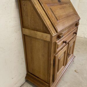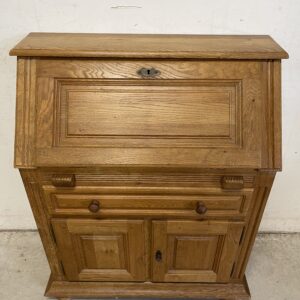Heledast tammest kena ja mahukas sekretärkapp. Uste taga loogelise servaga tammest riiul, suur ja mahukas sahtel. Luugi all väljatõmmatavad toed, et oleks mugav tööd teha. Lukud töökorras, võti olemas. NB! Paremal külje tagaservas puidust kild väljas, vt viimane pilt. Kasutamist ei sega ning eriti silma ka ei paista. Luugi töötasapind seestpoolt laiguline. Transport ühes osas.