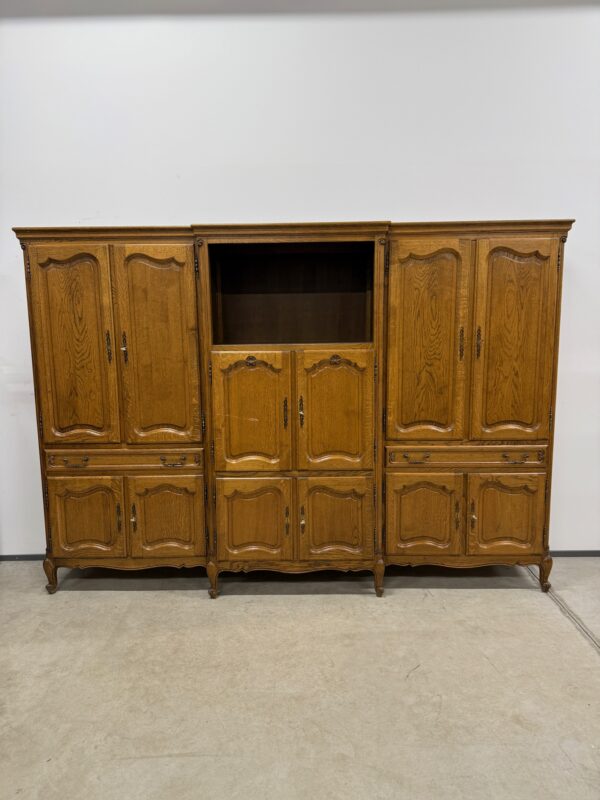 Tammest raamiga suur ja mahukas sektsioonkapp. Riiulite kõrgust võimalik reguleerida. Lukud töökorras, võtmed olemas. Leidub kulumis- ja kasutusjälgi, kuid üldmulje hea. Transport kolmes osas.