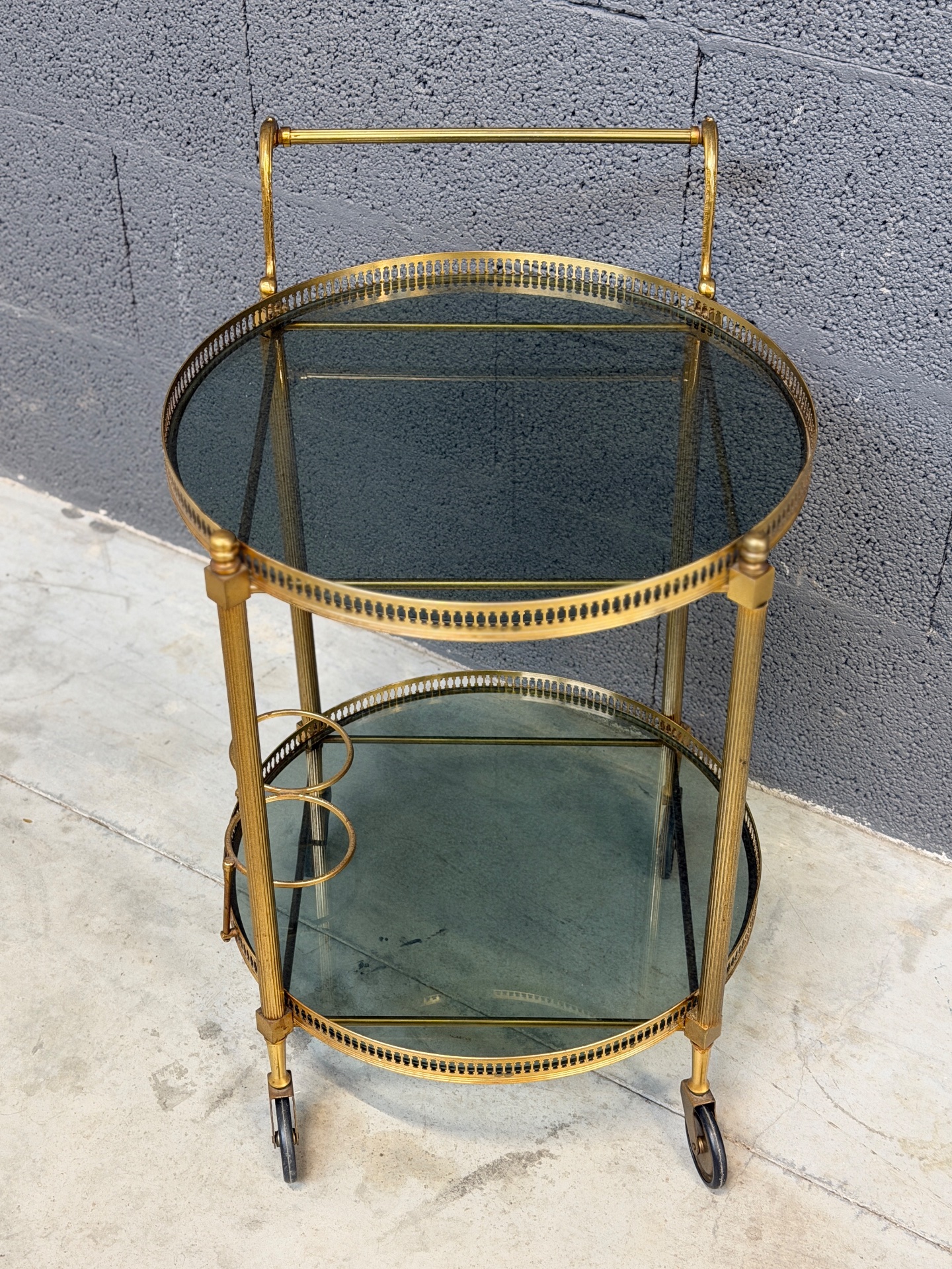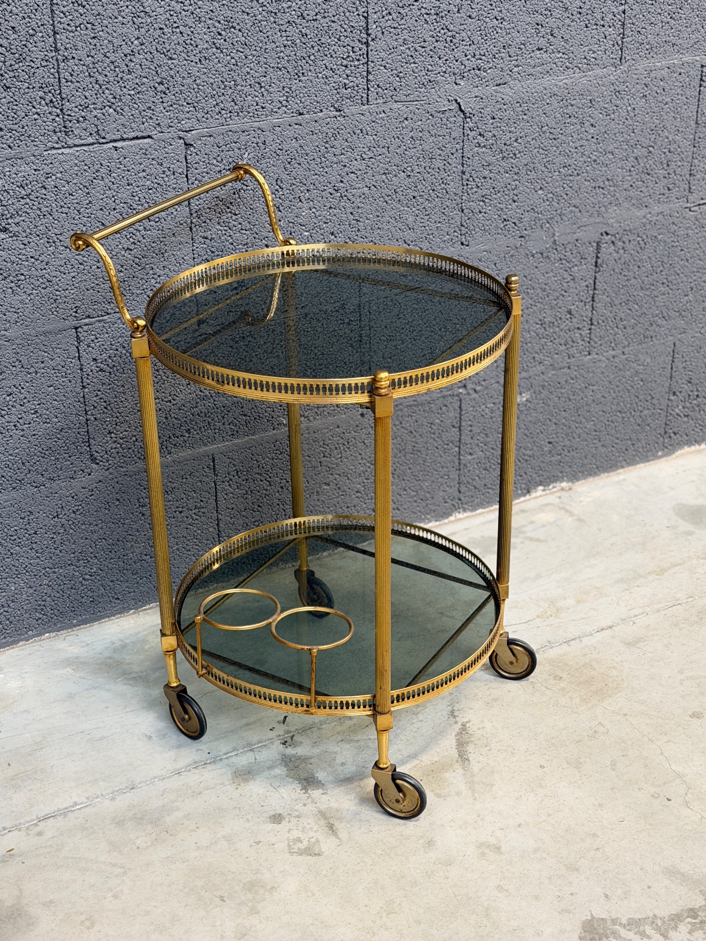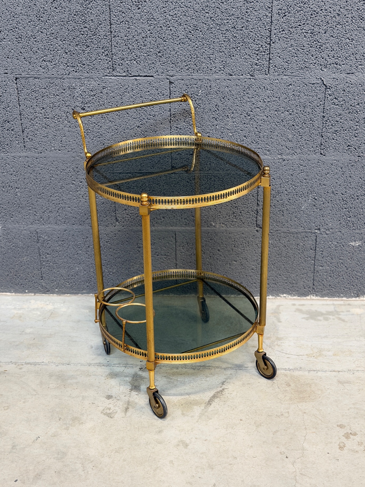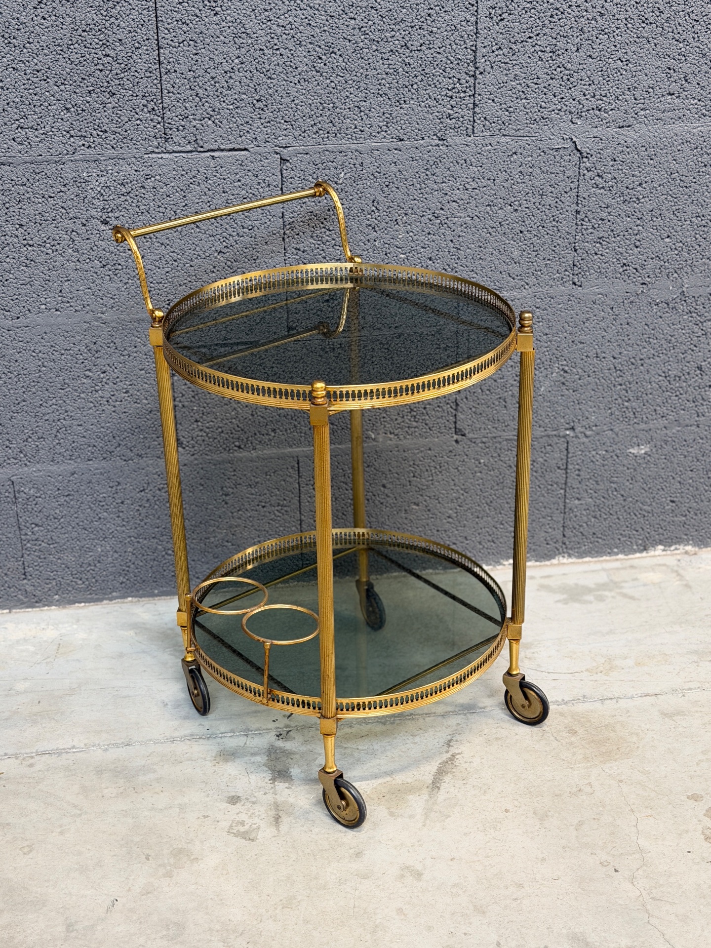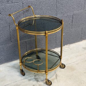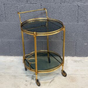 Kullatud raamiga ümmargune serveerimiskäru. Rattad liiguvad väga hästi, mugav kasutada.