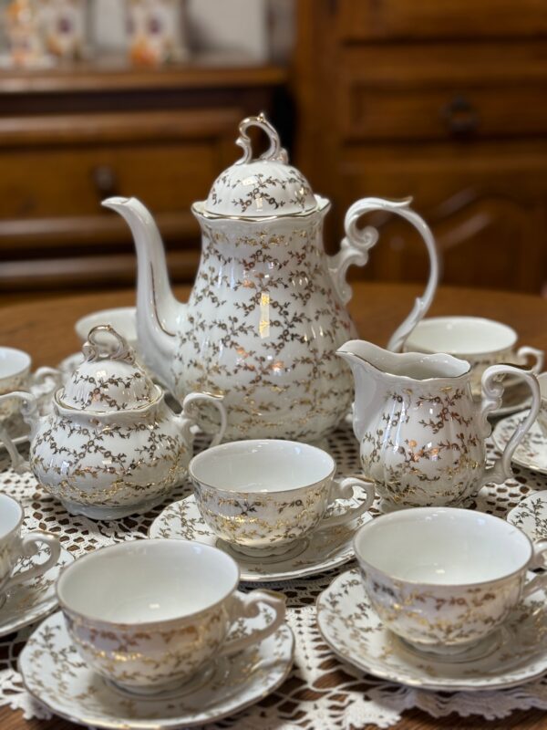 Rikkaliku kulladekooriga Bavaria portselanist kohviserviis 10-le. Tassi maht 200 ml. Ühe alustassi servas pisike killuviga – vt pilt. Muus osas veatu, kullatis kulumata.