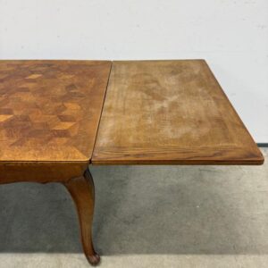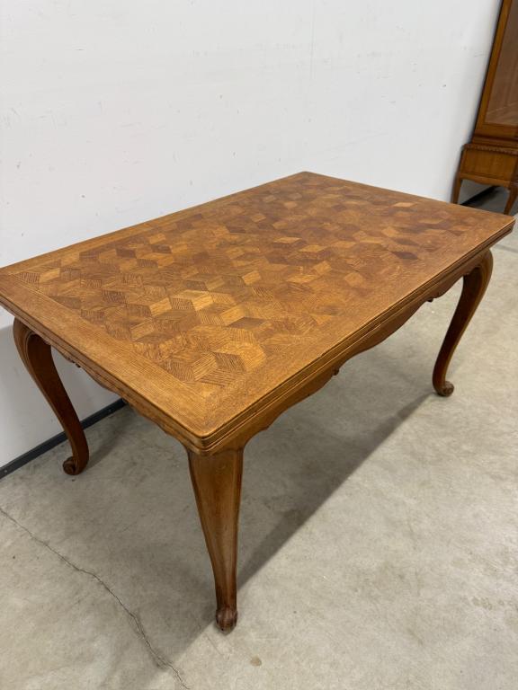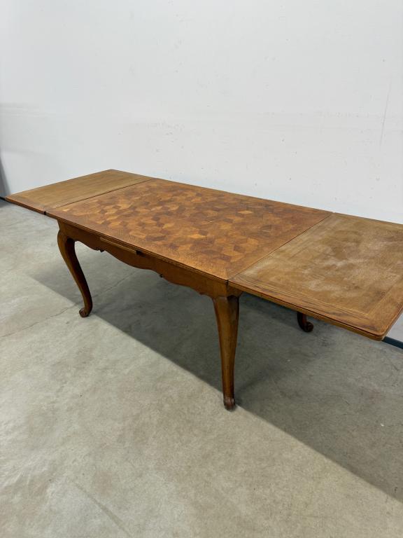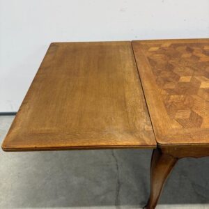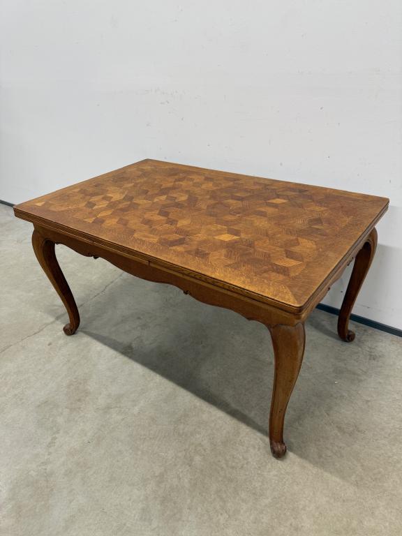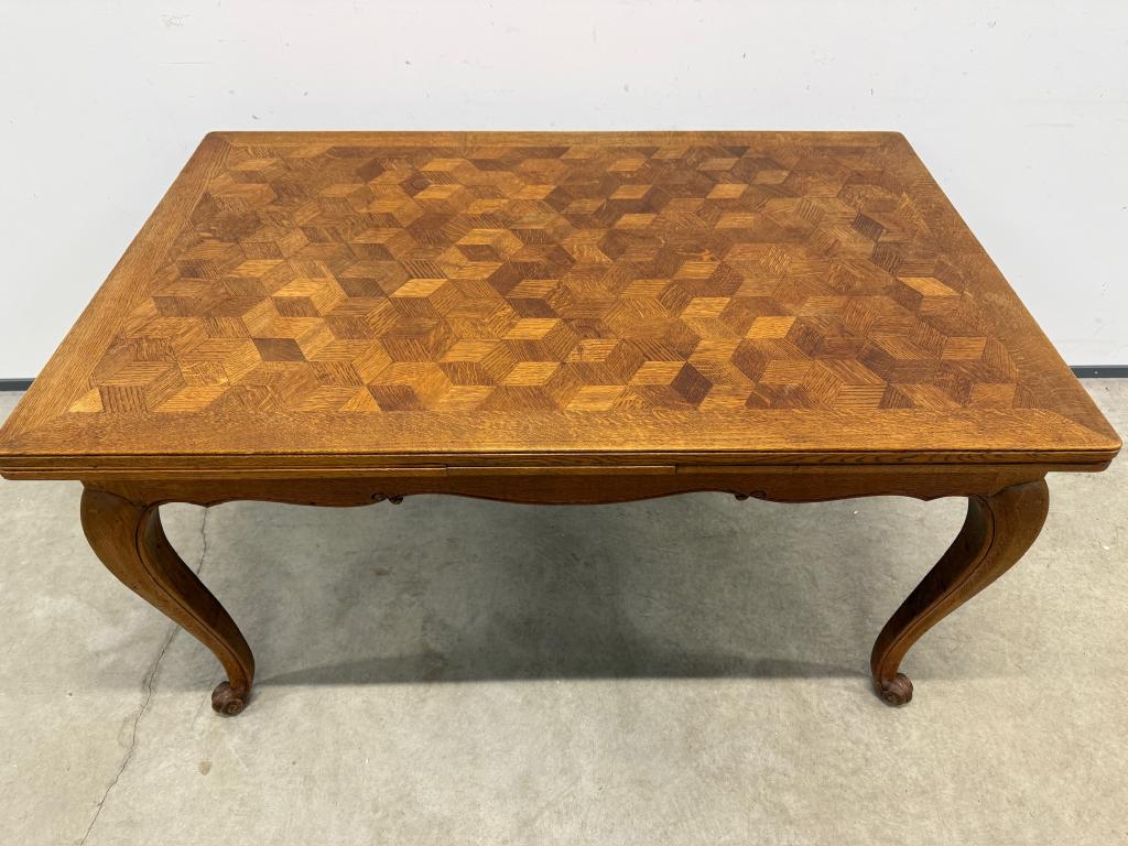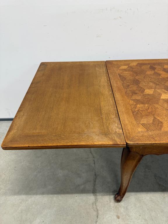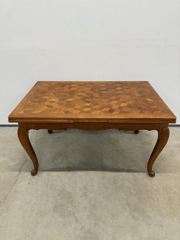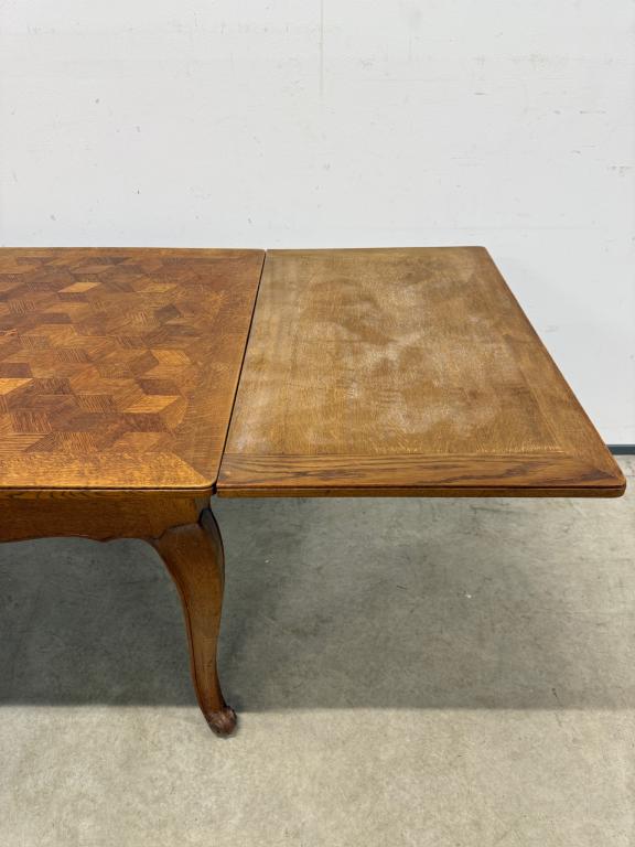Kulumis- ja kasutusjälgedega pikendatav tammest raamiga söögilaud. Lauaplaadi laius 140 cm + 2 x 55 cm, lühema külje laius 90 cm.