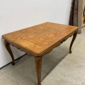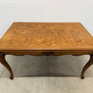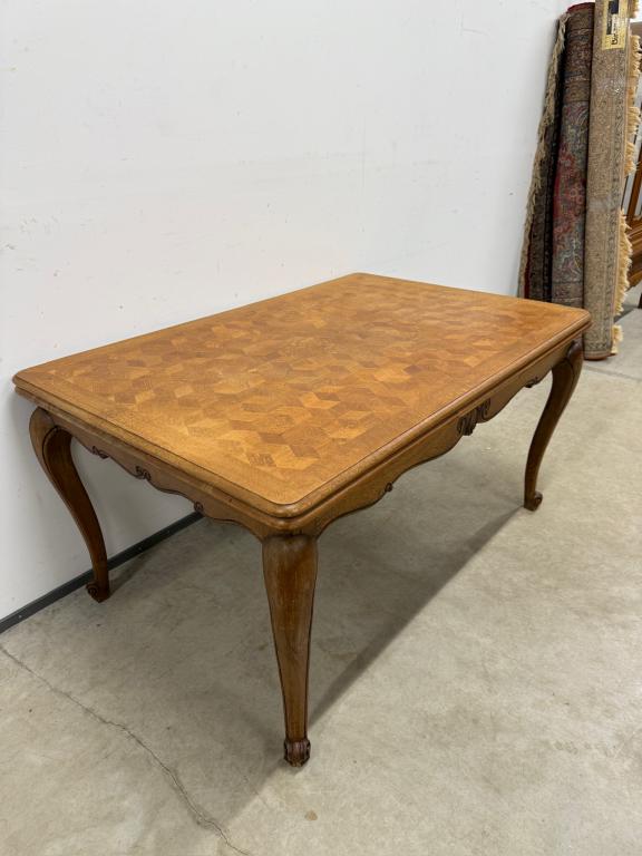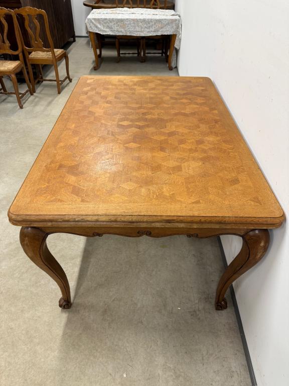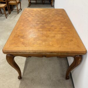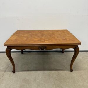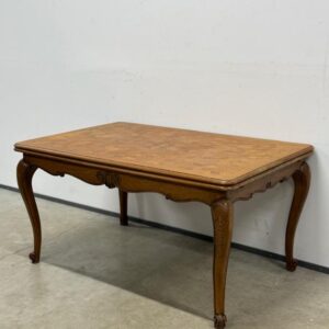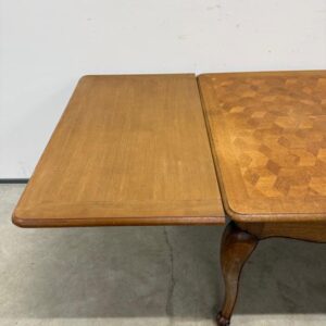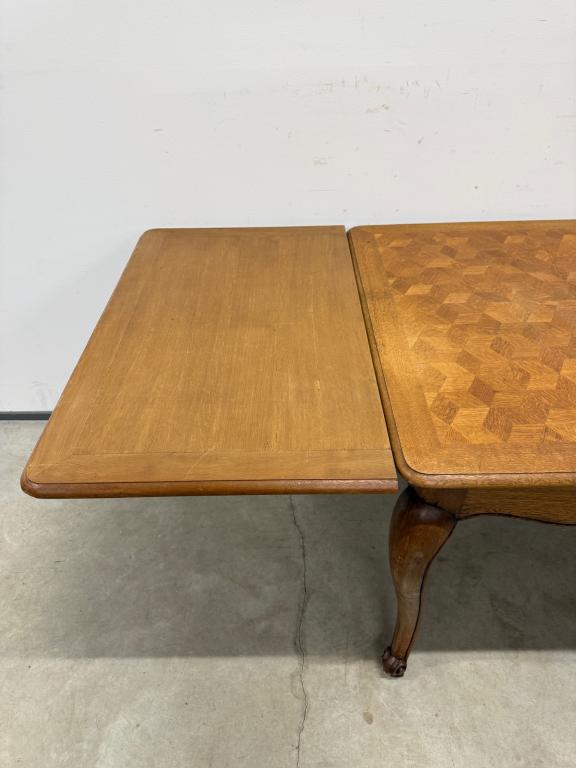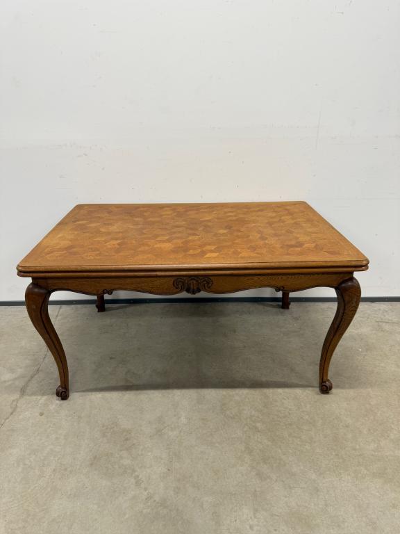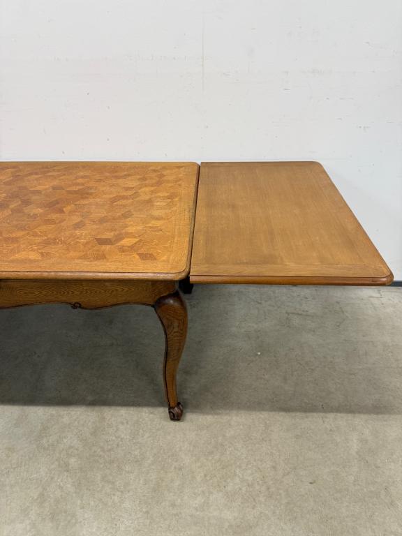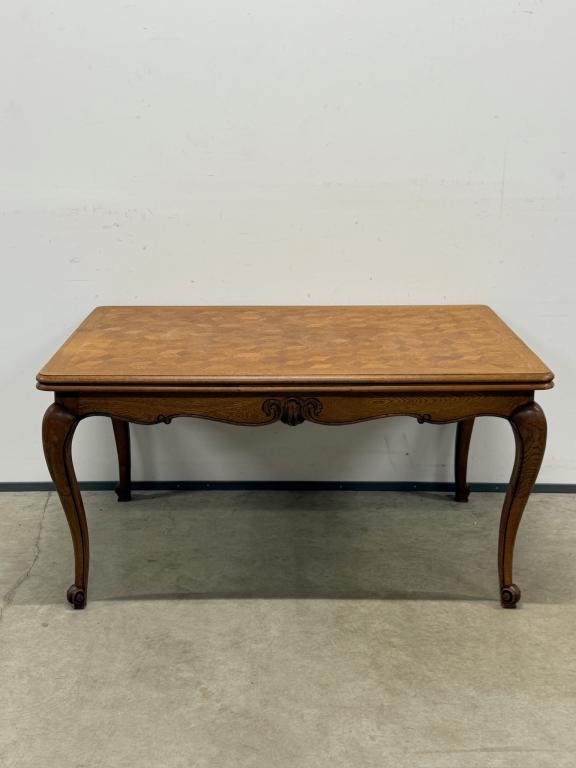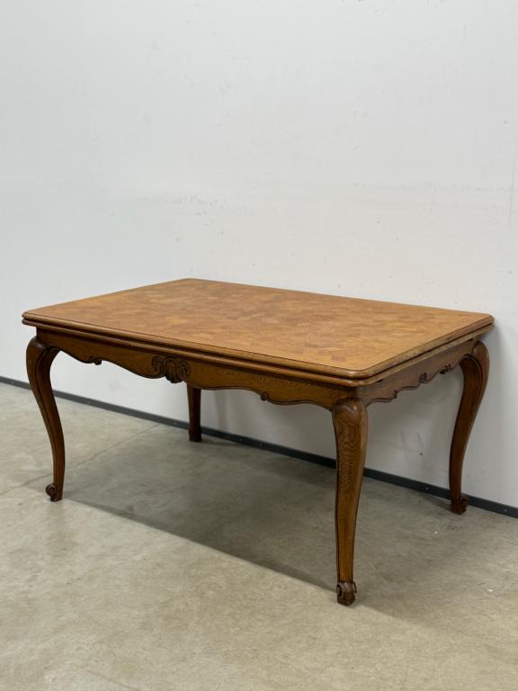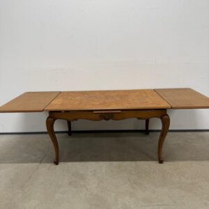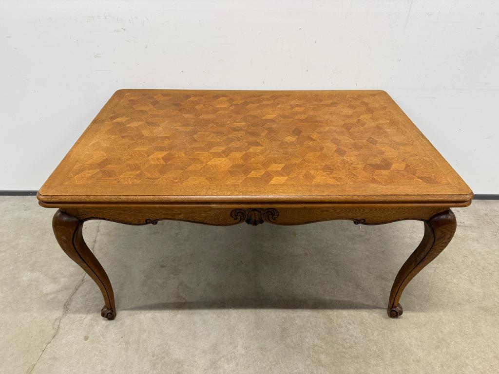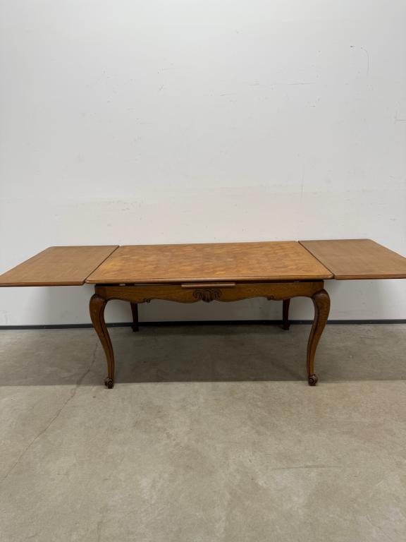 Kulumis- ja kasutusjälgedega pikendatav söögilaud. Laud on tammest raamiga, pealmine plaat spoonitud. Lauaplaadi laius 150 cm + 2 x 60 cm, lühema külje laius 100 cm.