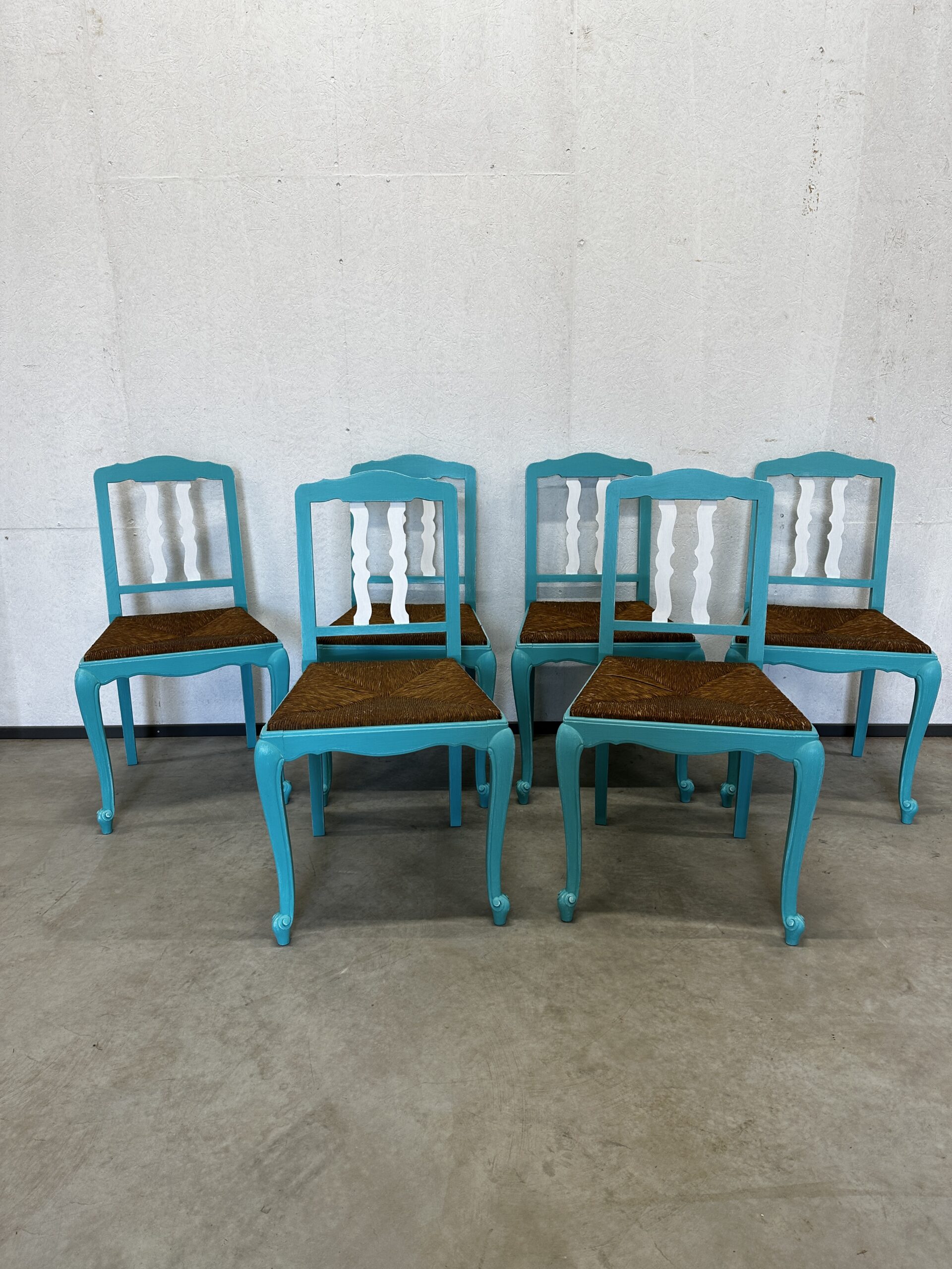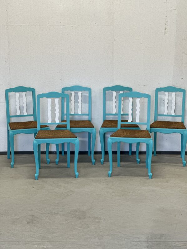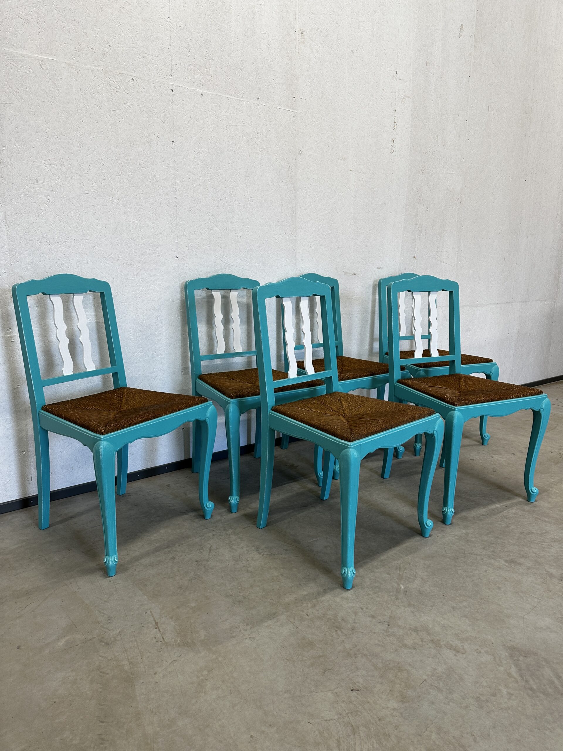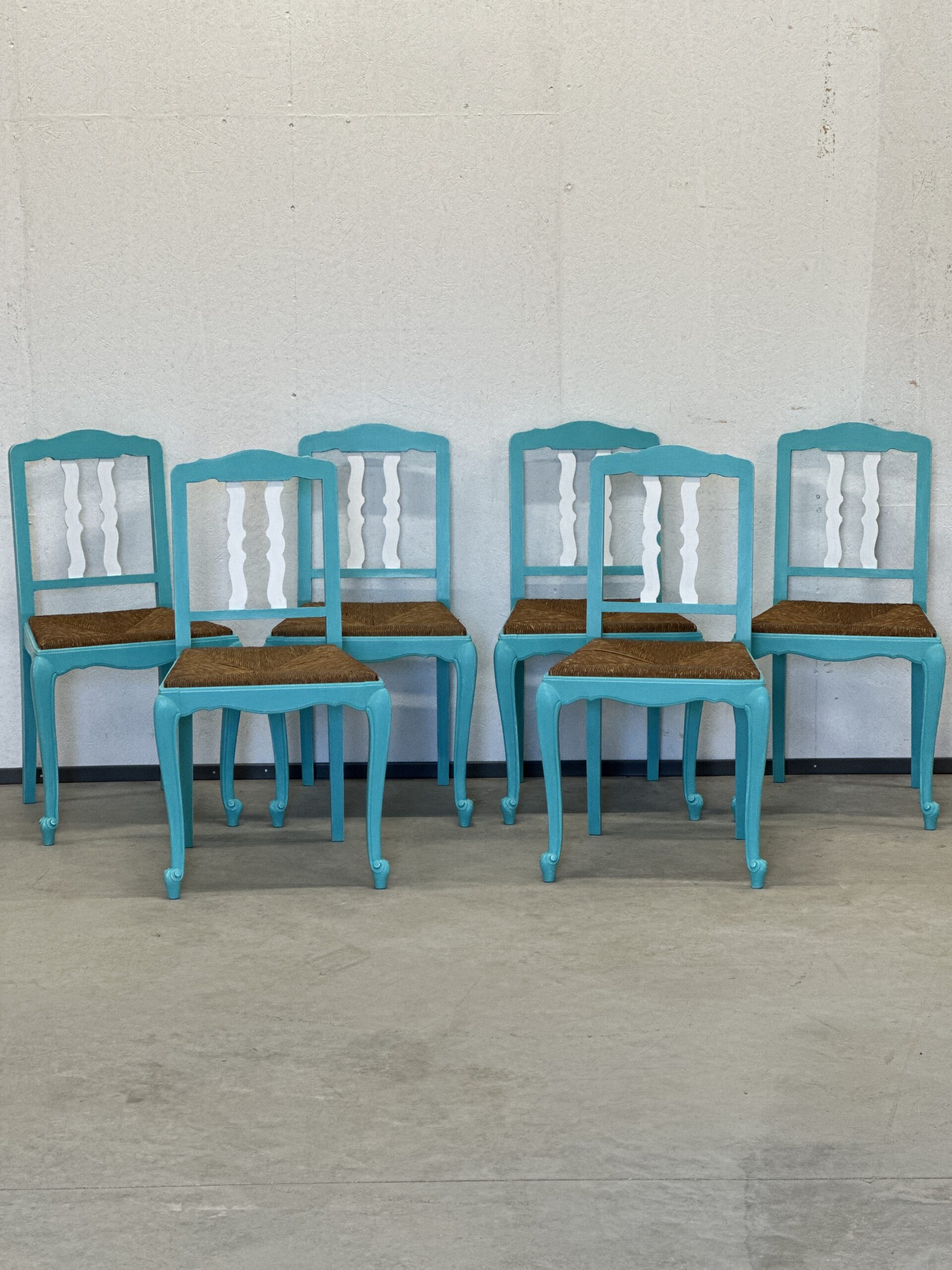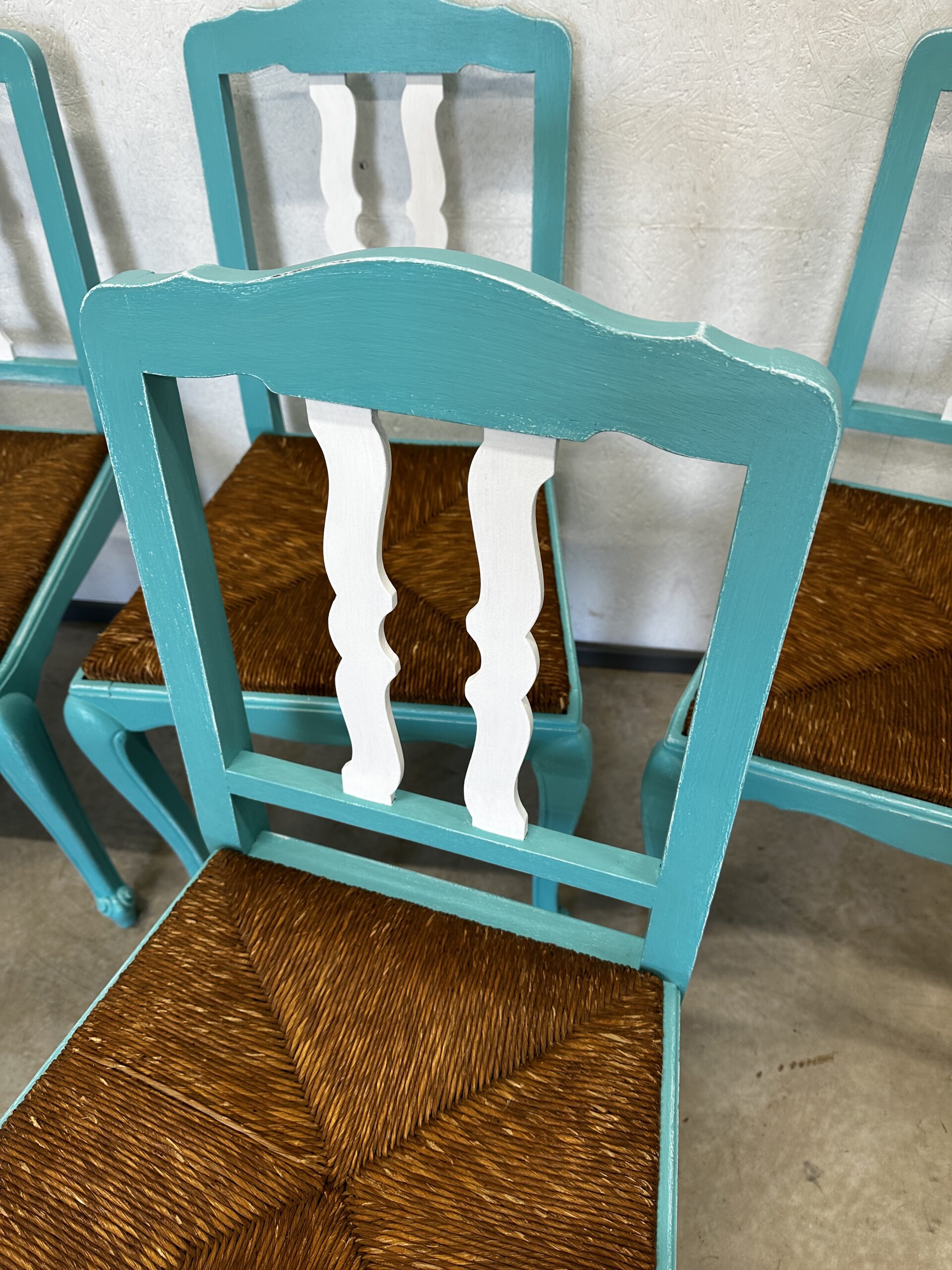 Uue viimistlusega tammest söögitoolid. Toolide raamid tugevad ja stabiilsed, põhjad punutisest. Värvitud Vintro kriidivärviga, toon Christabelle (türkiissinine). Müügil komplektina – 6 tk.