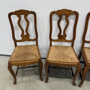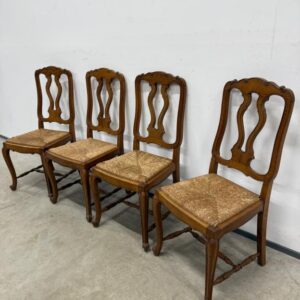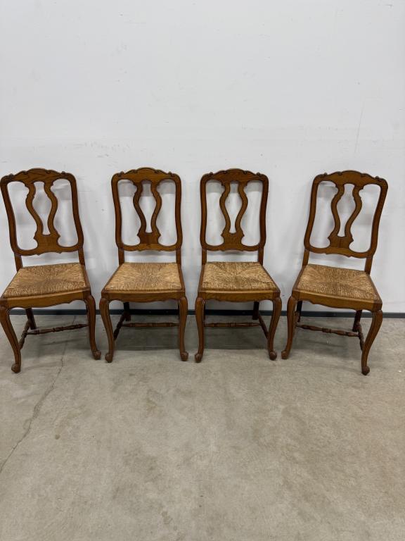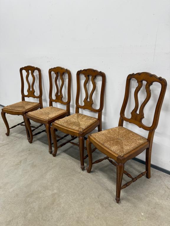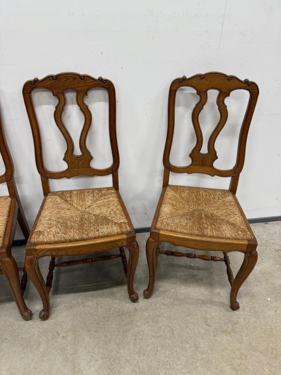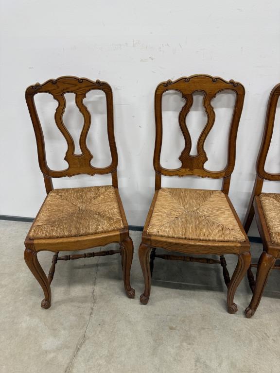 Neli tammest raamiga söögitooli. Raamid tugevad ja stabiilsed, kuid viimistluses leidub kulumis- ja kasutusjälgi. Müügil komplektina.