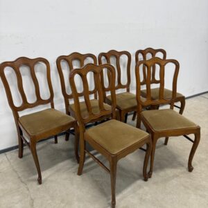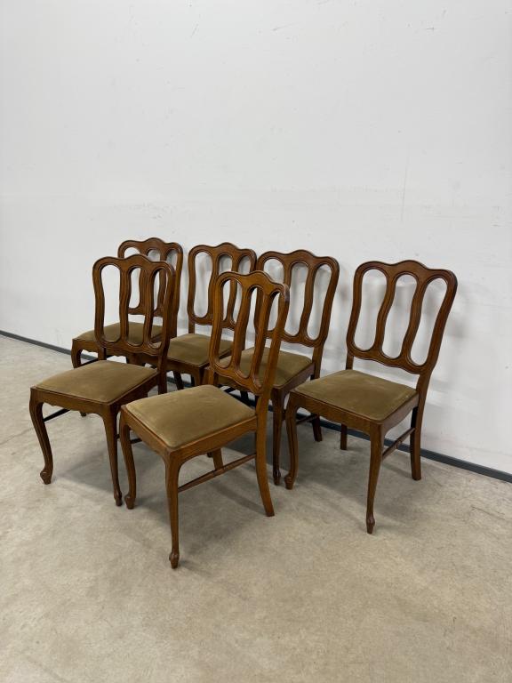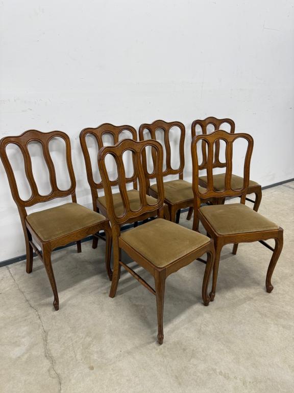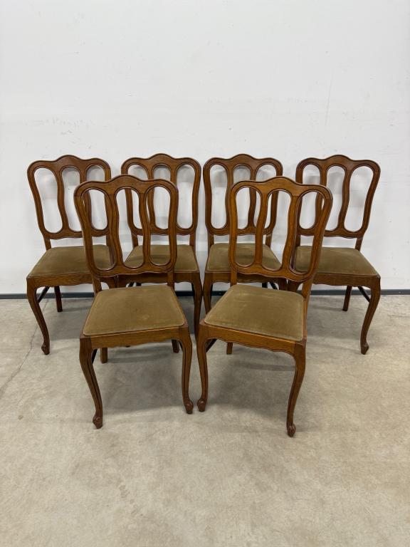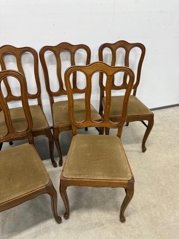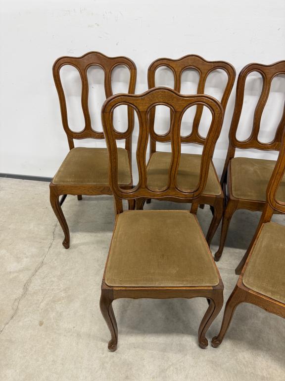 Tammest raamiga söögitoolide komplekt. Komplekti kuulub kuus söögitooli. Raamid tugevad ja stabiilsed, istumisosad kaetud sametise kangaga. Istumisosade polsterdus veidi vajunud, kuid kenasti kasutatav. Müügil komplektina.