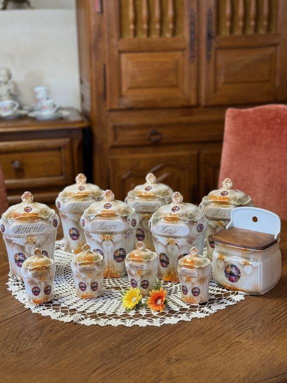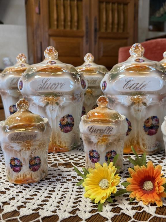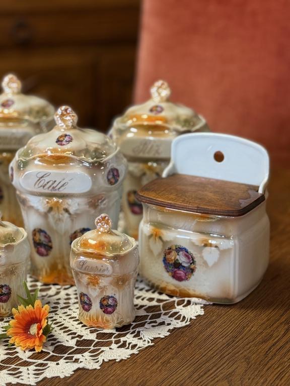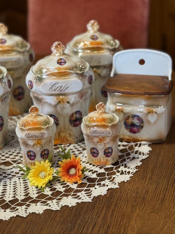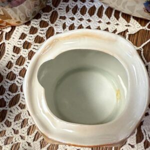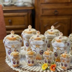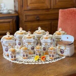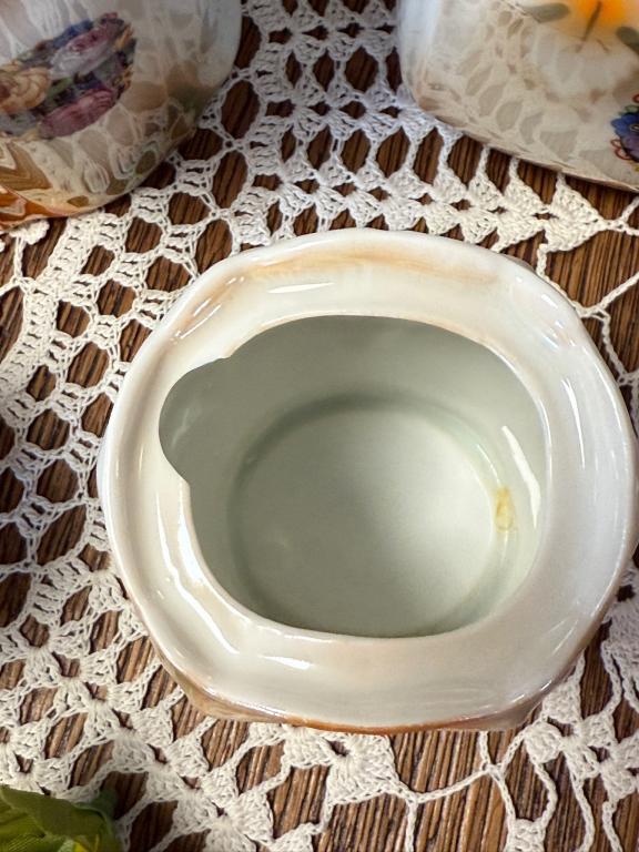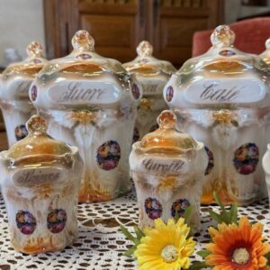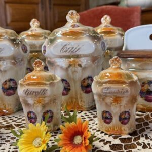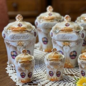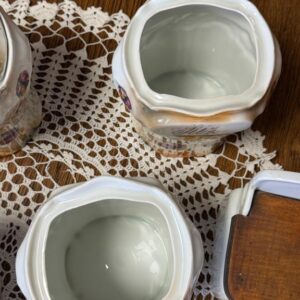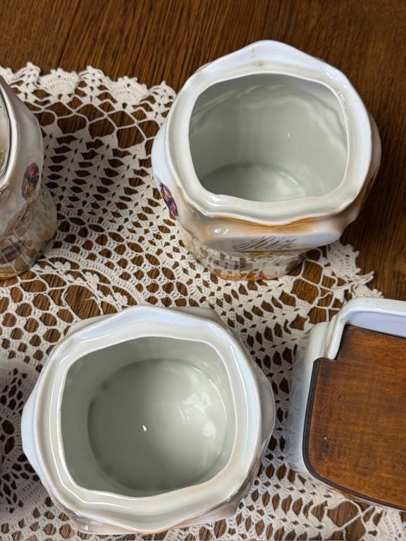 Pärmutterviimistlusega portselanist topside komplekt. Kaunid ja pilkupüüdvad. ühe väikse topsi sisemises servas killuviga – vt pilt. Teised esemed korralikud.