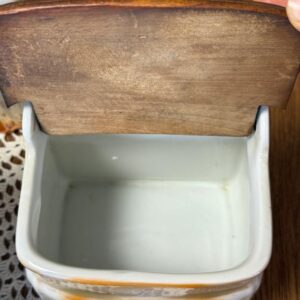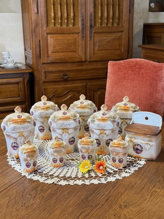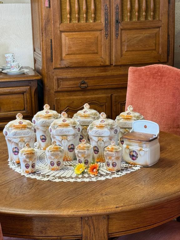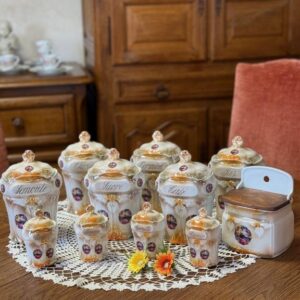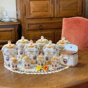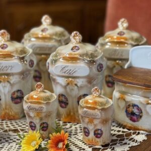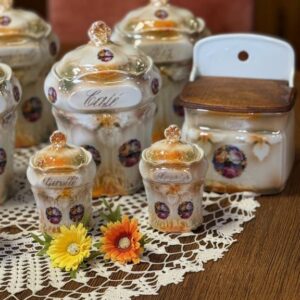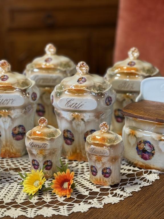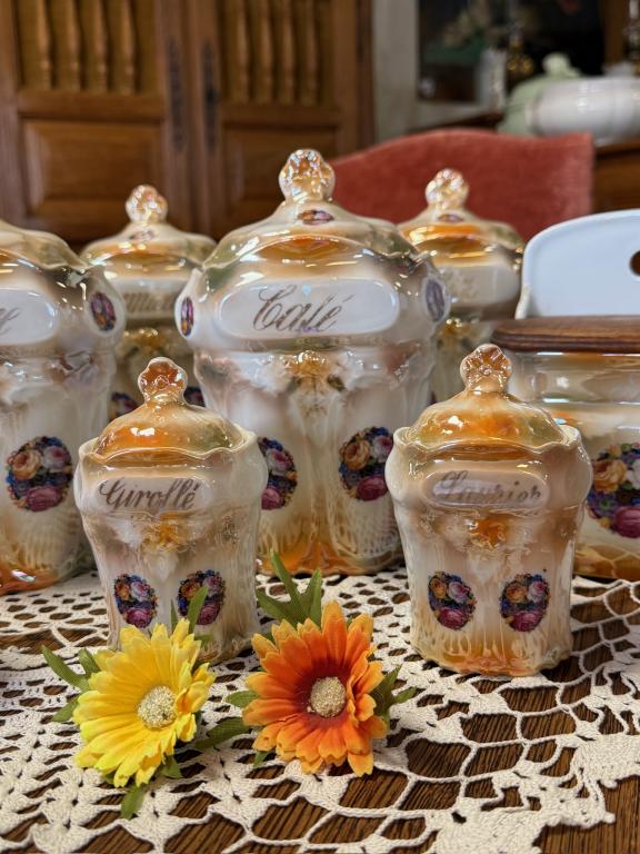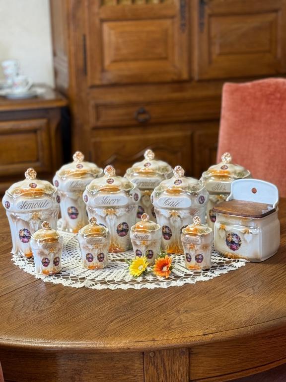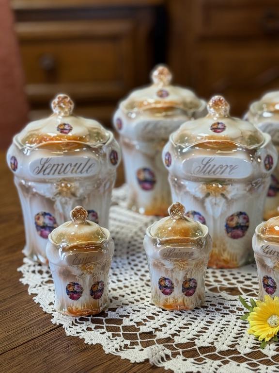 Pärmutterviimistlusega portselanist topside komplekt. Kaunid ja pilkupüüdvad. ühe väikse topsi sisemises servas killuviga – vt pilt. Teised esemed korralikud.