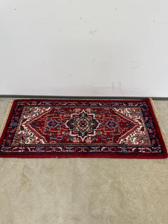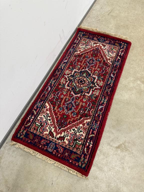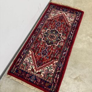Käsitsi kootud väike villavaip. Veidi kulumist servas, kerge kopituse lõhn.