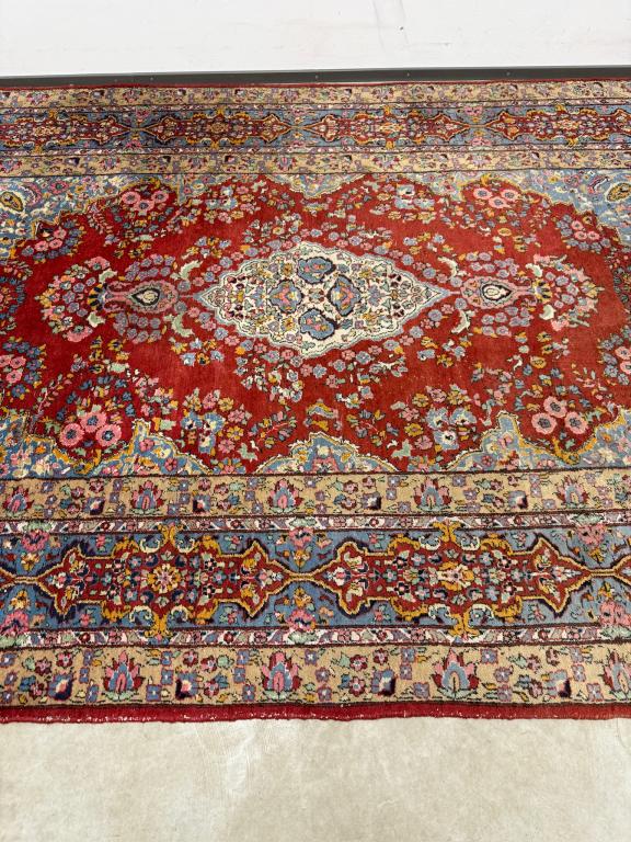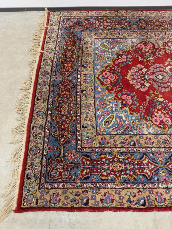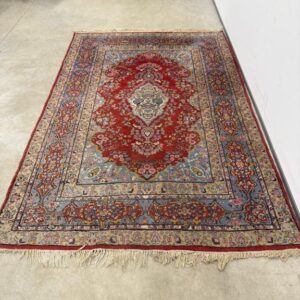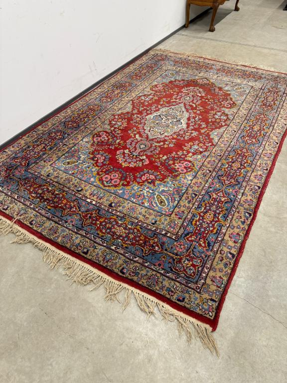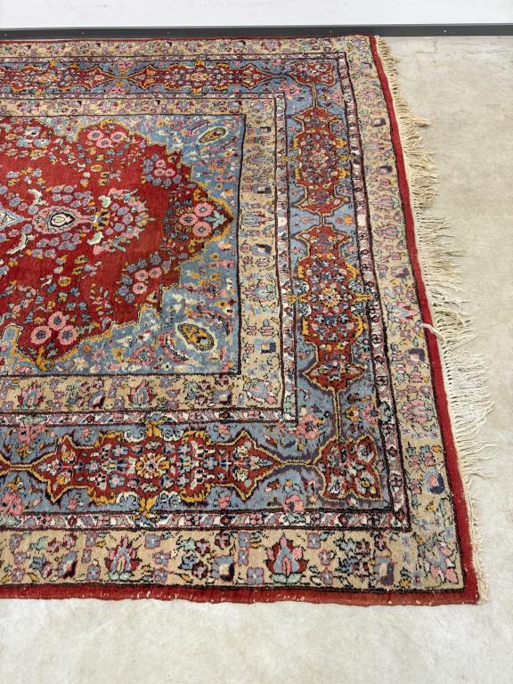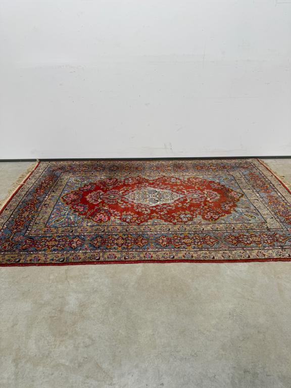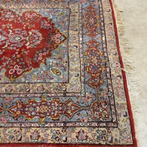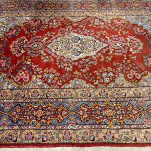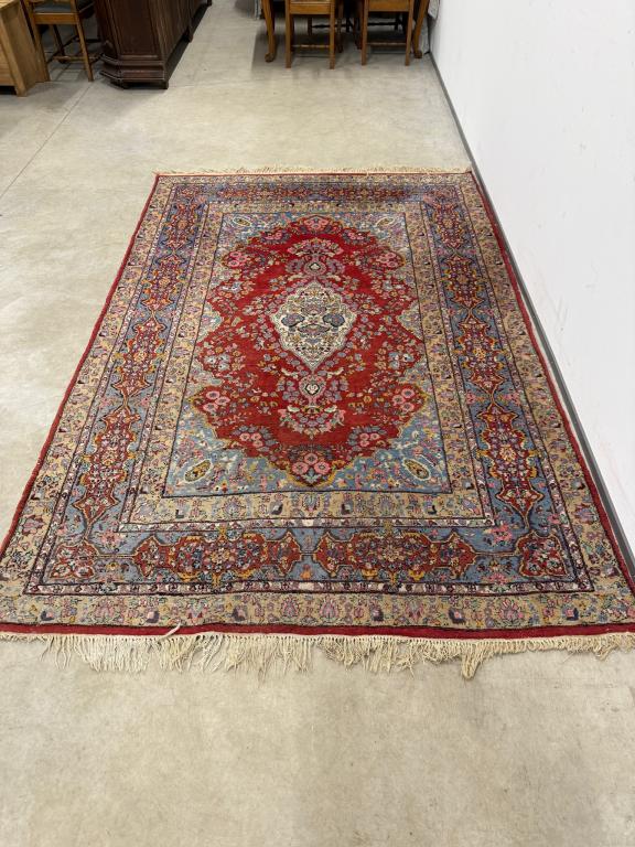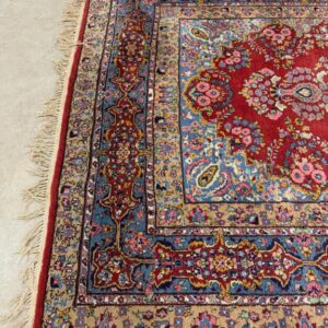 Hea suurusega käsitsi kootud villavaip. Kena muster, selged toonid. Vaip on kulunud ja vajab puhastust.