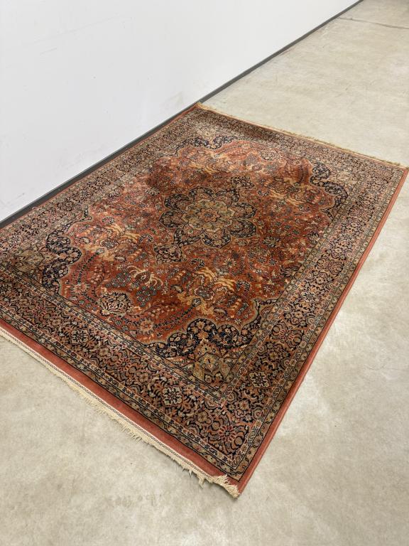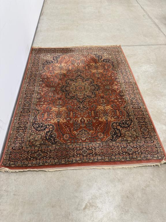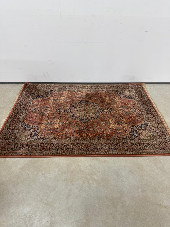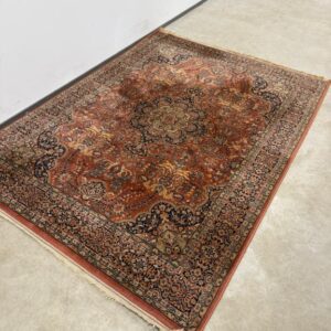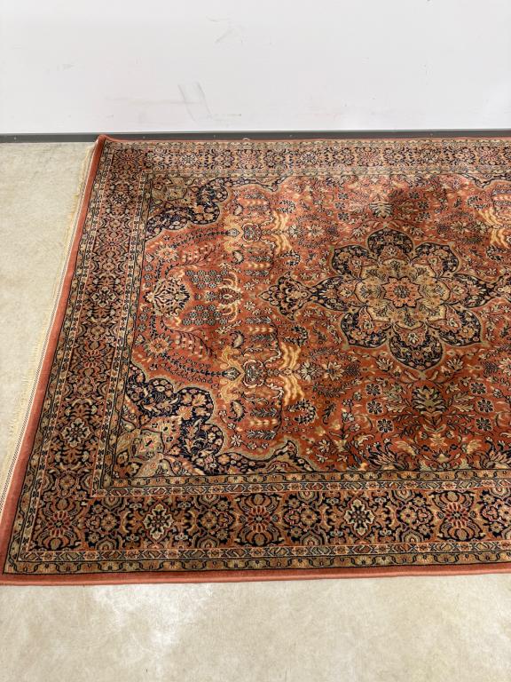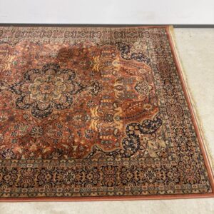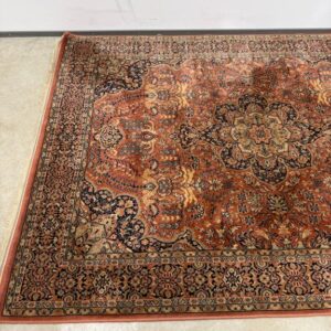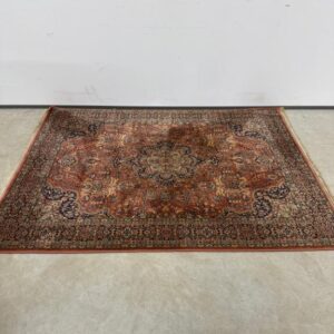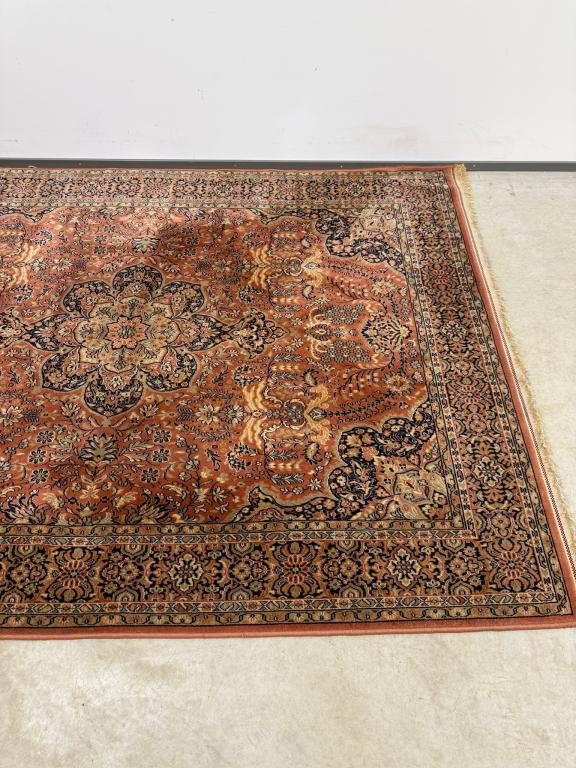 Roosa põhitooniga väiksem villavaip. Kulumist ie tähelda, kuid vajab puhastust.