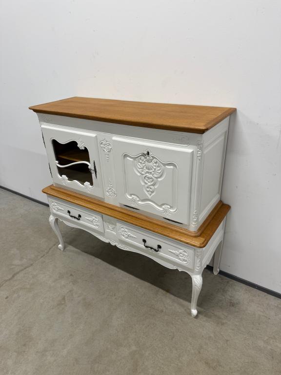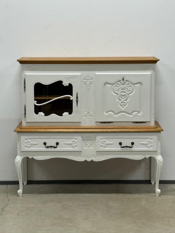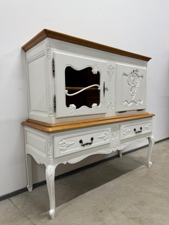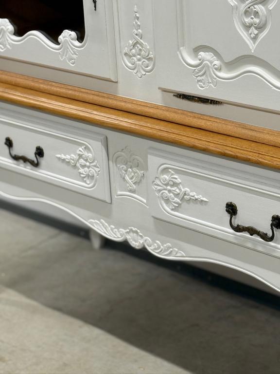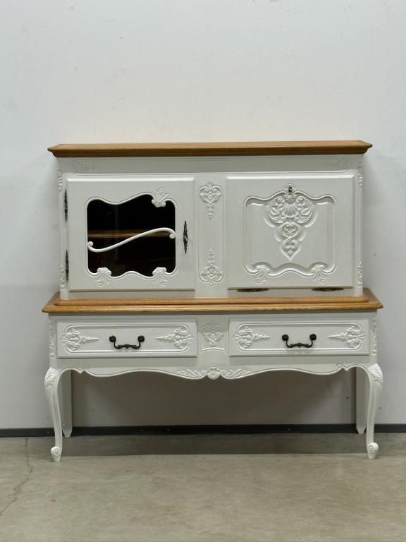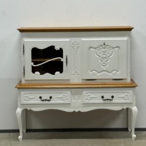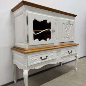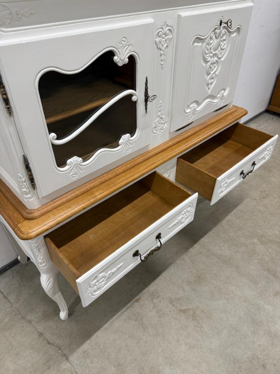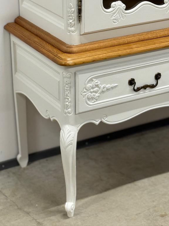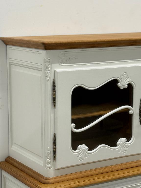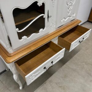 Uue viimistlusega tammest raamiga vitriinkapp. Värvitud Vintro kriidivärviga, toon Pearl (antiikvalge). Lukud töökorras, võtmed olemas. Transport kahes osas.