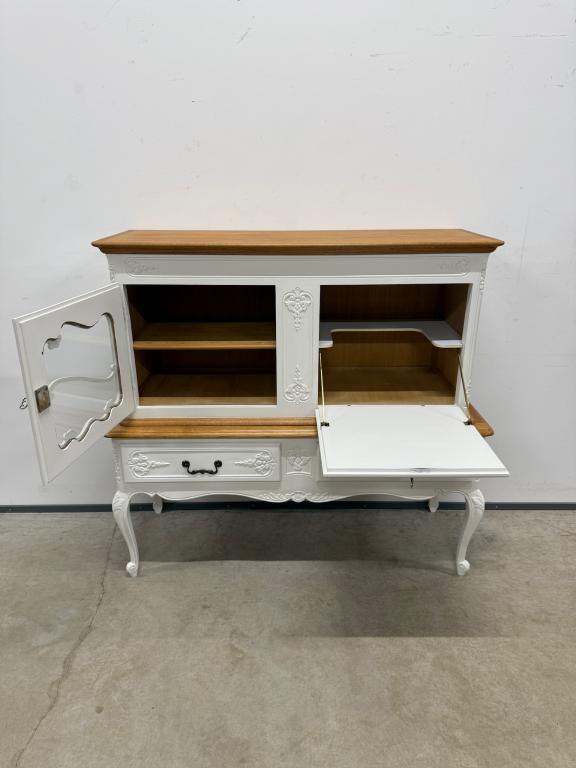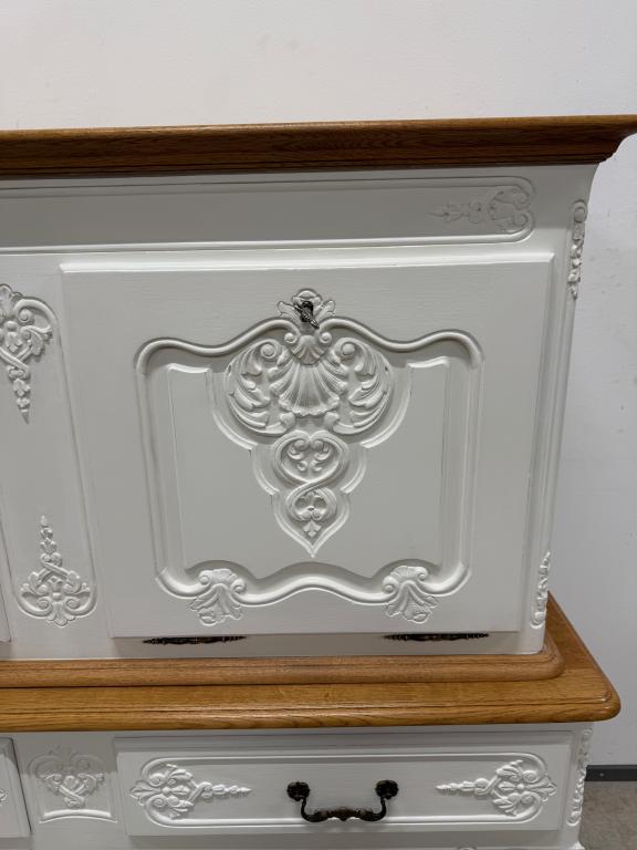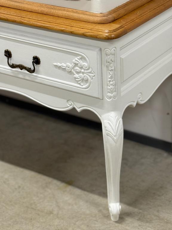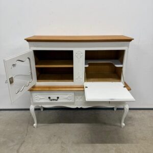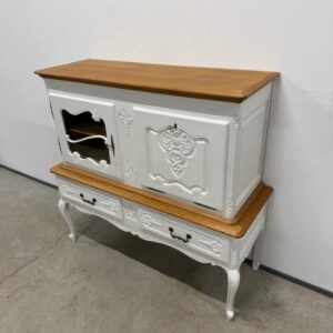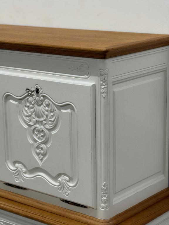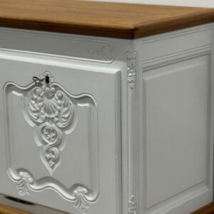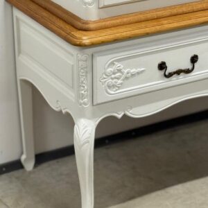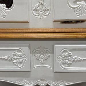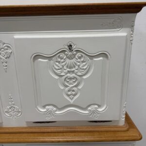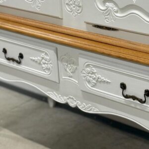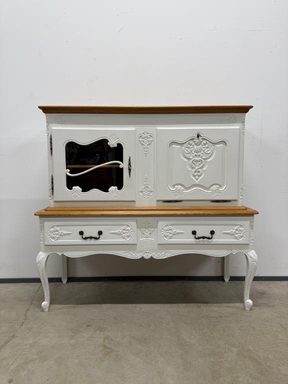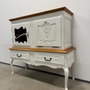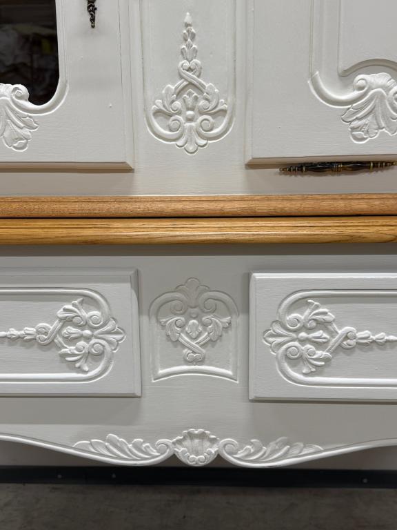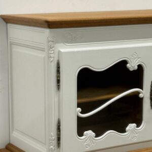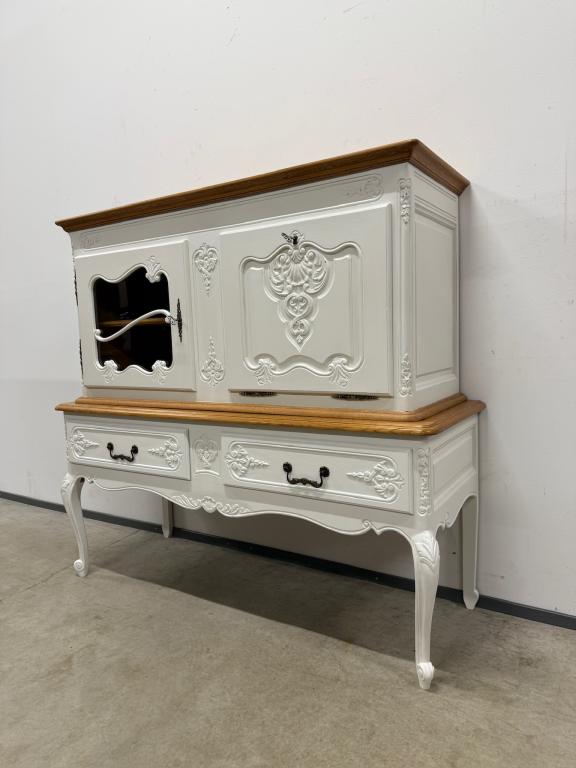 Uue viimistlusega tammest raamiga vitriinkapp. Värvitud Vintro kriidivärviga, toon Pearl (antiikvalge). Lukud töökorras, võtmed olemas. Transport kahes osas.