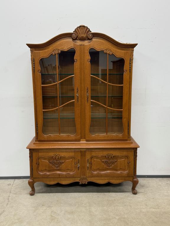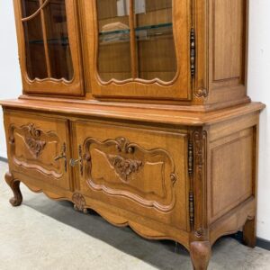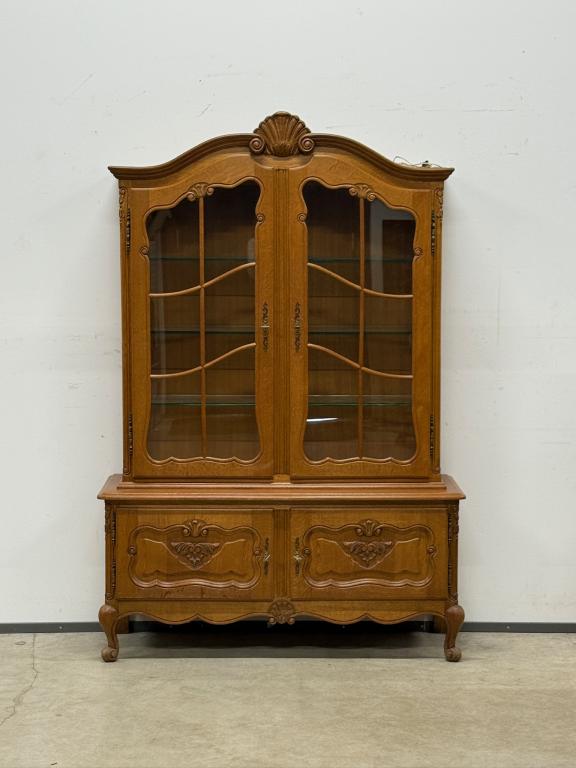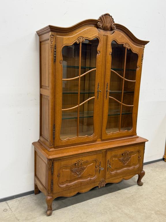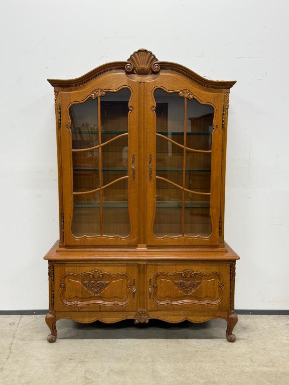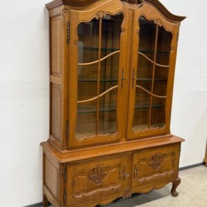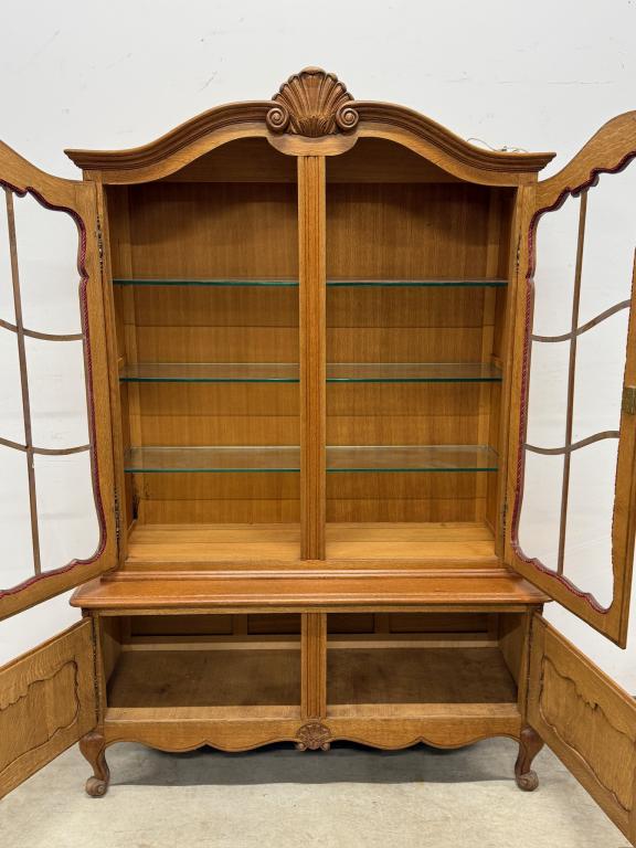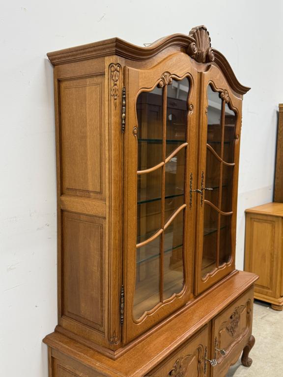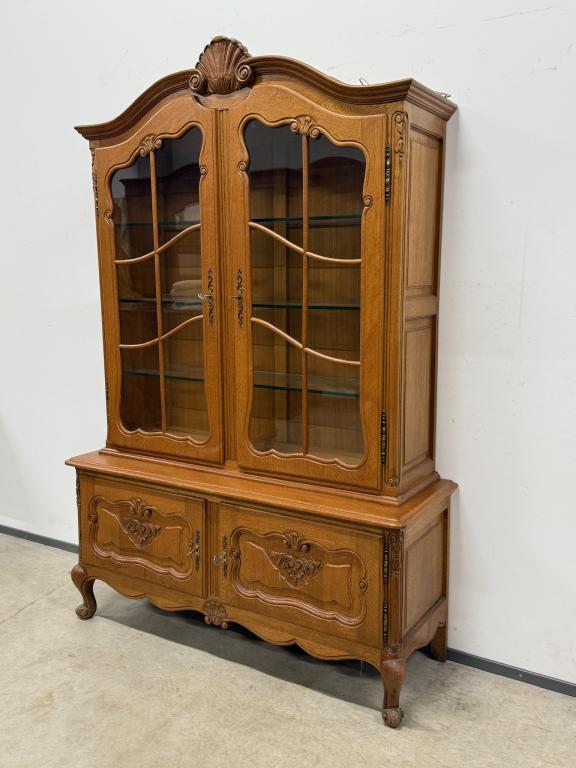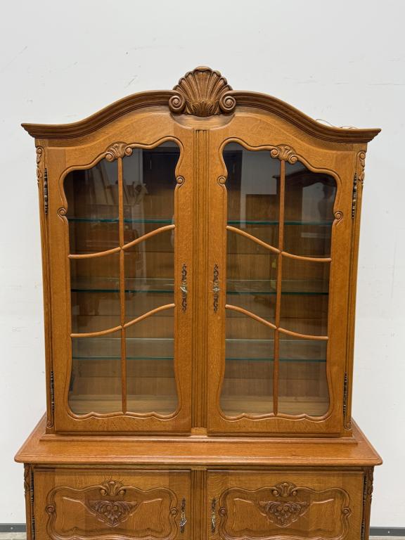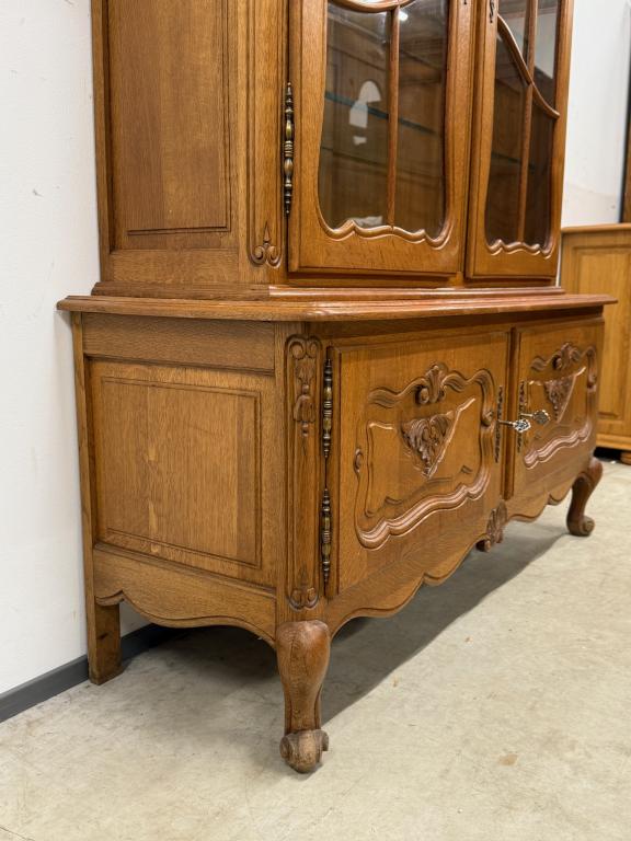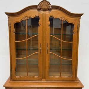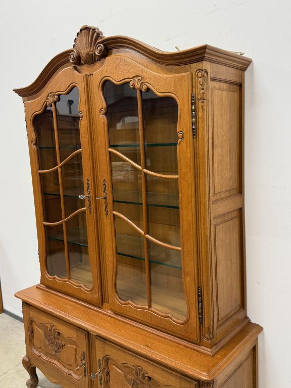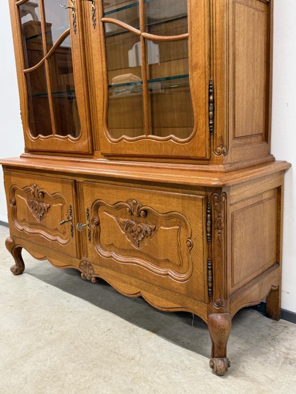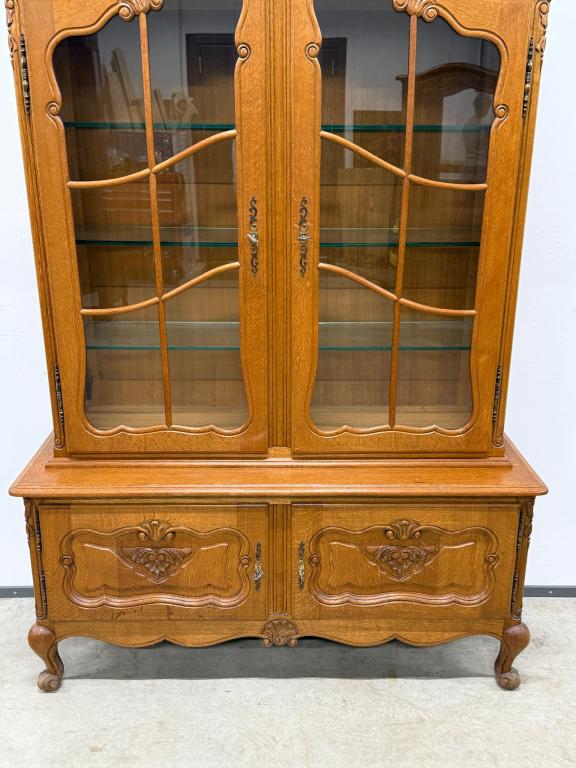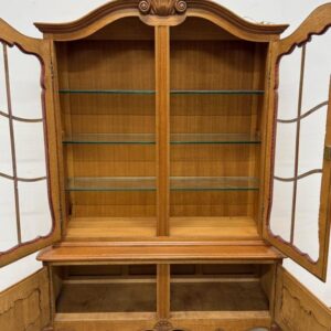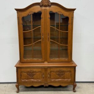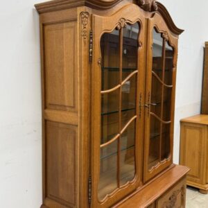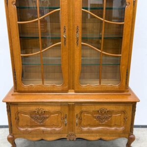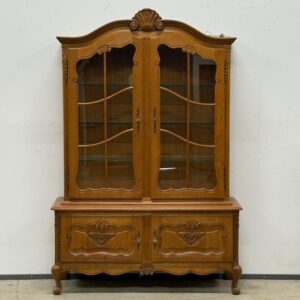 Ilusate nikerdustega tammest raamiga vitriinkapp. Sees kolm paksust klaasist riiulit. Olemas ka valgustus. Lukud töökorras, võtmed olemas. Leidub väiksemaid kulumis- ja kasutusjälgi, kuid üldmulje korralik. Transport kahes osas.