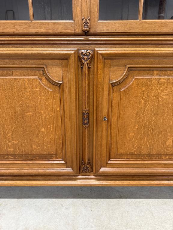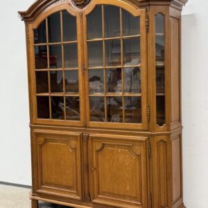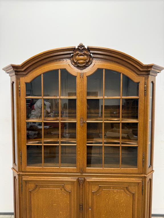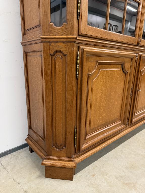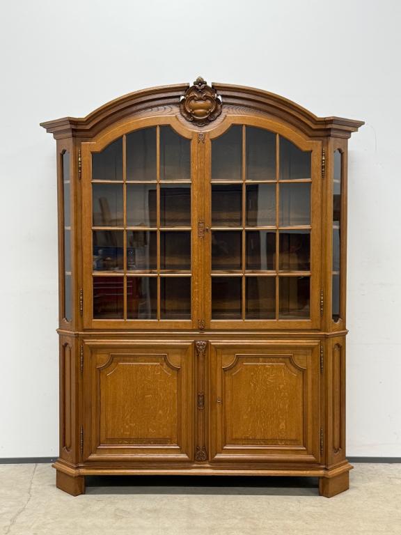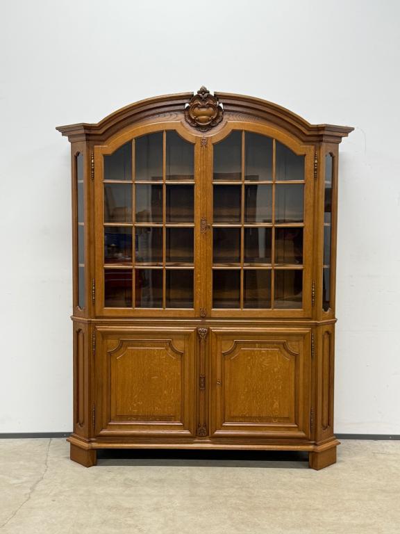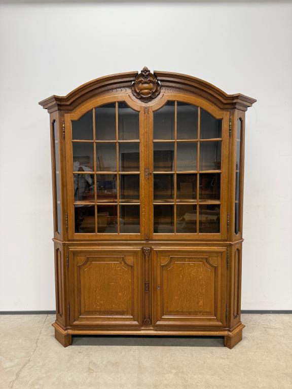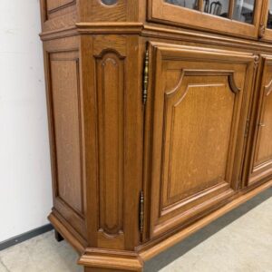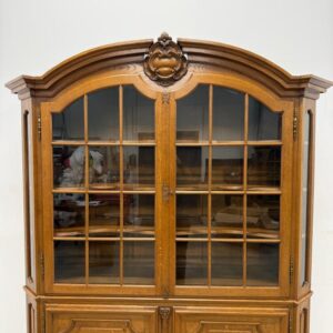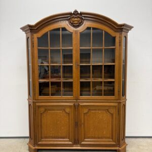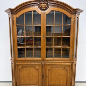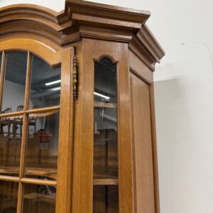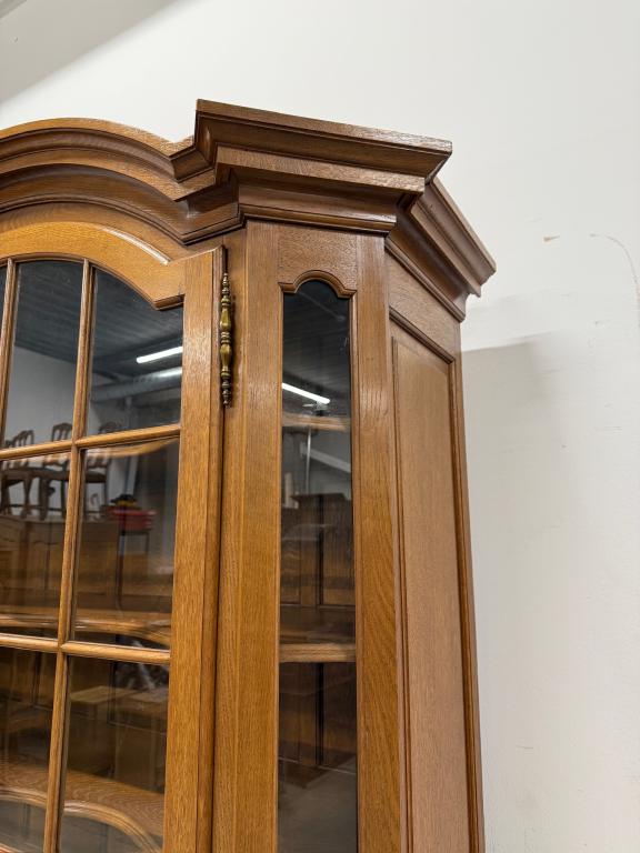 Uhke ja äärmiselt mahukas tammest vitriinkapp. Sees kauni loogelise servaga ning taldrikurandiga tammest riiulid. Lukk töökorras, võti olemas. Suurepärases seisukorras. Transport kahes osas.