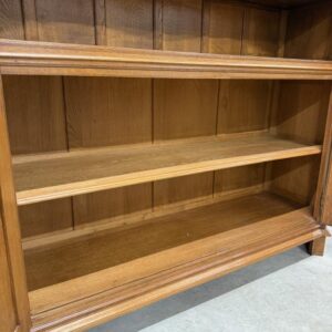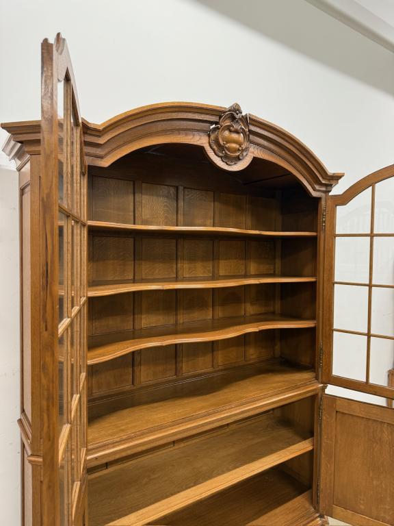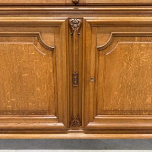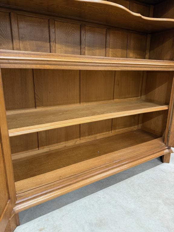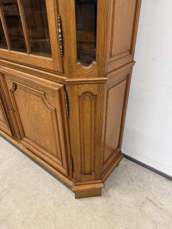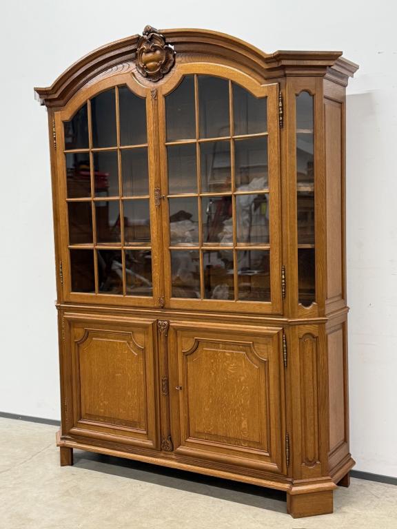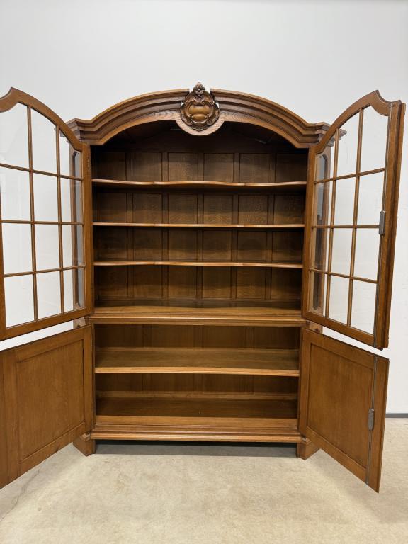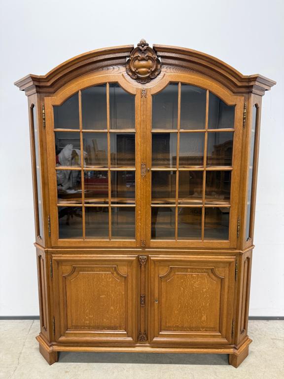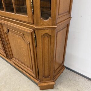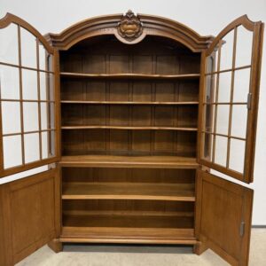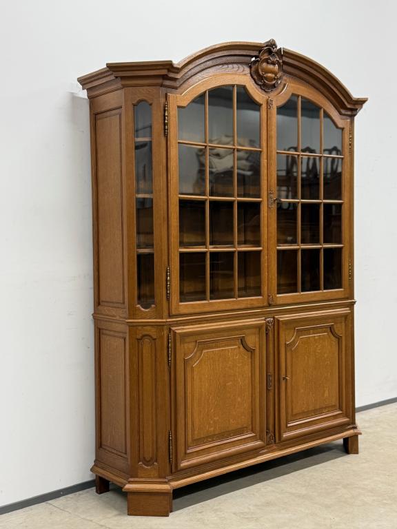 Uhke ja äärmiselt mahukas tammest vitriinkapp. Sees kauni loogelise servaga ning taldrikurandiga tammest riiulid. Lukk töökorras, võti olemas. Suurepärases seisukorras. Transport kahes osas.