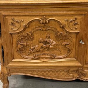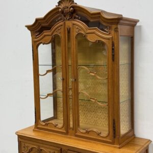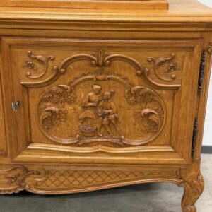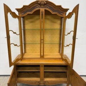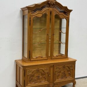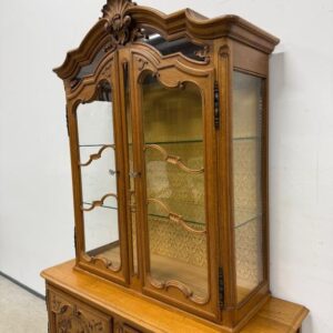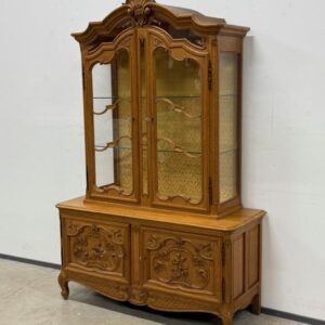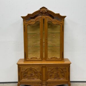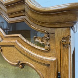 Tõeliselt pilkupüüdev ja kaunis tammest vitriinkapp. Romantiliste motiividega nikerdused ustel, kaunis vorm. Sees paksust klaasist riiulid. Lukud töökorras, võtmed olemas. NB! ülemises kapiosas olevast klaasist väike tükk ära murdunud – vt pilt. Kasutamist ei sega ja silma ei paista. Transport kahes osas.