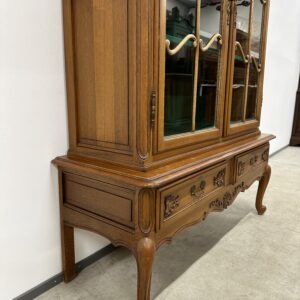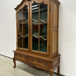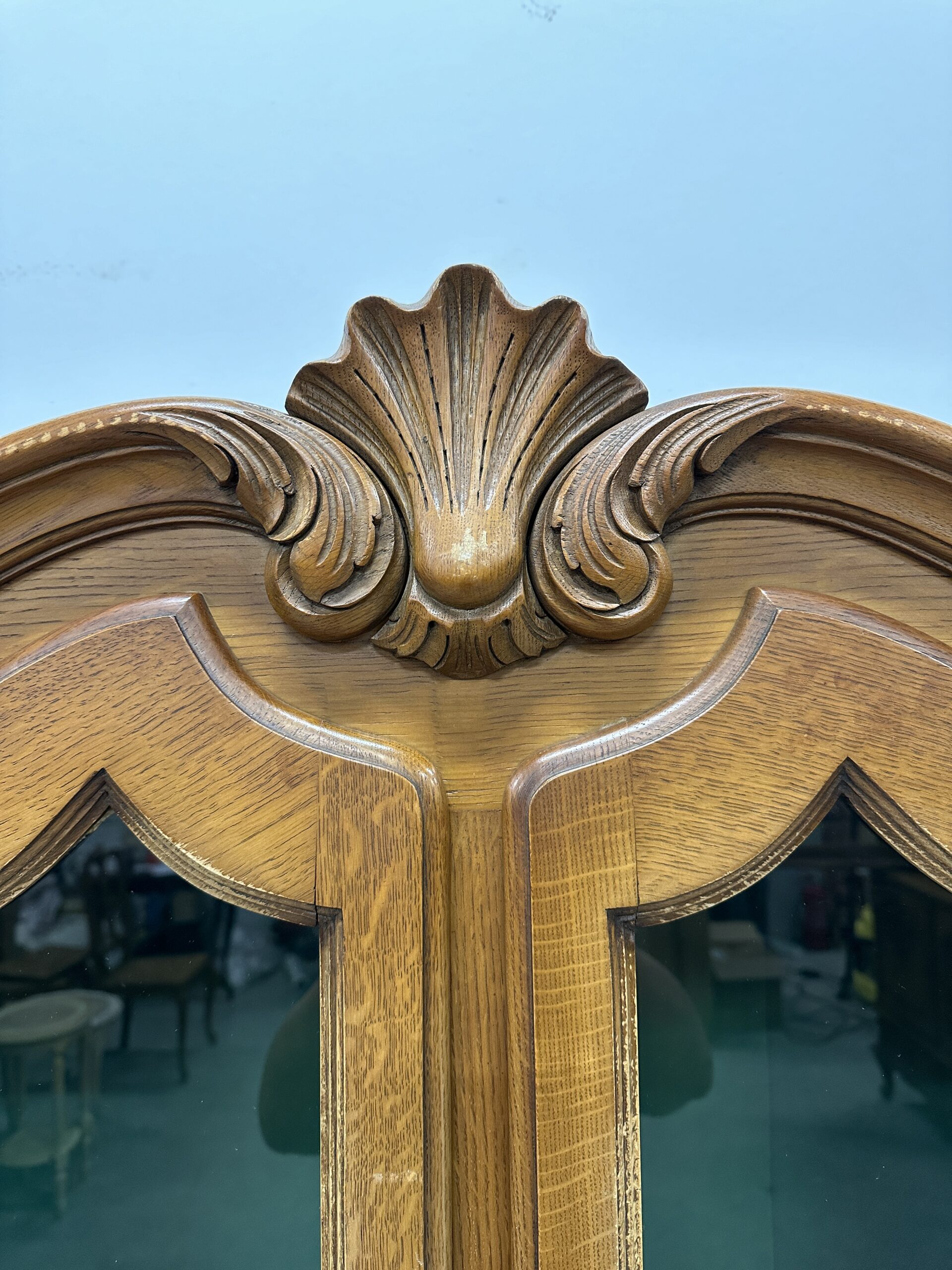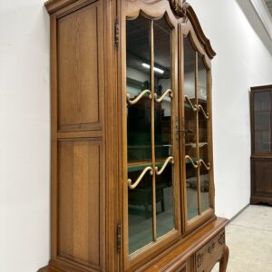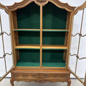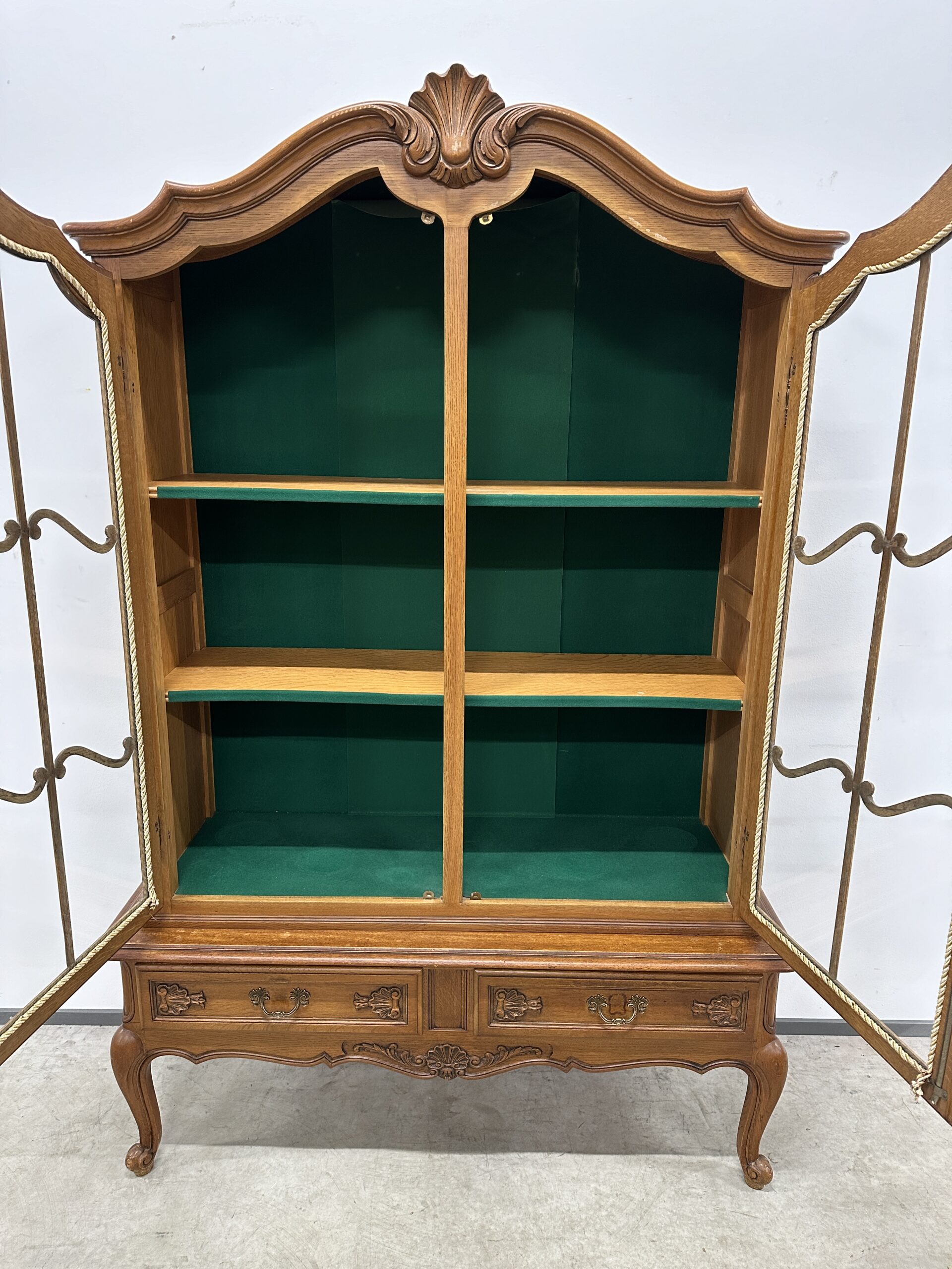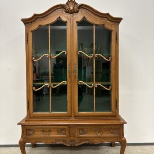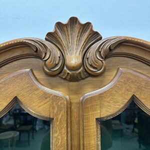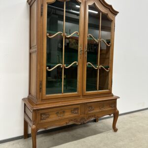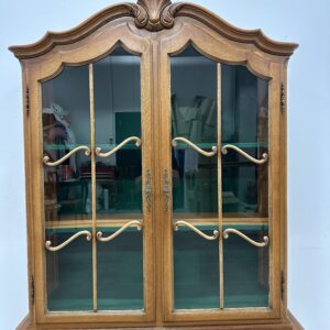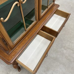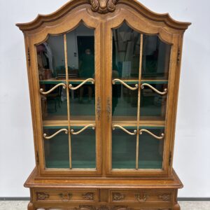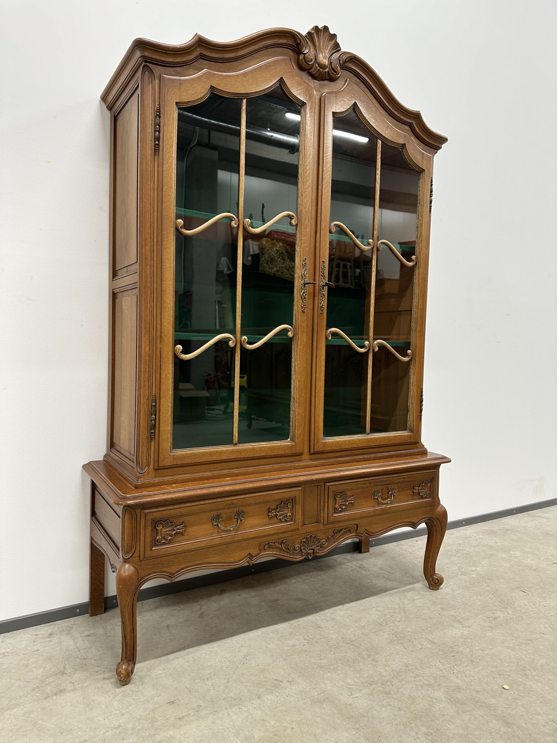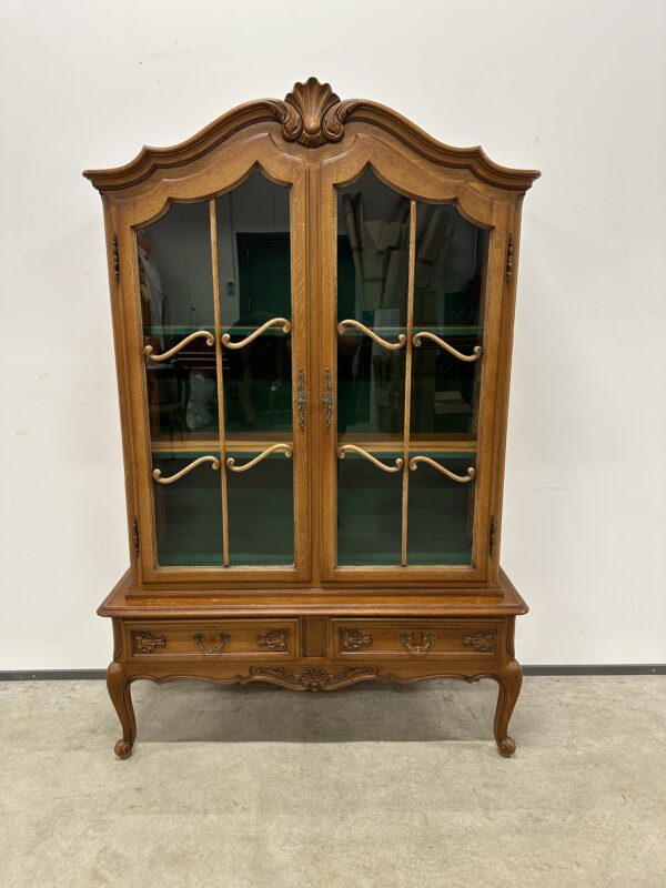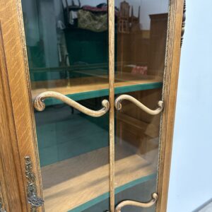 Rohekate klaasidega tammest raamiga vitriinkapp. Kauni joonega, ilusad nikerdused raamil ja sahtlipaneelidel. Lukk töökorras, võti olemas. Trasnport kahes osas. Leidub kulumis- ja kasutusjälgi, kuid üldmulje korralik.