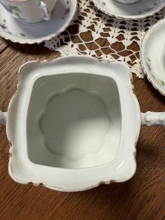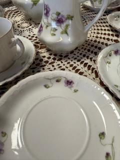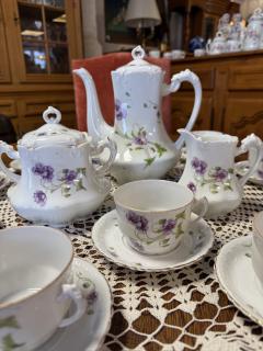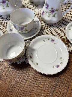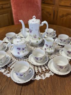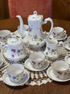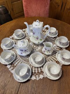 Kauni vormiga sajandivanune portselanist kohviserviis. Tootjamarkeering puudub. NB! Kohvikannu ülaservas killuviga, vt pilt, muus osas kann terve ning väga hästi kasutatav. Suhkrutoosi servas samuti killuviga ning põhjas mõra, toos siiski väga hästi kasutatav. Tasse/alustasse kokku kümme. Üheksa neist veatud, kümnes tass õrna juusmõraga servas. Kaunis ja väärikas komplekt. Portselan õhkõrn ja läbikumav.