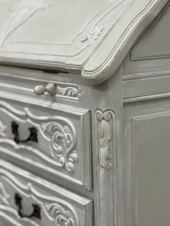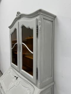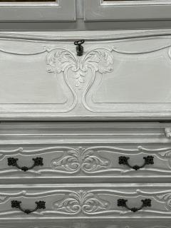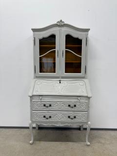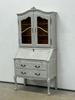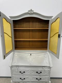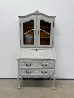 Efektne raamatukapiga sekretärkapp. Sees reguleeritavate vahedega puidust riiulid, luugi taga väiksed sahtlid ja riiulid. Kapp on helehalli värvi, kulutatud moega. Kaunis ja pilkupüüdev. Transport kahes osas.