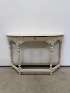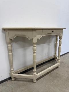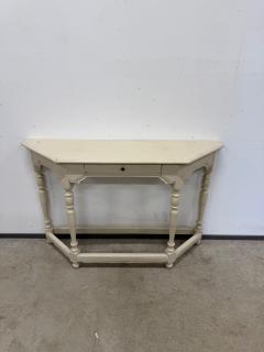 Kena vormiga tammest konsoollaud, mis mahub kenasti ka kitsasse ruumi. Laud on värvitud kreemikaks, pealmisel plaadil plekk - vt pilt.